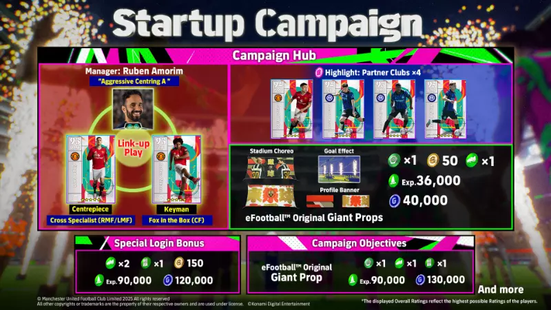 We will be running a special campaign to celebrate the new eFootball™ season kickoff. Try the new Link-up Play feature and take the synergy between your players and manager to the next level. Earn special rewards including Stadium Elements to decorate your home stadium and Profile Banners that you can show off during matches. These new features and elements will add even more fun to the game! Have a Go at the New Manager Skill "Link-up Play"! As a campaign reward, get manager Ruben Amorim, who comes with the new Link-up Play skill "Aggressive Centring A". To use a Link-up Play and activate a manager's special skill, select a Centrepiece and Key Man who meet the designated conditions. In this campaign, we're giving away Manchester United players who meet the activation conditions for Aggressive Centring A! Put this new tactic right to the test! Introducing a Brand-new Feature: the Campaign Hub! Earn rewards in the Campaign Hub by playing PvP or VS AI matches during the designated period and then advancing a certain number of Spaces. (Any progress in Exhibition, Training or Skill Up modes does not apply.) Complete matches and earn rewards to further bolster your Dream Team! Period 14/08/2025 02:00 (UTC) - 04/09/2025 01:59 (UTC) Advance 30 Spaces to earn the following rewards. ・ Manager: Ruben Amorim (Aggressive Centring A) ・ Highlights: Diogo Dalot, Joshua Zirkzee. ・ Stadium Elements (7 types) ・ Profile banners (2 types) ・ "Highlight: Partner Clubs" Chance Deal x4 ・ Random Booster Token x1 ・ Random Skill Token x1 ・ 50 eFootball™ Coins ・ 36,000 Exp. ・ 40,000 GP Special Login Bonus Keep logging in during the campaign period and get the following reward in total! Period 14/08/2025 02:00 (UTC) - 04/09/2025 01:59 (UTC) *Login bonuses refresh every day at 02:00 (UTC). Rewards ・ 150 eFootball™ Coins ・ Random Skill Token x2 ・ Position Token x1 ・ 90,000 Exp. ・ 120,000 GP eFootball™ League Special Rewards To celebrate the launch of the new season, the Ranking Rewards for eFootball™ League (PvP Category) Phase 1 will feature Isco appearing as a Show Time player! Don't miss out on this limited-time special reward! Campaign Objectives Startup Take part in eligible Events and eFootball™ League, and aim to complete all Objectives! Period 14/08/2025 02:00 (UTC) - 04/09/2025 01:59 (UTC) We will be adding challenges during the times shown below. After the addition of new challenges, you will be able to complete all Objectives. Round 1: 21/08/2025 02:00 (UTC) Round 2: 28/08/2025 02:00 (UTC) Complete all Challenges and earn the following rewards in total. ・ Stadium Elements (Giant Props): eFootball™ GOAT Statue ・ Random Booster Token x1 ・ Position Token x1 ・ Random Skill Token x1 ・ 90,000 Exp. ・ 130,000 GP Check each individual Objective to see the completion conditions and rewards. *To check Objectives, go to [Home] > [Missions]. Special Tour Event Starter This is the best event for you to get a hang of how to play matches! Receive Rewards by collecting Event Points while playing against the AI. Accumulate 10,000 points and earn the following rewards. ・ 5★ Nominating Contract x1 ・ 4★ Nominating Contract x1 ・ Random Booster Token x1 ・ Position Token x1 ・ Random Skill Token x1 ・ 50 eFootball™ Coins ・ 120,000 Exp. ・ 100,000 GP Period 14/08/2025 02:00 (UTC) - 04/09/2025 01:59 (UTC) *To join in the fun, go to [Home] > [Match] > [Event - VS AI]. Special Challenge Event Flexible This is a VS AI Event with the option to set the Match Level to suit your skill level. Complete Challenges to earn not only Main Rewards but Level Rewards based on your chosen Match Level as well. *If you decide to change your Match Level after completing a Challenge, the Challenge's status will be set to second time onwards. Period 21/08/2025 02:00 (UTC) - 04/09/2025 01:59 (UTC) *To join in the fun, go to [Home] > [Match] > [Event - VS AI]. Golden Goal Golden Goal Rule special Event! The match will end as soon as one side has scored a goal, with the goal-scoring side deemed as the winner. Period 28/08/2025 02:00 (UTC) - 04/09/2025 01:59 (UTC) Reward ・ 20,000 Exp. ・ Random Booster Token x1 *To join in the fun, go to [Home] > [Match] > [Event - PvP]. Notes *The schedule and details are subject to change without prior notice.