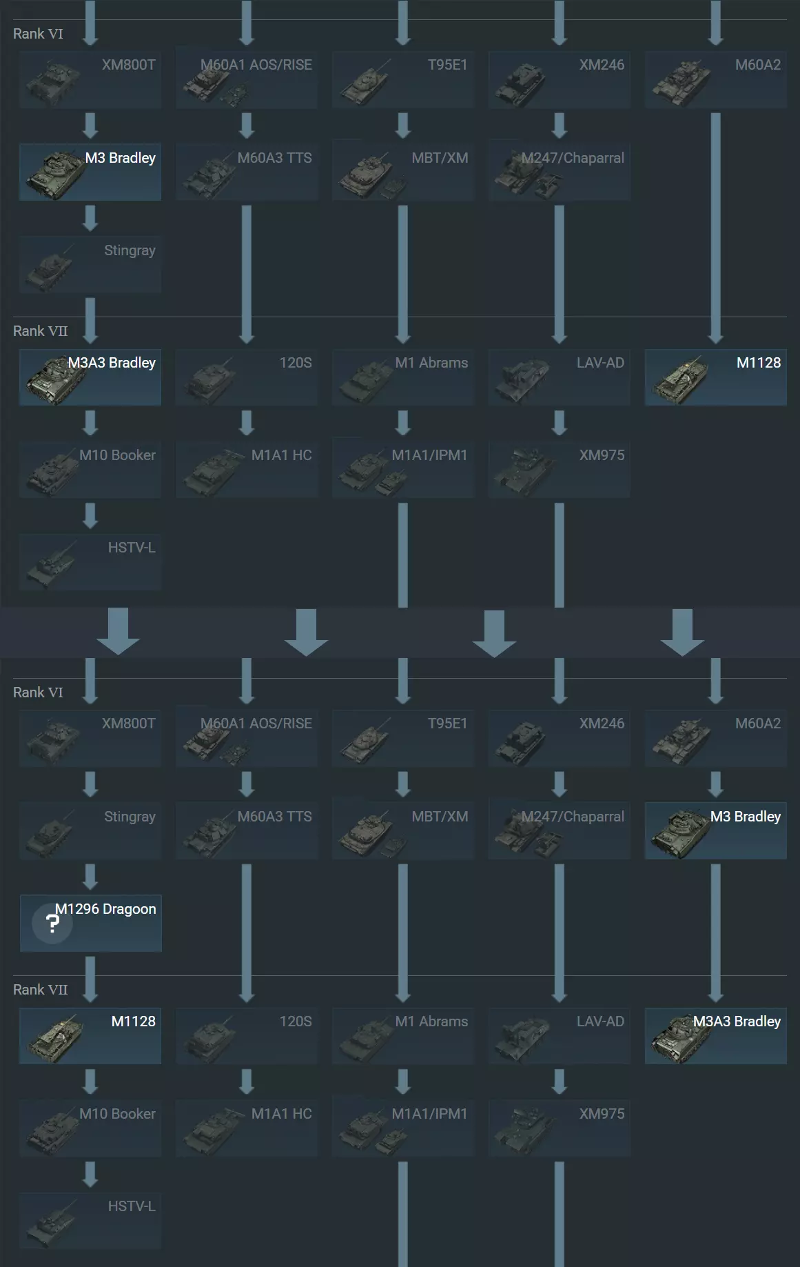 这些改动旨在优化科技树结构。游戏中受影响的载具已标记特殊图标。我们提前公布即将到来的改动,以便您能了解科技树的近期变化并规划研发路线。