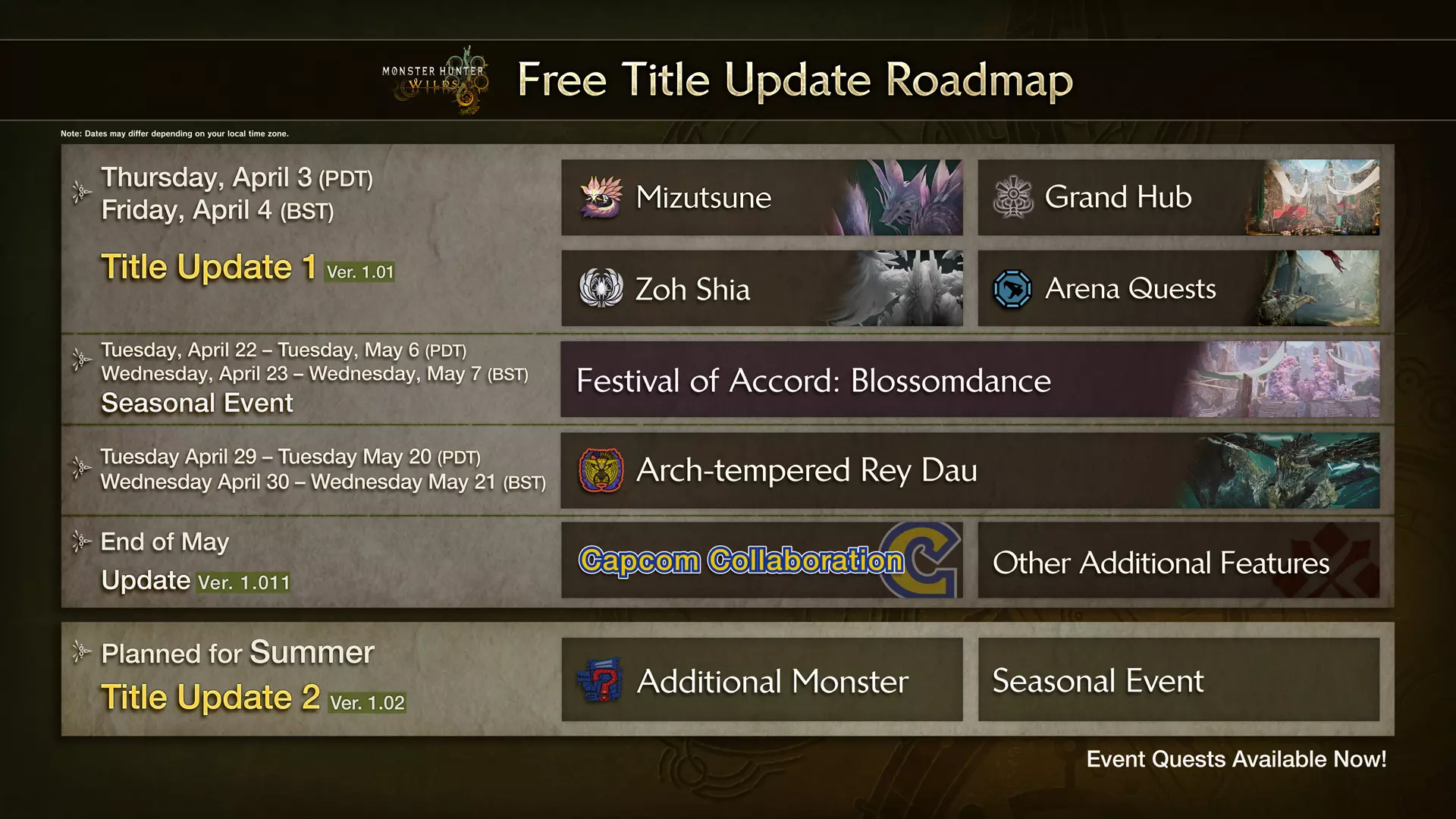 活动时间:4月23日-5月6日(UTC) 在季节性活动期间,大集会所的装饰和餐食会随季节变化,您还可以获得独特的装备、动作、营地装饰等! 除了季节性活动任务外,大部分过往的活动任务也将重新开放,请期待更多狩猎内容! 此外,计划在5月底推出与Capcom旗下作品的联动更新,以及其他新功能、调整和修复。之后,免费标题更新2预计于夏季前后发布。更多详情将很快公布,请持续关注获取更多信息!