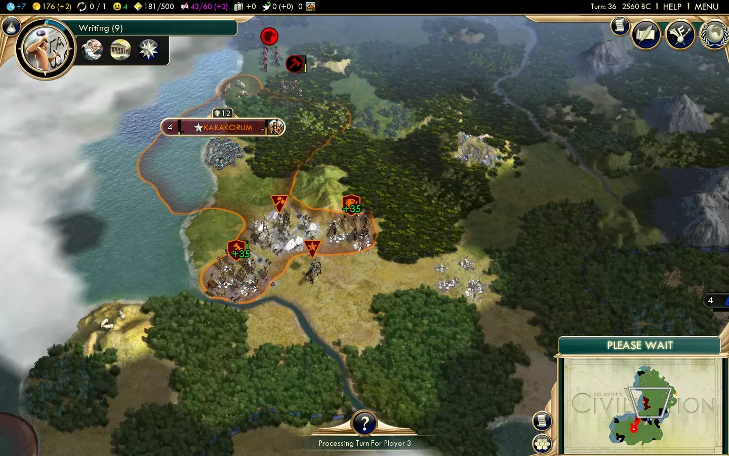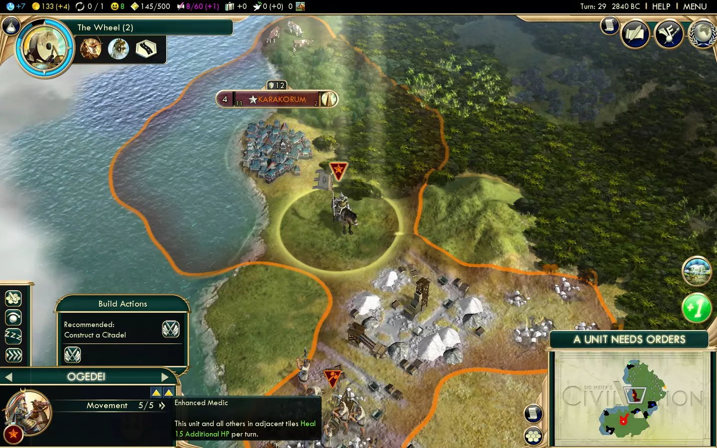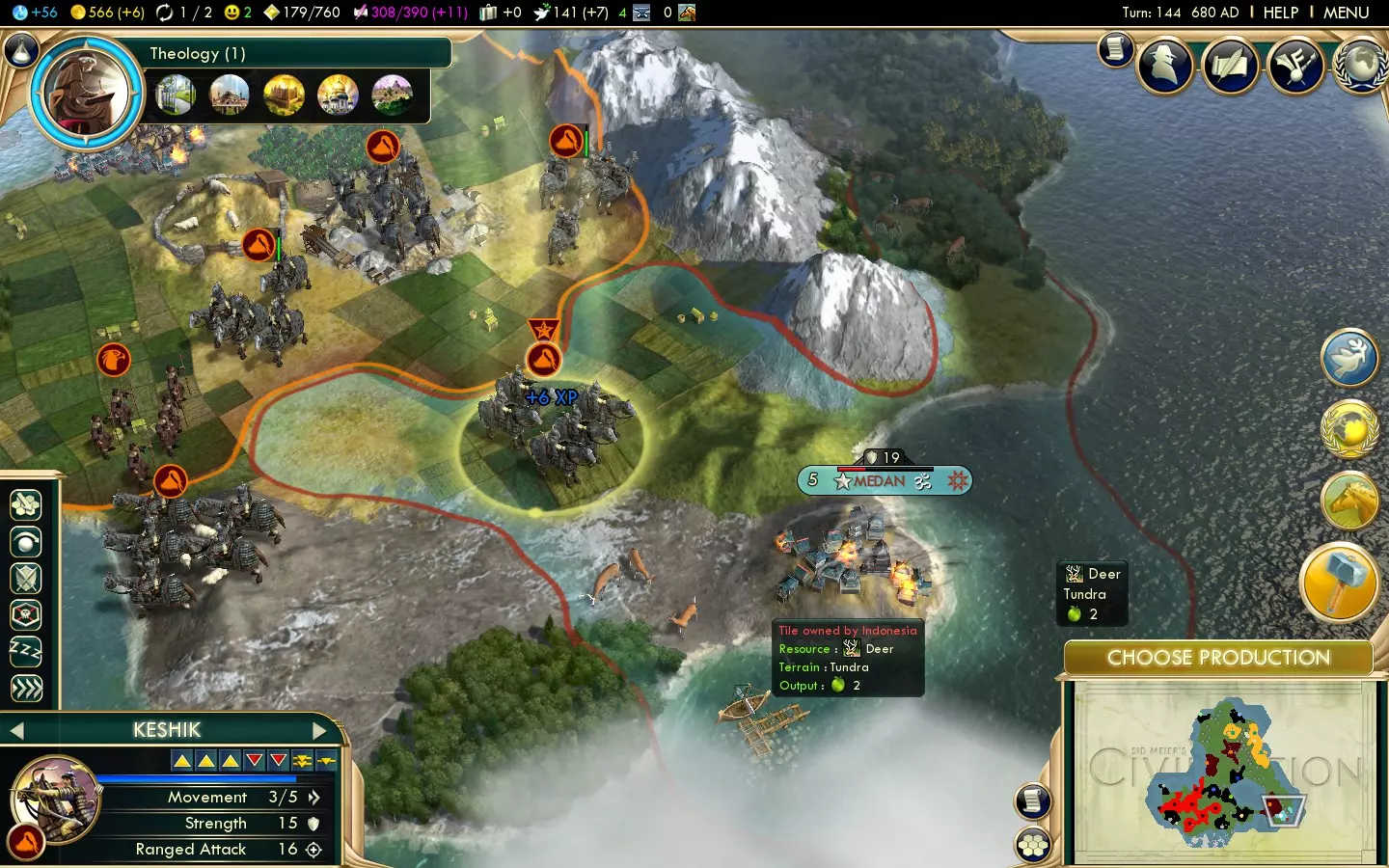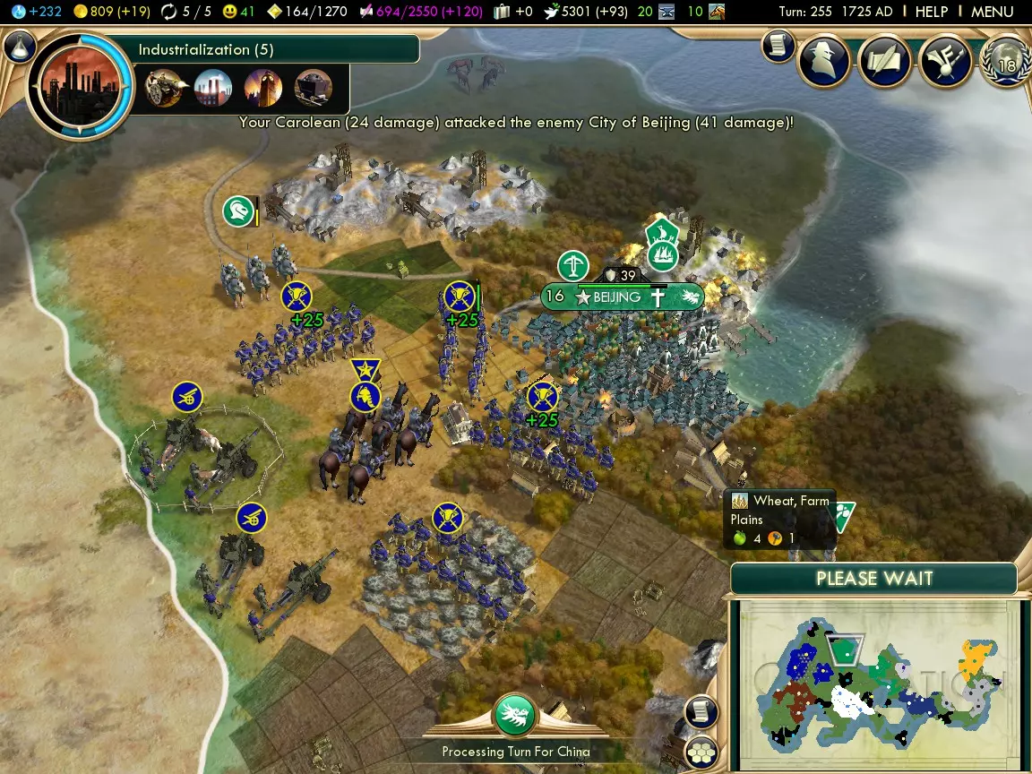 Above: 90 gold in a normal speed game is no great expense if you've been saving up some cash. Finisher Besides happiness, the other barrier to warmongering is gold. With large armies and freshly-conquered cities comes high maintenance costs, so getting gold as you kill will stop you getting into debt, ruining your tech rate and leading to units being disbanded. Commerce Opener As said with the Honour finisher, gold is a significant barrier to war, and getting a 25% bonus to gold in the capital will help offset that. Slightly. Wagon Trains Mongolia is a land-based Civ, hence many of your International Trade Routes will be by land, letting you get quite a lot out of this policy already. But add on the halved road/railroad maintenance, and you've got a tremendous economic boost which really helps out with your wars. Mercenary Army With the bulk of your army off fighting elsewhere, your homelands may be vulnerable to attack. Cheap Landsknechts will do well at dealing with that problem. Later in the lifespan of Keshiks, using Lancers where you previously used Horsemen is a good idea, and it's worth pointing out that buying Landsknechts and upgrading them to Lancers is cheaper than buying Lancers directly. So, you can really make that last hit on a city count. Mercantilism Buying units and buildings is cheaper now (so Landsknechts are exceptionally cheap) while gold buildings now generate a little science, so building them helps address two problems in one. Entrepreneurship You can turn a good-sized city into a Great Merchant farm (your capital is a good choice due to the opener's gold bonus,) which will be handy for getting even more cash to support conquests. Don't be afraid to run Trade Missions - just because you have a bonus against City-States doesn't mean you can't have a few friendly with you. Protectionism Original capitals can't be razed and have two types of luxuries nearby, meaning even if you burn everything you can, you'll still have a decent diversity of luxury resources. Protectionism gives you more happiness out of them. Finisher Trading Posts are quite a bit more effective now. Put some near your Great Merchant city and let the cash roll in. Rationalism Opener Keshiks won't last forever, and as such you need to keep ahead with technology. The opener immediately offers a 10% science bonus, so long as your empire's happy. Protectionism from the Commerce tree should make that easier. Humanism Once your finances are in order, you can place emphasis upon Great Scientist generation and help keep ahead tech-wise. Or mix Great Scientists and Great Merchants. Either way, you can generate these valuable Great People faster. Free Thought Commerce's finisher adds an extra point of gold to Trading Posts. Free Thought adds a point of science, too. So, if you've been building plenty to help get the gold going, you can really gain here. Plus, Universities are more effective. Overall, an excellent policy for upping science gain. Secularism While, chances are, you won't have loads of specialists, science is science. Sovereignty Lower science building maintenance makes having a good science infrastructure cheap, leaving more gold for unit maintenance. Scientific Revolution You won't get much use out of this due to all the warmongering you've been up to, but it's needed on the way to the finisher. Finisher A free technology and the ability to faith-purchase Great Scientists! If you're lagging behind a little tech-wise, this is a great opportunity to close that gap. Ideology Autocracy is the best fit for Mongolia thanks to the Lightning Warfare tenet, giving you back the speed advantage you've lost from mounted units going obsolete. Alternatively, consider Order for its strong infrastructural advantages. As usual, I'll be covering the best options from the first inverted pyramid of tenets, so that's three from level one, two from level two and one from level three. Level One Tenets - Autocracy Industrial Espionage Stealing technologies from other players is a good way to keep your science up. This tenet doubles the rate of tech stealing allowing you to concentrate on the military-focused bottom half of the tech tree while stealing technologies from the rest of it. Elite Forces Armoured units even with Khans may have to fight injured (particularly with the Blitz promotion.) This tenet makes that less of a problem. Fortified Borders An easy, maintenance-free way of gaining more happiness late in the game. Level Two Tenets - Autocracy Lightning Warfare Your ex-Keshiks get their speed back, a strong bonus to attack and the ability to ignore Zone of Control. Remember that melee units gain XP faster than ranged units, so even though most of the promotions you took now lack relevance, you can use Quick Study to get new ones relatively quickly. Additionally, your Khans are now the fastest things on land. They're still affected by Zone of Control, though, so use their insane speed to keep them safe. Third Alternative Tanks and planes need oil, and that's something you may be running low on. Get this policy before Lightning Warfare if you're particularly low on the stuff. Level Three Tenet - Autocracy Clausewitz's Legacy You've got 50 turns with a significant attack bonus. If you're fast, you can conquer the rest of the world in those 50 turns. If you're not quite ready when the tenet's first avaliable, take something like a Social Policy or level 1 tenet instead, and come back when you're prepared, as you'll want to get as much out of this as possible. Level One Tenets - Order Socialist Realism This is an incredibly easy source of happiness that you'll need for those late-game conquests. Young Pioneers A fairly easy additional happiness source. You should be building plenty of production buildings anyway, so it's no great effort to use this effectively. Universal Healthcare or Skyscrapers The former's better if you desperately need more happiness or have a low number of non-puppeted cities. The latter's b