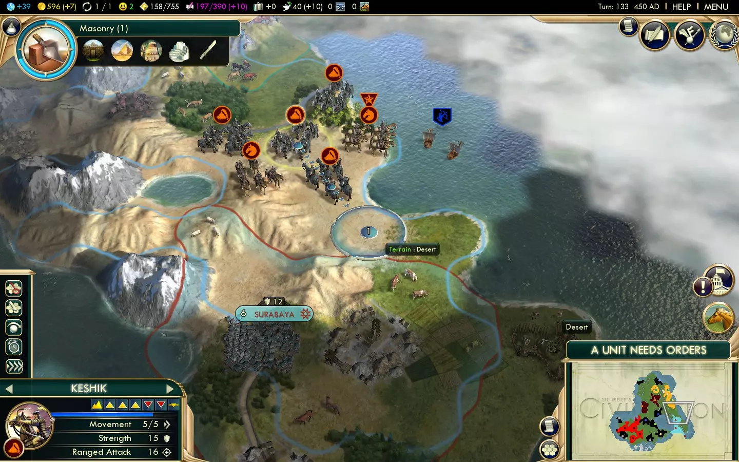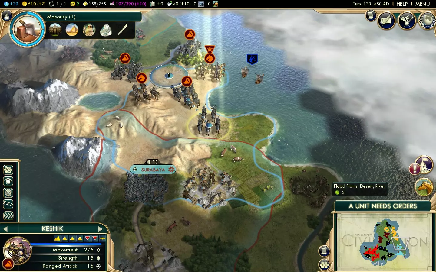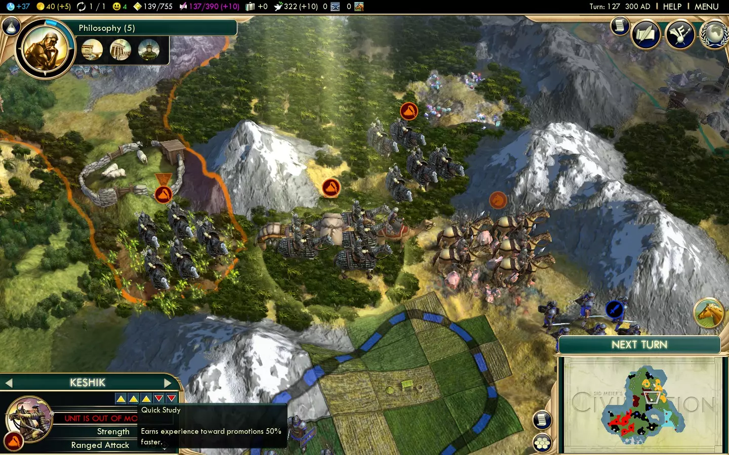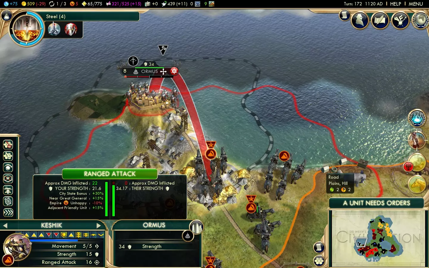 Scientific: 4/10 Mongolia's uniques aren't useful for anything besides warfare, but that's something they absolutely excel at. Their tech route (prioritising Keshiks as soon as possible) means they may get to Universities late, thus hurting science, while their UA actively discourages diplomatic victories. Similar Civs and uniques Overall Mongolia's mounted unit-centric strategy is shared with Poland, although Poland has a significantly more flexible UA and better economic support in exchange for a weaker UU (Winged Hussars are still strong, but they can't do hit-and-run attacks on cities as effectively as Keshiks) and the lack of the fast healing that Khans offer. China also has quite a few similarities with Mongolia. China's UA basically gives them a unique Great General (but with double the strength bonus instead of faster speed and better healing) and they also have a strong mid-game ranged unit. England is another good candidate. England, like Mongolia, lacks economic support in its uniques but makes up for it with a very strong mid-game power spike. Same start bias Mongolia's start bias is shared only with Poland. Similar to the UA Persia's UA offers combat bonuses akin to Mongolia's which are less situational. Mongolia gets a +1 movement bonus to melee mounted units, while Persia gets it for all units. Mongolia gets a 30% bonus against City-States and their units, while Persia gets a 10% bonus that works against all cities and units. The key downside is that Persia's advantages require them to be in a Golden Age, something that's fairly unreliable early on in the game. Similar to Keshiks Arabia's Camel Archers are the obvious unit to compare Keshiks to, and there's a full comparison later on in this guide. Other Knight UUs include Spain's Conquistadors, Songhai's Mandekalu Cavalry and Siam's Naresuan's Elephant. Similar to Khans The only other Unique Great Person is the Merchant of Venice, but it could barely be more different from the Khan. Instead, consider China's UA, which makes their Great Generals twice as effective, or at uniques that offer faster healing (Persia's Immortals and the Invulnerability promotion that Indonesia's Kris Swordsmen can get.) Sweden's Hakkapeliitta can make Great Generals move faster, making them the only Civ other than Mongolia that can keep up Great Generals with cavalry units without needing Autocracy's Lightning Warfare. The Broader Picture Normally I write overall strategies in the UA section, but the narrow scope of the UA could make that section too confusing. Welcome to Mongolia. They're incredibly effective land-based warmongers, but lack economic backup. You don't really need to get going with war until Keshiks roll along, so you've got time to build up a decent infrastructure. Gold, happiness and horses will be the three most crucial elements. The first two can be handled by settling cities near a diverse range of luxury resources, while researching Animal Husbandry first will reveal horses, so you can quickly take them before anyone else does. Allow time for getting Worker technologies as appropriate, as well as Writing, then head along to The Wheel. This offers you Chariot Archers, which not only make effective defensive units early on in the game, but crucially they upgrade to Keshiks and their promotions stay relevant. You don't need to build a Barracks prior to churning them out; they can farm the XP off Barbarians instead, and Keshiks gain XP so fast that it's often not worth the 1 gold-per-turn maintenance cost of Barracks. Be sure to keep a couple of horses around for Horsemen. Don't upgrade those Horsemen into Keshiks - they'll be for getting the last hit on a city after Keshiks have battered down their defences. As you can't build Horsemen after getting the Chivalry technology, make sure you have all of them you need, ready. Once you've got your Worker technologies, Writing and Horseback Riding, it's time to start beelining Chivalry to get Keshiks going as quickly as possible. Save money up for upgrading your Chariot Archers to cut down the amount of time between researching the technology and launching your attack. Despite their seemingly low strength, Keshiks can still fight perfectly well through the renaissance and even beyond! Crush the Civs that stand in your way - razing the cities you don't need so your happiness doesn't suffer - and you should have an advantage by the late-game which is hard to overturn. So, to summarise: Prioritise getting gold, happiness and horses in the early-game Build Chariot Archers so you can upgrade them to Keshiks, and at least two Horsemen you shouldn't be upgrading Beeline Chivalry after you've got Worker technologies, Writing and Horseback Riding going Use Keshik wars to give youself a massive advantage for the rest of the game So, you've got the wider framework, but now it's time to cover how all the details work... Unique Ability: Mongol Terror