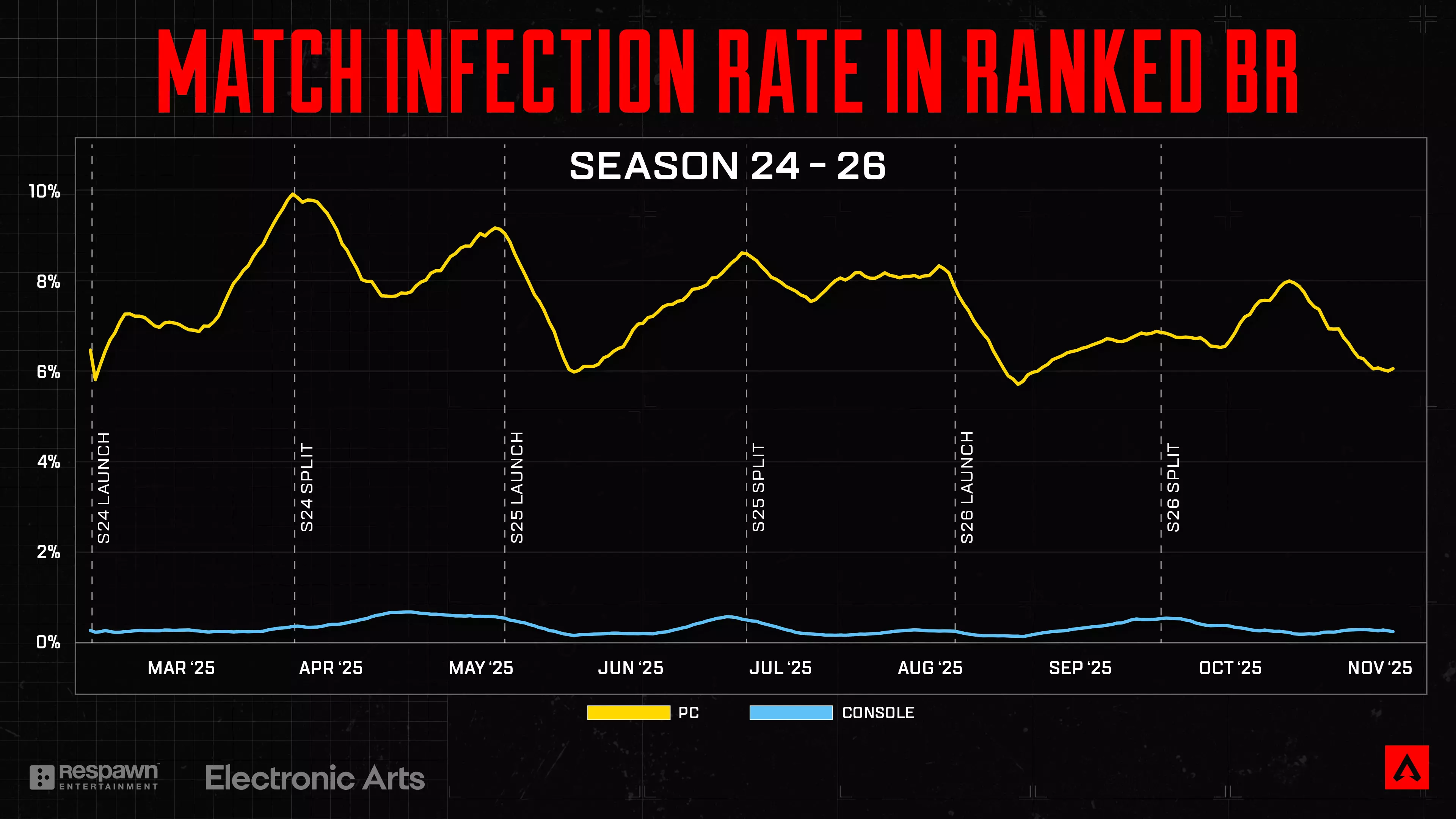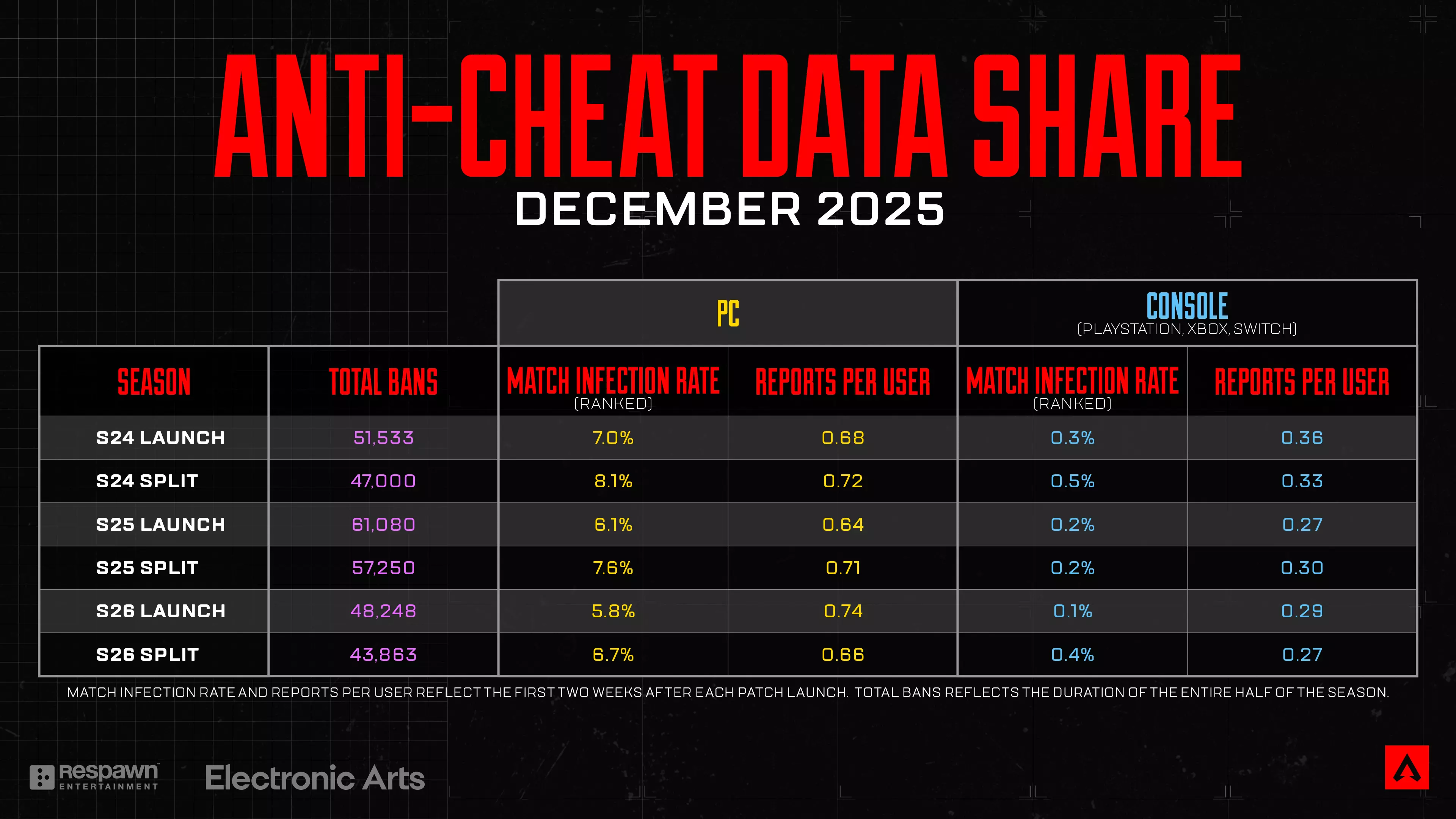 感染率 比赛感染率(MIR)是包含作弊者的总比赛百分比,在60人的比赛中只要有一名作弊者,该比赛就会被标记为“已感染”。有关MIR的更多信息,请参考上赛季的反作弊博客。 首先来看PC端的MIR。从上述表格可以看出,第26赛季开启时的MIR为5.8%,是我们开始统计以来的最低值。虽然在赛段期间出现了常见的上升趋势,但第26赛季赛段的MIR仍低于其他已统计的赛段。 在主机端,你会注意到最近一个赛段开始时略有上升。但从折线图来看,尽管有所增加,总体数字仍然相当低。我们也专注于改进检测模型,以更好地识别未授权外设。这对我们至关重要,因为我们致力于持续对主机MIR产生积极影响,并为主机玩家提供整体更优的体验。 总体而言,这是一个数值越低越好的指标,我们将始终追求进一步降低该数值。我们仍有工作要做,以尽可能降低这一数字,并将继续通报我们的进展。 封禁 我们的团队在每个阶段都秉持决心和专注,持续针对作弊者采取行动。仅在第26赛季,我们就因包括使用 bots、作弊或滥用漏洞等多种原因封禁了超过92,000个账户。关于我们封禁流程的简要说明:通常情况下,我们会先处以24小时封禁,作为一种快速、可操作的方式将可疑账户从生态系统中移除。随后,反作弊团队会进行彻底调查,并决定是否需要更严厉(或永久)的封禁。这就是为什么有时有问题的账户最初似乎只受到短期封禁——这通常是反作弊团队完成分析期间的临时解决方案。根据具体情况,后续可能会实施更严厉的封禁。 用户举报量:我们很高兴地分享,在最近的周期中,主机平台的用户举报量达到了近几个赛季以来的最低水平!我们将这一下降归因于检测模型的改进,这些改进使得针对组队作弊和机器人的打击更加高效。赛季中期,我们部署了新一代的作弊检测模型,在最初两周内封禁了超过1000个账号。通常在赛季中期,我们会看到每用户收入有所增长,但由于作弊举报减少,实际上与赛季初相比有所下降,这是我们开始统计以来的最低中期数值。 保护你的EA账号 我们最近发现了一些备受关注的账号被盗案例。我们的支持团队已成功将这些账号归还给其所有者。在此提醒,你可以通过以下步骤保护你的EA账号: 开启双重认证 切勿在不同网站重复使用密码 谨慎分享个人信息 如需更多帮助,请阅读我们的EA账号安全指南。展望未来