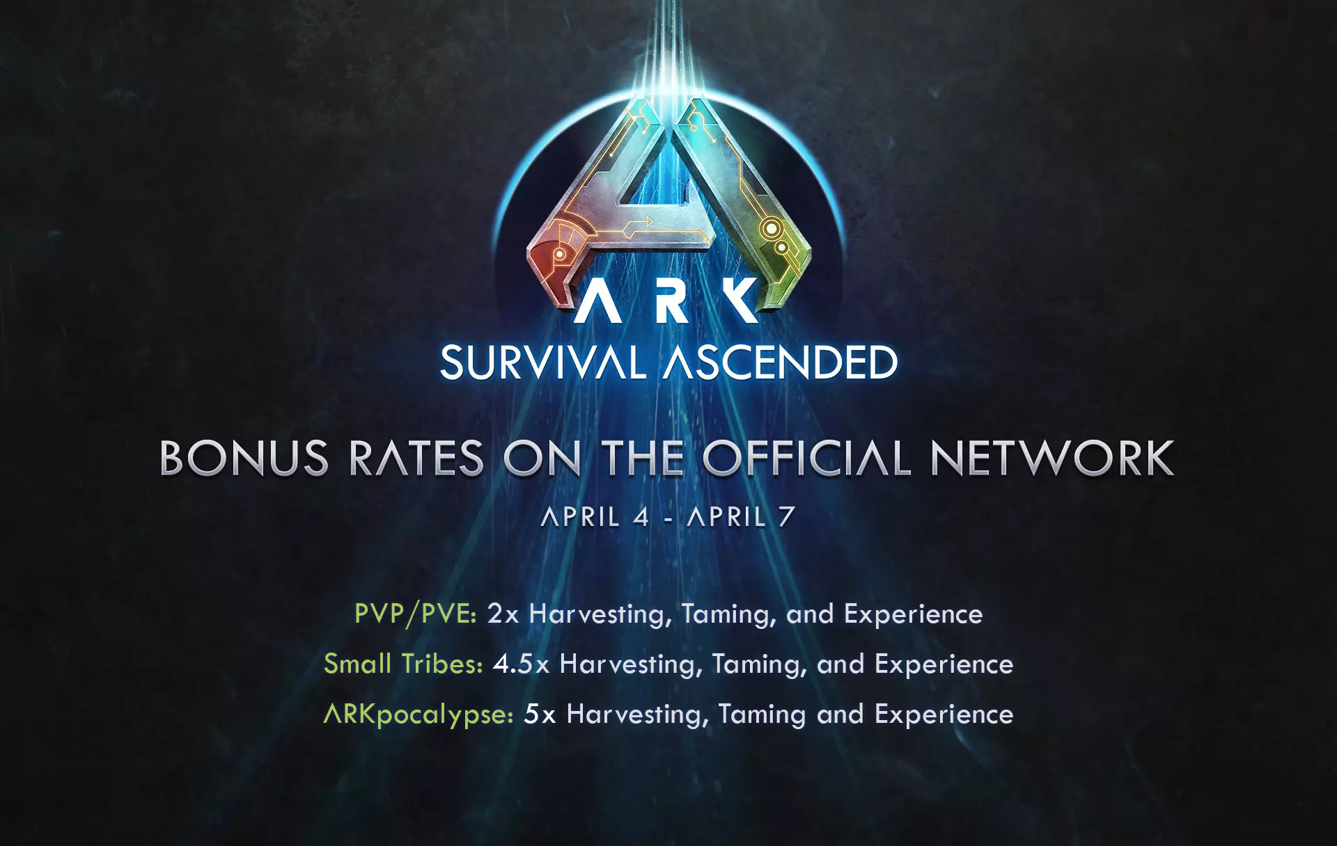 本周末,官方服务器将开启倍率加成活动!活动持续至4月7日(周一)。 PVP/PVE:采集、驯服和经验获取倍率为2倍 小型部落:采集、驯服和经验获取倍率为4.5倍 末日模式:采集、驯服和经验获取倍率为5倍