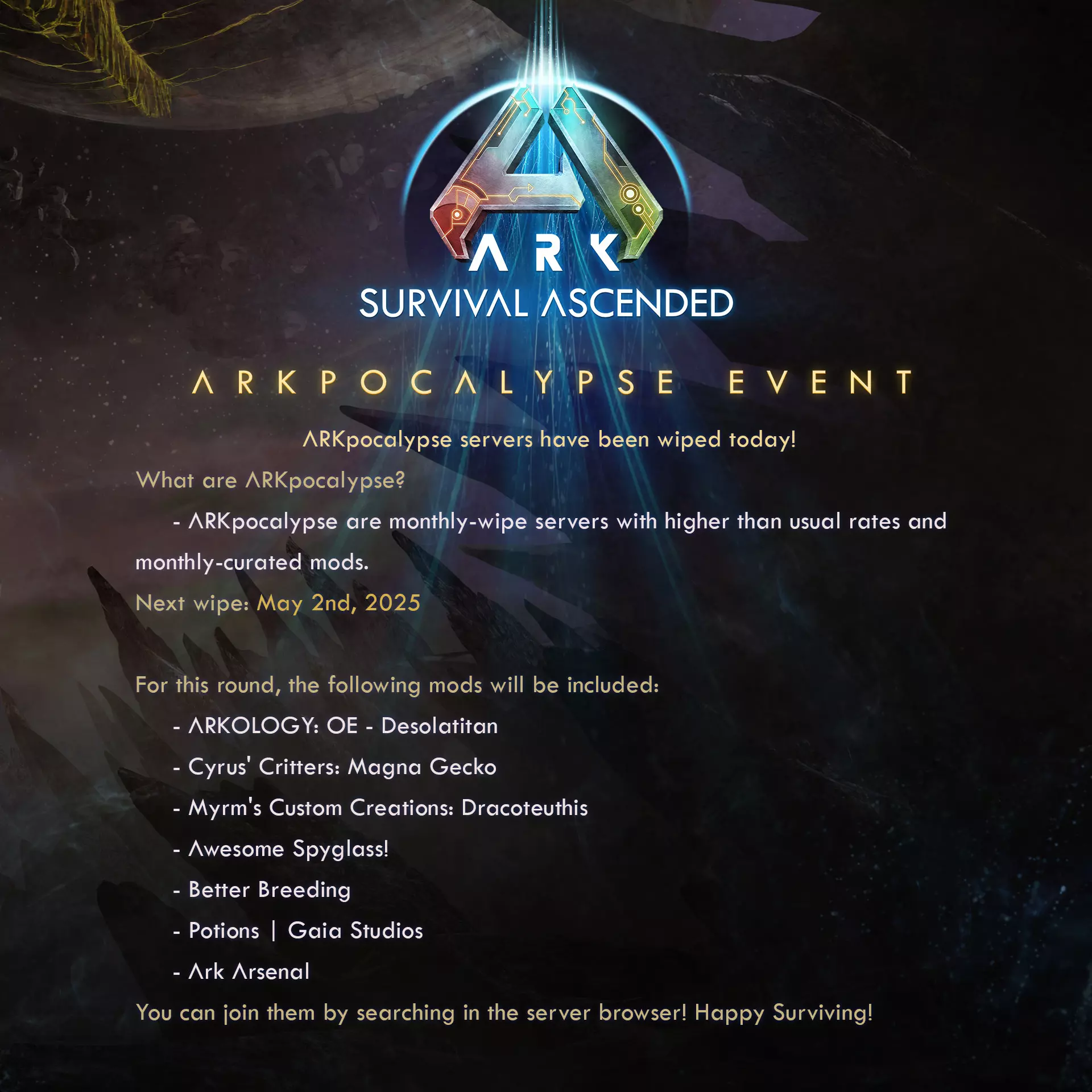 《方舟:生存进化》ARKpocalypse服务器今日已重置! 什么是ARKpocalypse? ARKpocalypse是每月重置的服务器,其倍率高于普通服务器。 下次重置时间:2025年5月2日 本轮将包含以下模组: ARKOLOGY: OE - Desolatitan(作者:DragonHeart7998) Cyrus' Critters: Magna Gecko(作者:cyrusCreates) Myrm's Custom Creations: Dracoteuthis(作者:myrmecoleontidae) Awesome Spyglass!(作者:ChrisMods) Better Breeding(作者:Silentrizz) Potions | Gaia Studios(作者:GaiaStudios) Ark Arsenal(作者:W1K1P3D14) 你可以通过服务器浏览器搜索加入!祝生存愉快!