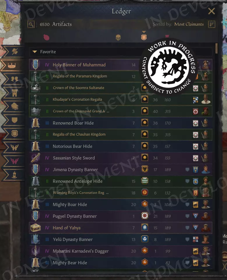 巧合的是,这对于查找漏洞非常有用。 已确认的初始标签页包括: 【文物】 【角色】 【进行中的战争】 【家族】 你再也不必点击数千个角色来查看世界上存在哪些文物了。所有内容都在那里,一键即可查看。你还可以将它们标记为收藏,以便在记录中保留有趣的内容。现代科技真是不可思议。