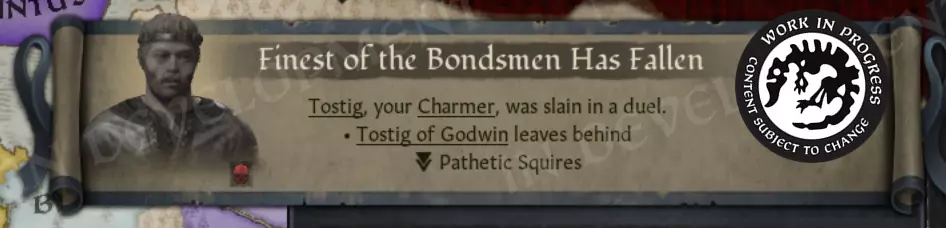 【这简直是博物馆级的藏品!】 我们也在探索更多标签页功能,但由于时间限制,部分功能可能会在未来的更新中推出: - 伯爵领 - 头衔 - 地产 - 信仰/宗教 - 文化 请在评论中告诉我们你最期待哪些功能,这样我们就能将精力集中在最重要的地方。 这只是█████将与我们合作开展的众多工作之一。在未来的开发日志中,我会让他们正式介绍自己,并更详细地向你展示他们的工作。敬请期待。 春季大扫除 最后,正如之前提到的,我们关注的领域之一是处理积压的漏洞。在社区团队的协助下,我们一直在各平台排查问题,以便更清晰地了解那些尚未解决的常见问题。 我们正全力处理这份问题清单,希望此次更新能缓解大家在游戏中遇到的部分问题。如果有任何漏洞希望我们务必留意,无需担心,你们有机会直接告知我们。 那么,对于此次更新中我们所做的这些工作,你们需要支付什么费用呢? 什么都不用。分文不取。完全免费。就金钱方面而言。 此次更新是我们致力于改善《十字军之王3》长期健康状况的一部分。我们也在玩这款游戏。我们也会遇到同样的漏洞、同样的挫折,以及同样的“它为什么要这么做”的疑问。“?”时刻。我们和你们一样,都希望这款游戏能成为最好的自己。 同时,有一点需要明确说明:我们之所以能在《十字军之王3》发行六年后继续为其提供支持,是因为你们一直在支持它。无论是通过章节、内容创作者包,还是其他单独的DLC,正是这种支持让我们能够继续投入到像本次这样的大型免费更新中。 因此,所有《十字军之王3》的拥有者在更新发布当天都可以获得此次更新,无需额外购买。 我们的承诺 我在这里展示的只是第二季度更新计划中的一小部分。如前所述,本次更新的重要部分集中在错误修复和调整上,我们希望这些能为大家带来更好的整体体验。 我们希望这次更新能暂时满足大家的期待,直到我们准备好公布未来章节中所有令人兴奋的内容。我们保证会有更多信息公布! 我希望你们不仅仅将这篇开发者日志视为又一次对即将推出功能的宣传(当然,这部分也是有的),更将其看作是我们黑工作室的承诺。自从被任命为设计团队负责人以来,我和@lachek都非常兴奋能与其他开发团队成员合作,确保《十字军之王3》不负其名,也不负你们的期望。作为这项工作的一部分,我们还将尝试一项极少进行的举措:为此次更新开启公开测试。 这并非《十字军之王3》的常规操作,但我们认为这是一个有趣的工具,有助于在正式发布前优化游戏体验。它让我们有机会收集更广泛的反馈,发现边缘情况,并以内部测试无法实现的方式对改动进行压力测试。 我们将在日后分享更多关于测试机制的细节。这对我们而言是一个相当复杂的过程,因此我们希望在开放测试前确保一切准备就绪。 谁知道呢。如果这次测试顺利且你们喜欢,或许我们未来会更多地采用这种方式。 暂时告别,下次再见~ 敬请期待!