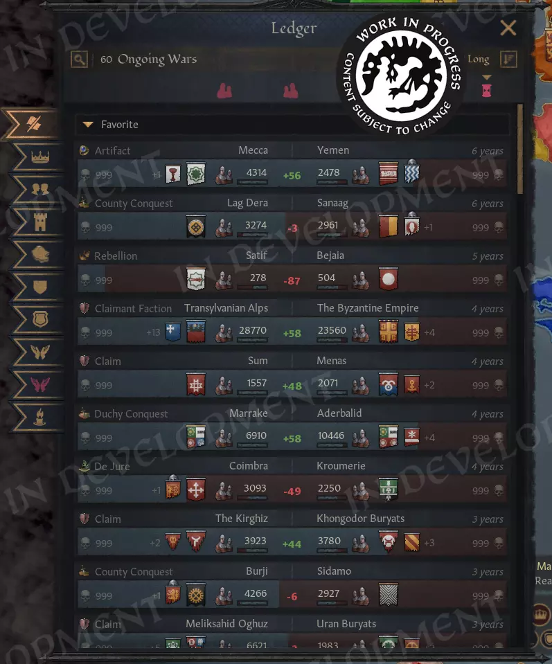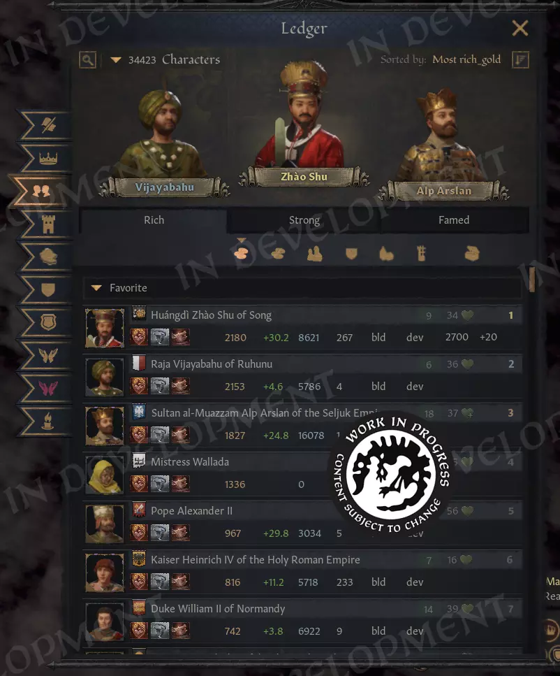 【现在你可以真正弄清楚自己是不是世界上最厉害的玩家了】 现在你可以在上班时间玩《十字军之王3》,同时让老板以为你在看你最喜欢的电子表格程序里的数据。这简直是双赢。 从整体来看,账本系统提供了一系列标签页,让玩家可以探索和概览世界的不同方面。和我们的其他系统一样,我们很期待看到玩家们能想出哪些额外的标签页!说不定,我们在游戏发售后也会自己添加更多标签页呢。 每个标签页还附带了一堆筛选器,让你能获取到你想要的确切数据。