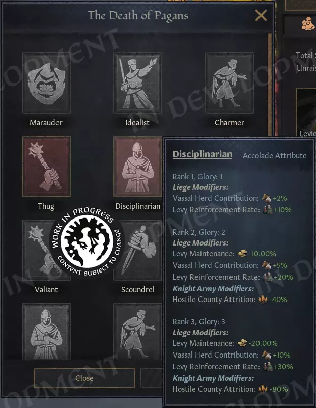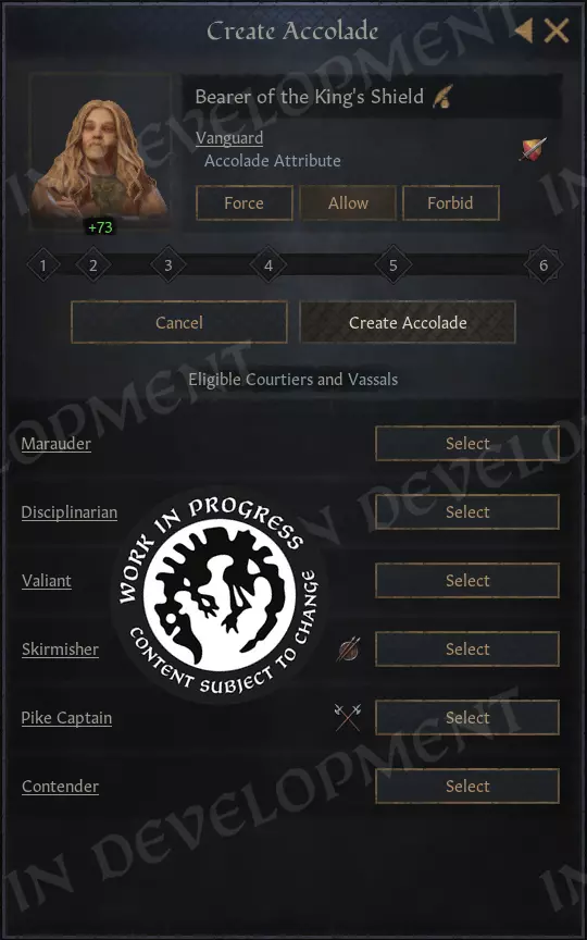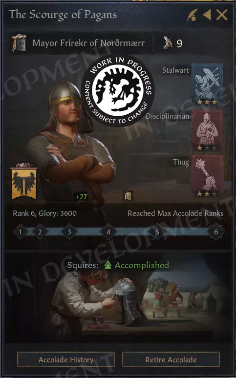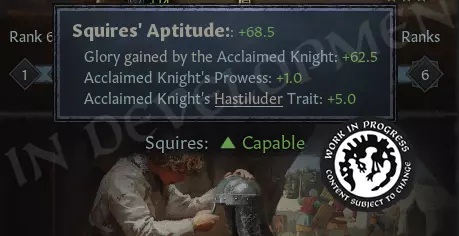每个荣誉现在都有一个【侍从属性】,用于显示其未来继任者的潜力。该属性会直接影响下一任受誉骑士接任时的特质和勇武值,可能产生积极影响,也可能略逊一筹。 侍从有五个资质等级: - 卓越 - 能干 - 经验不足 - 无能 - 低劣 显而易见的问题:如何提升侍从的资质?很简单,让你的受誉骑士切实履行职责即可。 荣耀是骑士随时间积累的“经验”,是侍从资质的主要驱动因素。其他影响因素包括受誉骑士自身的技能(尤其是勇武和军事技能)、作为领主的相关技能,以及已升级特质的经验(如【马上比武者】和【有志剑士】)。继承机制现在的运作方式如下: 1. 你当前的骑士会死亡。令人悲伤。 2. 系统会从你的宫廷中选择一位合适的受誉骑士,或生成一位新的受誉骑士并将其加入你的骑士名册。这位新骑士会根据侍从的资质等级获得增益或减益效果。一旦就位,侍从的属性会重置,新骑士的光辉生涯就此开始。 当然,你会通过消息收到通知。但除此之外,完全不需要任何手动操作。