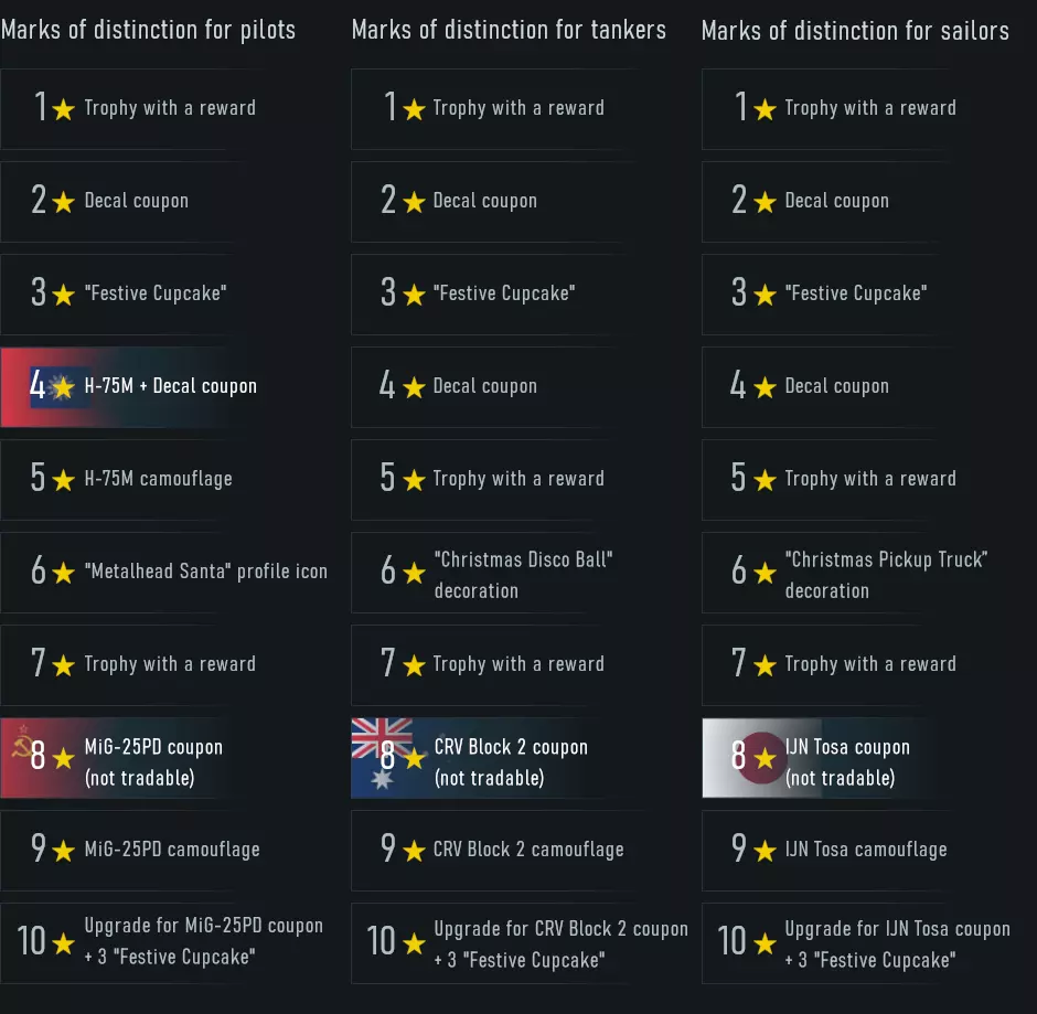 节日纸杯蛋糕银箱 详细规则 每项任务的具体规则可在以下位置查看:昵称→成就→冬季音乐会。 要获得杰出标志,需在对应游戏模式中使用对应载具类型完成任务。例如,飞行员的杰出标志只能通过参与空战(街机/历史/全真)获得。 可在除“突击”和“[持续对抗]海战”外的所有游戏模式的多人战斗中完成任务。 不仅可以使用三级及以上载具完成任务,也可以使用低等级活动载具。这些载具来自大型活动,如冬季和夏季马拉松、二战编年史、战令赛季以及锻造马拉松。在这些载具的属性卡片中,你可以找到它们首次开放获取的活动名称。 当成就颜色变为金色时,即视为已获得杰出勋章。如果你已完成任务但成就尚未变为金色,请加入另一场战斗,战斗结束后成就应会变为金色。 截至2026年1月12日,可在成就窗口中使用金鹰购买错过的杰出勋章。请确保选择正确的成就类别:坦克手、飞行员或水兵。 以可交易优惠券形式获得的奖励,将于2026年1月12日起在市场开放交易。优惠券的可交易时间可在游戏内的优惠券描述中查看。每张优惠券的单独交易选项取决于其获取时间,与载具类型无关。 【升级优惠券】道具的有效期至2026年2月1日格林尼治标准时间12:00。在此之前,你可以使用该道具或将其兑换为战争债券。过期后,该道具将从你的库存中消失。 消耗8个杰出标记,你将获得一张不可交易的载具优惠券。激活该优惠券后,你将立即获得对应的载具。如果你不想使用该载具,而是希望在市场上出售优惠券,则需要【升级优惠券】道具。 消耗10个杰出标记,你将获得一个不可交易的【升级优惠券】道具。你可以使用该道具将已获得的载具优惠券变为可交易状态,然后在市场上出售。交易优惠券的可售日期可在游戏内的描述中查看。 PlayStation和Xbox玩家可以将贴花优惠券兑换为同类优惠券。兑换功能可在工坊→【冬季音乐会】物品兑换窗口中使用。 圣诞快乐,新年快乐!