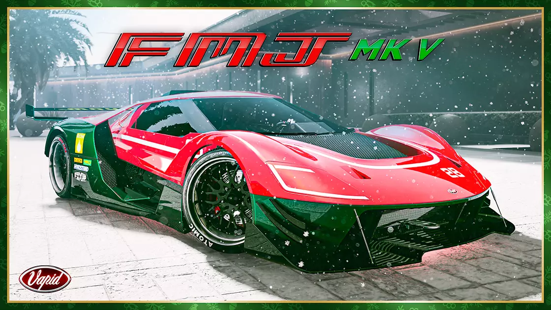 VAPID FMJ MK V 现已全面发售 FMJ MK V 最初本是一款仅供赛道使用的原型车,旨在致敬 20 世纪 60 年代末的 Vapid 传奇车型。如同所有伟大的技术创新一样,MK V 不知何故迅速投入量产,驶入平民街道,并几乎即刻载入赛车史册。 Vapid FMJ MK V(超级版)现已在传奇车行或豪华汽车展厅开放购买。 节日服饰及更多内容 GTA Online 中的假日活动已开启,南圣安地列斯的服装店现已上架节日服饰,当地地标及您拥有的房产内也已装点起树木和装饰品——包括您奢华的新豪宅内也添置了雅致的节日装饰。据预测,本月晚些时候将出现降雪天气,请做好相应准备。 12月23日至1月7日期间,随时游玩GTA Online即可获得各种节日好礼,包括全新礼物【节日祝福毛衣】和【新年烟花紧身衣】,以及回归好物【雪球发射器】、【拐杖糖】、【20发火箭烟花发射器】,还有零食、护甲和弹药补给。