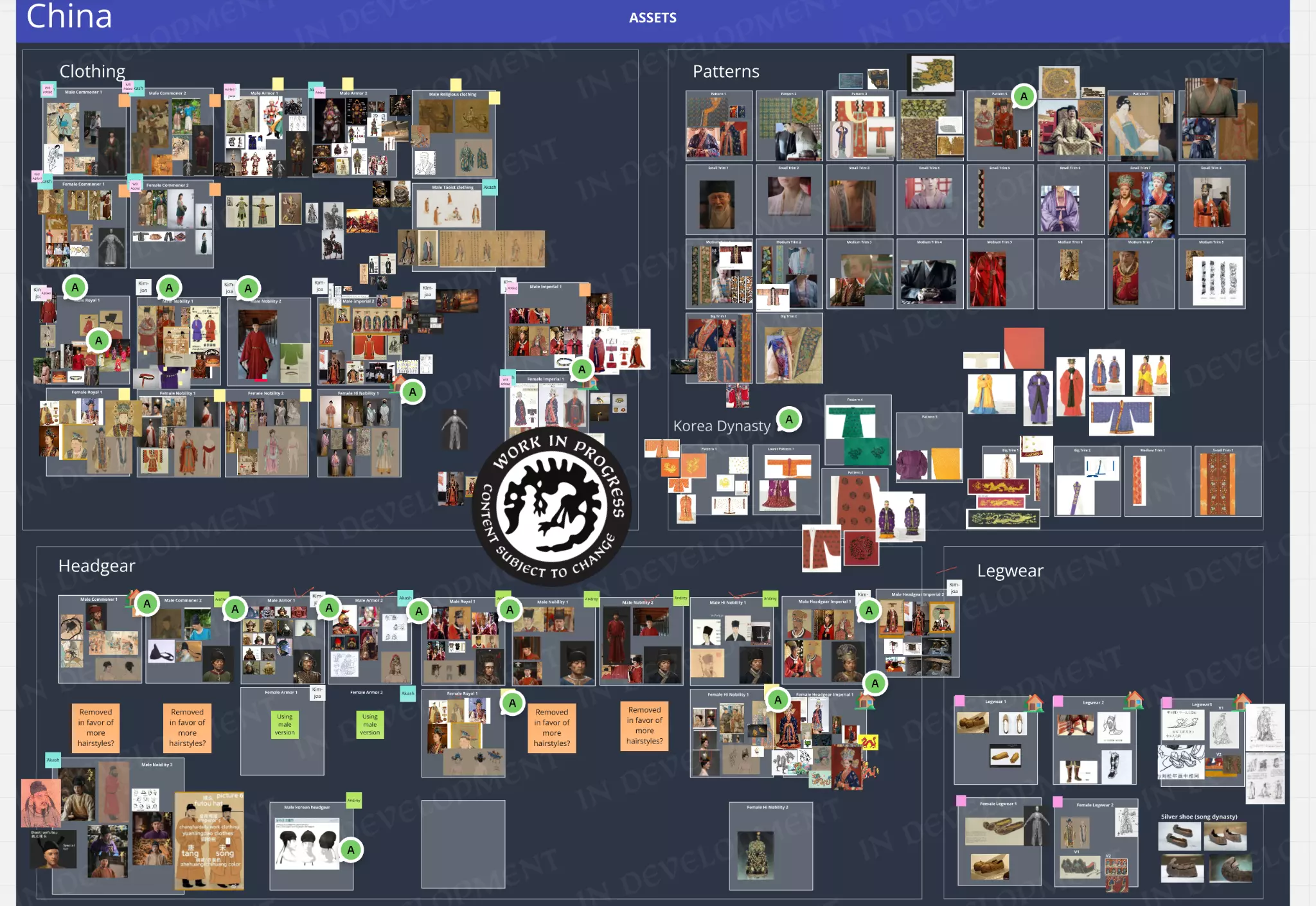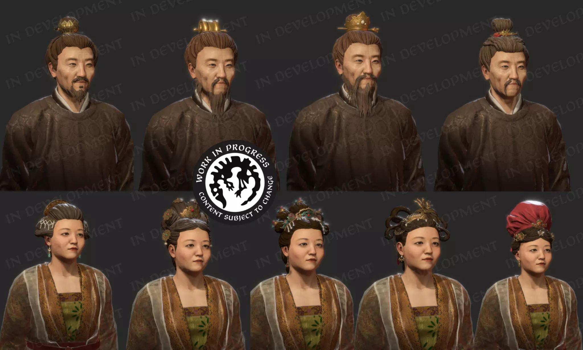 【角色美术团队整理的Miro白板截图(仅一小部分!),用于收集所有与中国服饰相关的参考资料。】 总体而言,我们已为此项目成功创建了84项中国文化资产,具体分布如下: 16种发型 21件服饰资产 12种胡须 12件腿部穿戴 18件头饰 2套盔甲 3个地图单位 以下是一些游戏渲染图,展示了男性和女性角色的各种发型、胡须和头饰。这些物品会根据角色的等级和状态在游戏中触发。