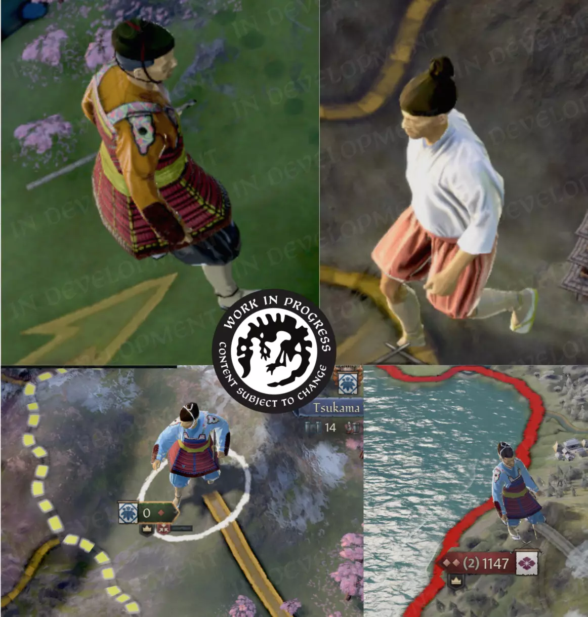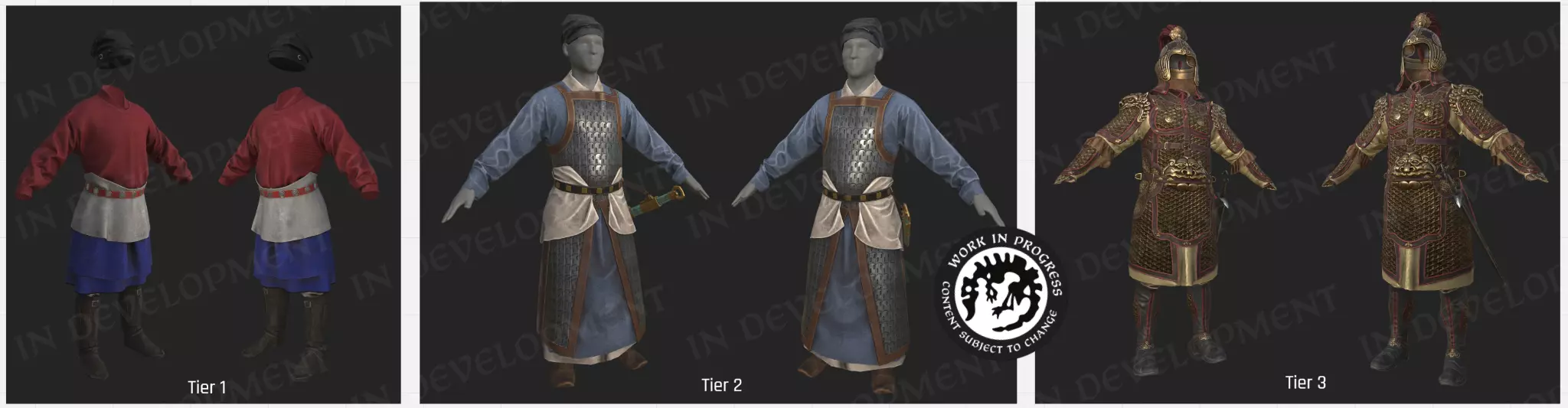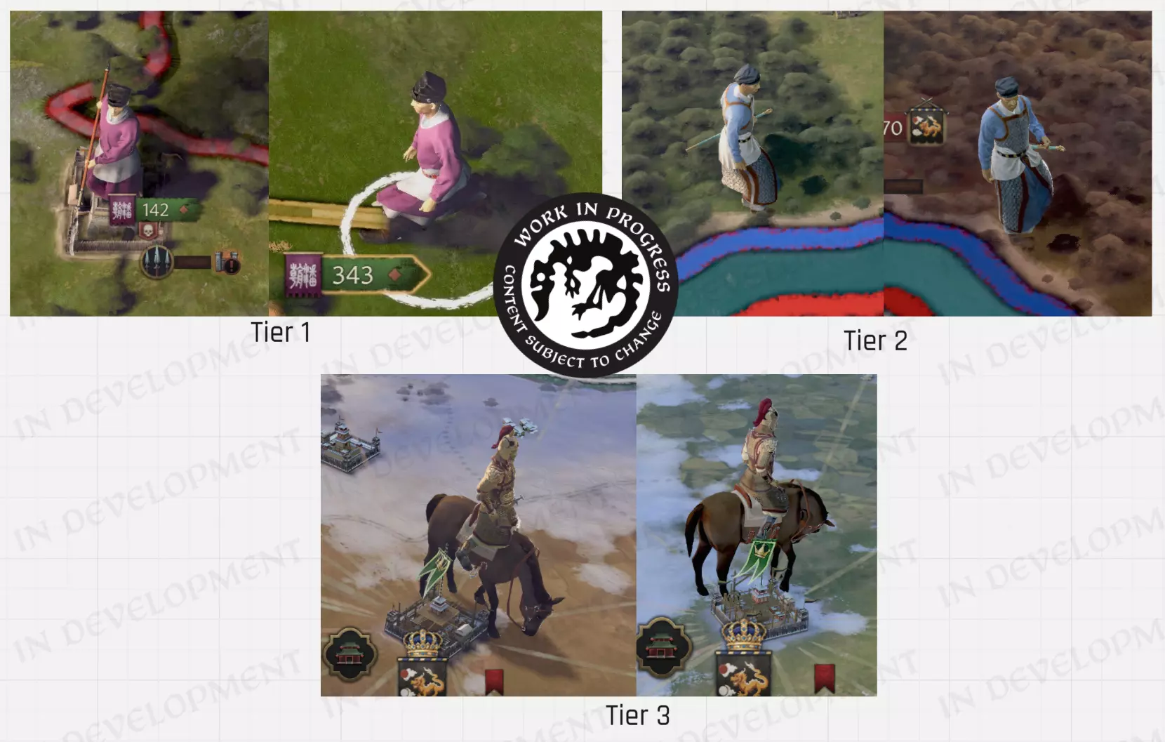 【中式铠甲】 军事单位 除了人物立绘外,我们还通过地图上的全新军队单位来展现中国各朝代的军事力量。 对于每种文化,我们通常设有三个等级的地图单位。