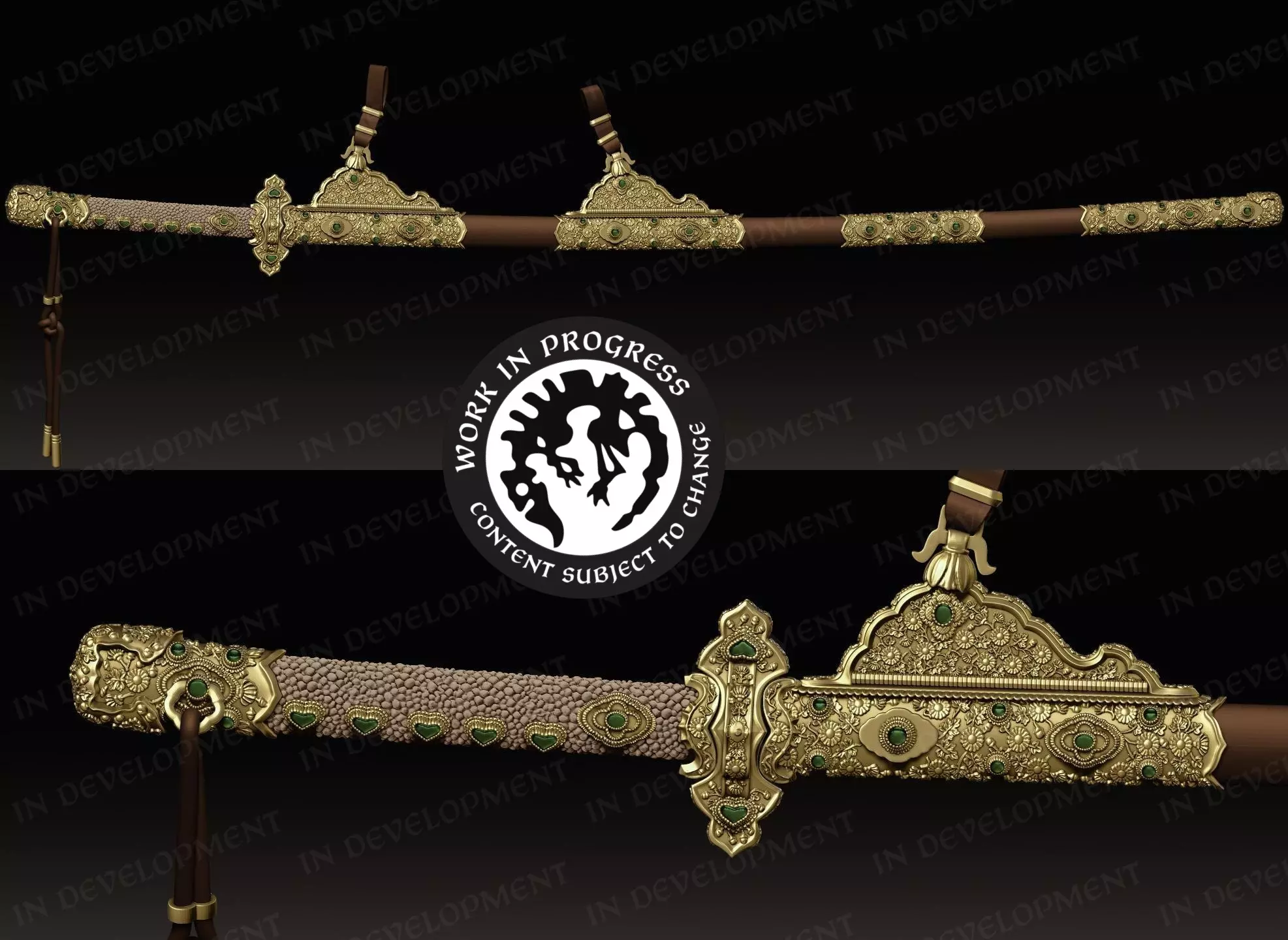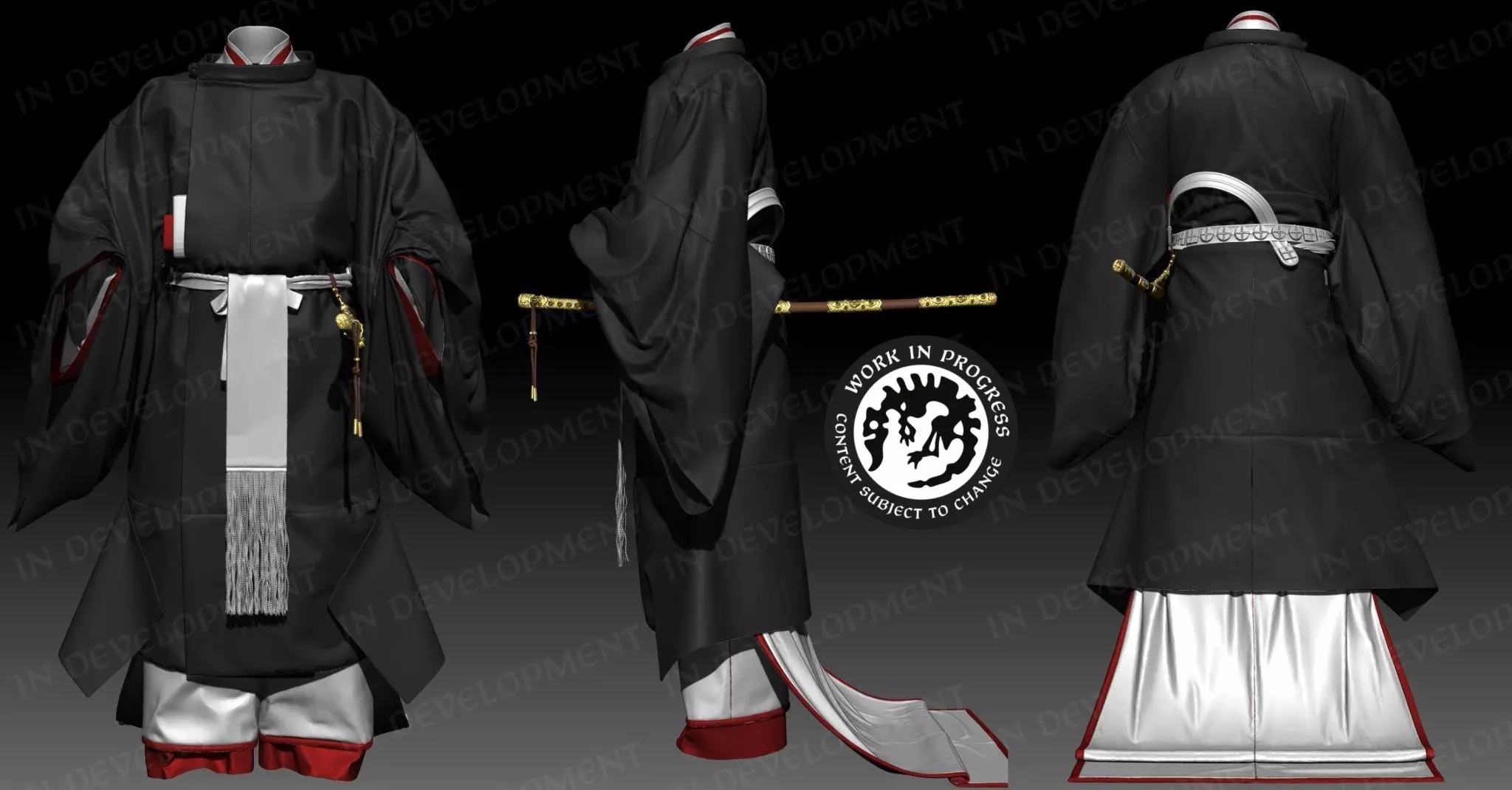 【十二单衣3D模型制作】 束带(天皇朝服):供男性朝臣穿着,从中级官员到天皇均可使用。束带包括宽大的袖子、高耸的冠帽(冠或乌帽子)以及挺括的正式轮廓。我们的版本融合了仪式的庄重感与动画所需的轻微活动度。 与十二单衣一样,我们以真实还原的方式构建束带,模拟中包含了真实服饰的每一层。最外层是缝腋袍,其下还穿着六层衣物,共同塑造出束带标志性的轮廓。 如您所见,我们还根据平安时代的真实文物,对仪式用的饰太刀进行了建模。