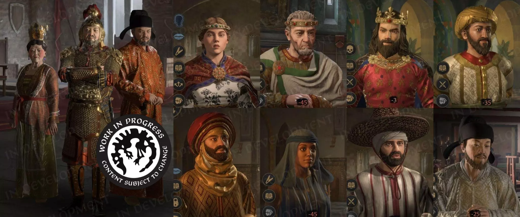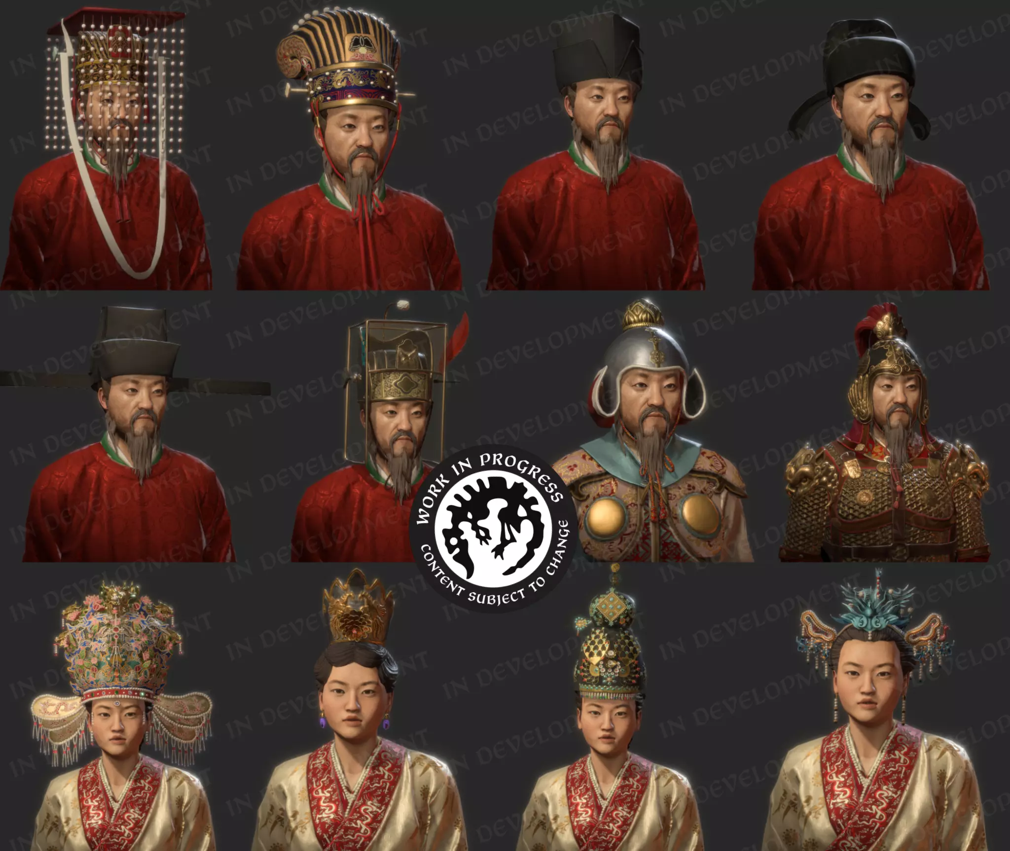 【地图整体改进后其他地区的更多角色示例】 总结 作为我们为扩展包制作的资产数量最多的一次(更不用说聚焦于世界上一个全新的地区),《天命》给我们带来了巨大的挑战,但深入研究这些极其丰富的素材并将其在《十字军之王3》中生动呈现也非常有意义。我们对成果和内容量感到满意,并真诚希望它能为这个新DLC的沉浸感做出贡献。 让你们中的许多人能够在一直想玩的国家和文化中游玩(甚至可能是你们自己的国家和文化),这对我们来说非常重要。虽然我们为这款扩展包准备了大量素材和参考资料,但由于其规模庞大,我们无法在首日就实现所有内容。那个时代有许多精美的服饰和配饰,我们希望有一天能够将它们呈现出来,所以在《天下》发布后,我们非常想听听大家觉得有哪些内容缺失,以及希望我们在未来添加什么。Bluesky X Facebook Instagram Youtube