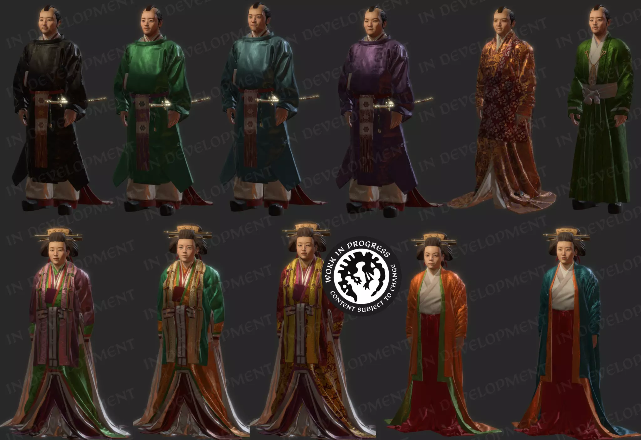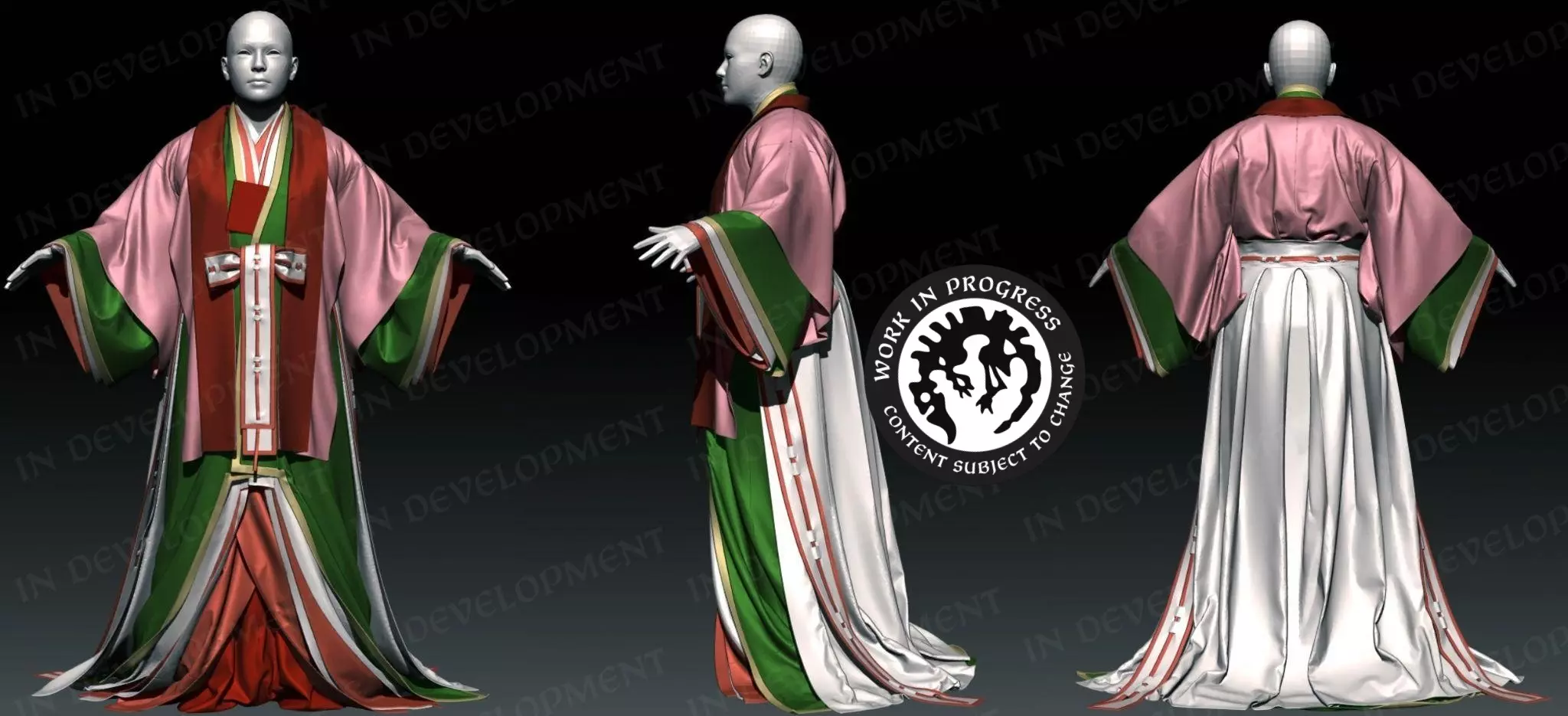 【中国地图单位】 日本平安时代 日本平安时代(794–1185年)以优雅、礼仪和多层服饰为特征,是日式角色服装的灵感来源。我们旨在呈现其丰富的图案、色彩、纹理以及平安时代的宫廷服饰。 重要服饰: 十二单衣:为宫廷女性所穿着,这套优雅的多层套装通过精心挑选的颜色来反映季节变化。这对我们团队来说是一项有趣的挑战;我们使用布料模拟软件,逐一忠实地还原了这套服饰的每一层。