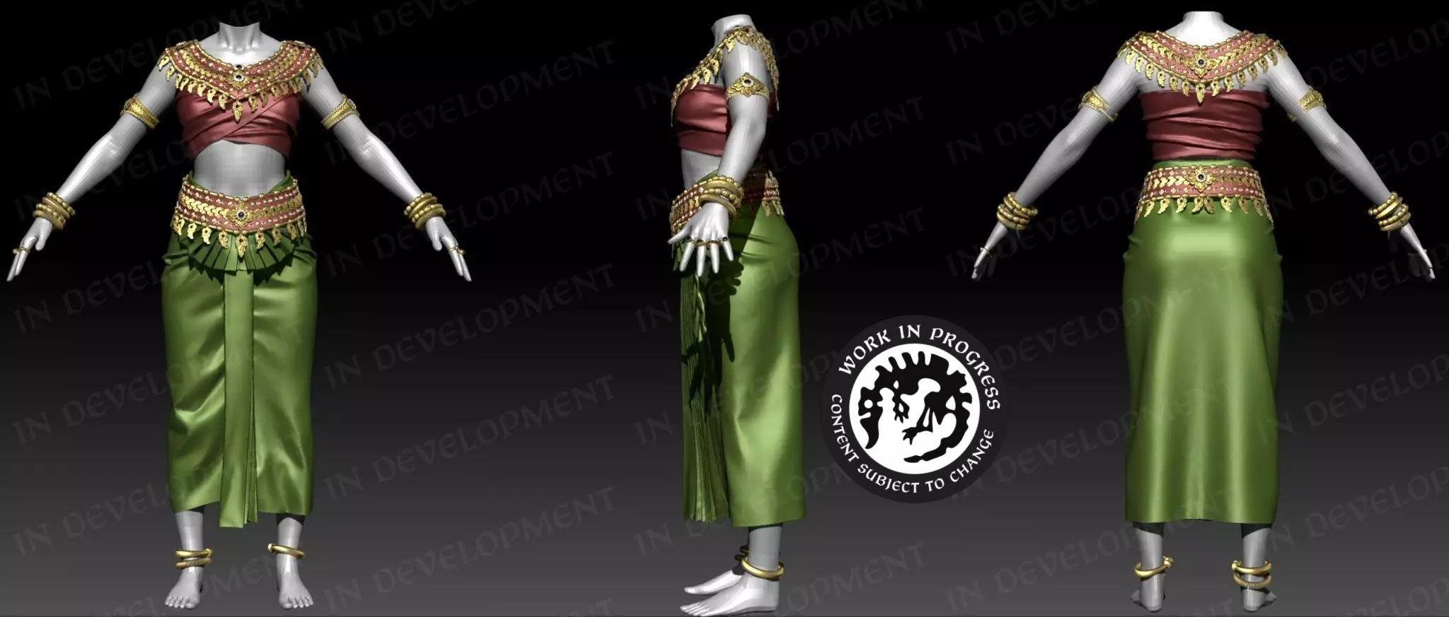 【日本地图单位】 高棉帝国 高棉帝国(9-10世纪)影响角色服饰,着重展现吴哥时期风格的华丽。皇室服饰,如纱笼(一种长裹裙),配有金色腰带和精致的王冠或头饰,通常为国王或高级官员所穿。 神庙舞者(或飞天)服装通常采用飘逸的丝绸服饰和精美的珠宝,通常搭配大型且装饰繁复的王冠或头饰。