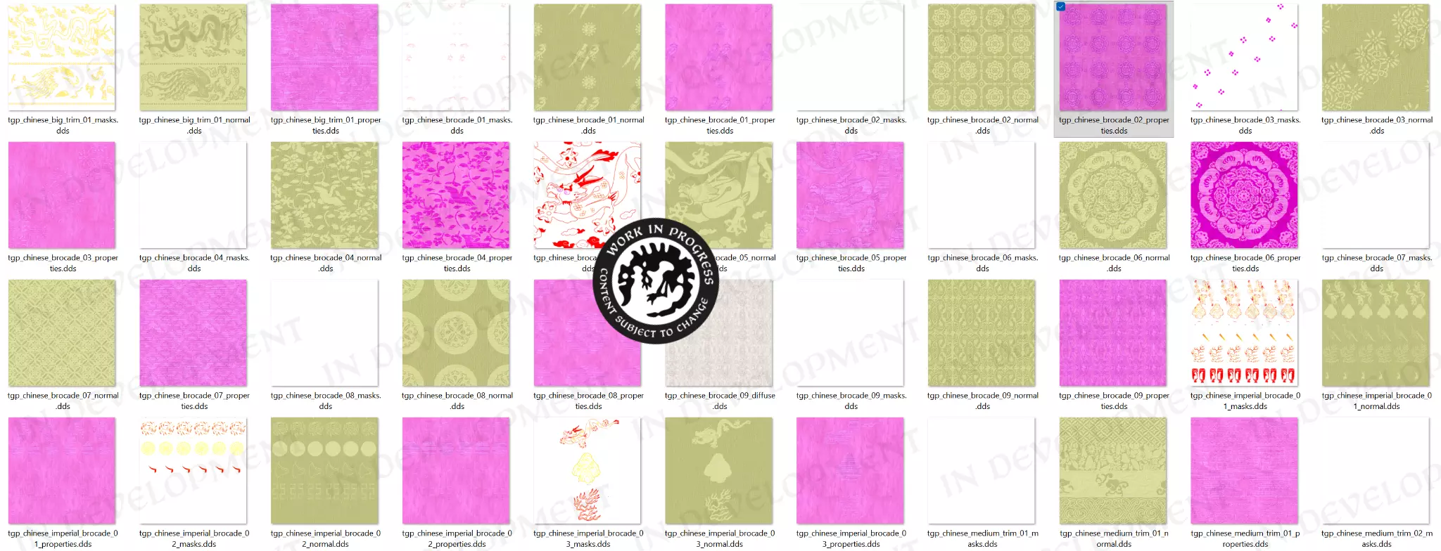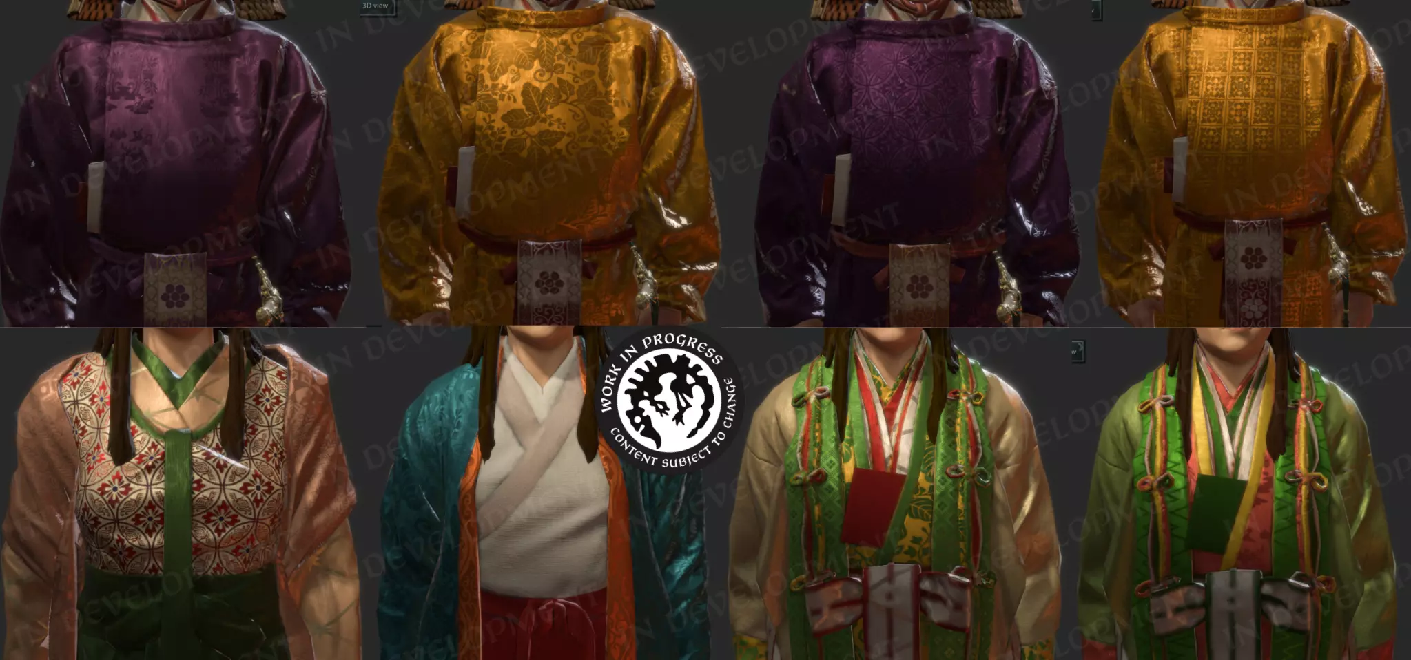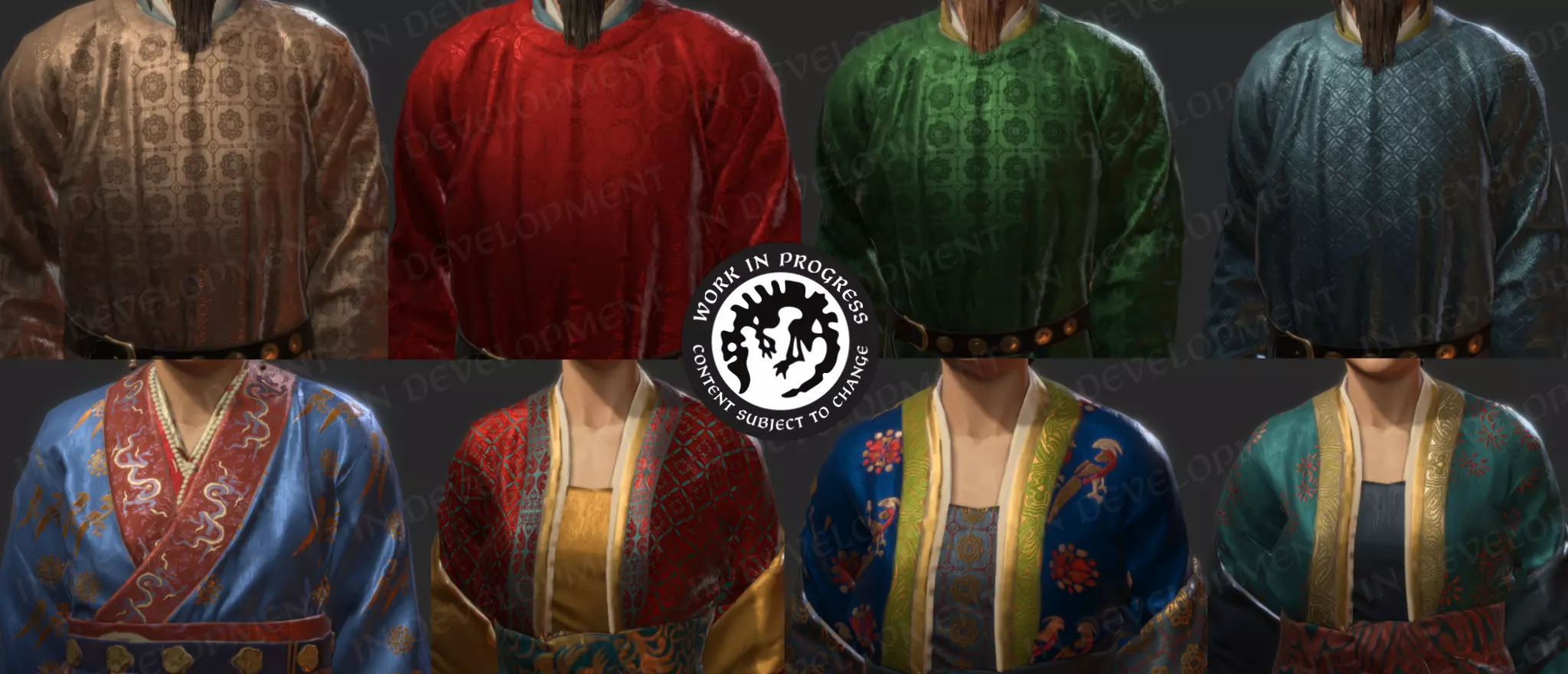 【纹样纹理】 中国历代王朝对服饰的颜色、面料和剪裁有着严格规定,因此我们在游戏中开发了一套根据品级对服饰进行分类的系统。我们的方法是使用特定的色彩组合,根据颜色差异对服装进行分类。随后通过脚本实现,例如官员角色会根据其品级穿着不同颜色的官袍。 我们希望这一系统能让玩家更清晰地了解服饰美学在中国古代身份地位和等级制度中所扮演的角色。