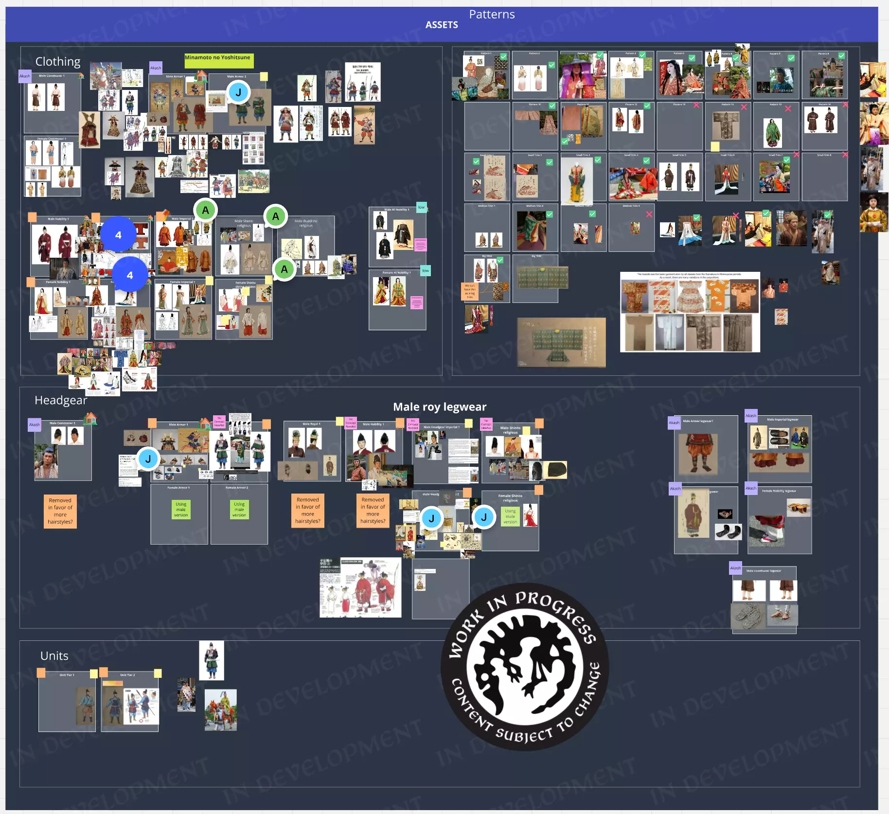 【一个穿着带有家纹装饰服饰的家庭】 研究与参考资料 与之前制作中式服饰的流程类似,对于日式资产,我们首先从以下渠道收集历史参考资料: 古代壁画、博物馆藏品(例如故宫博物院、历史博物馆) 专注于日本历史的书籍和网站 至今仍在皇室仪式以及历史重现活动中使用的图案 我们为日式系列单独设立了情绪板。