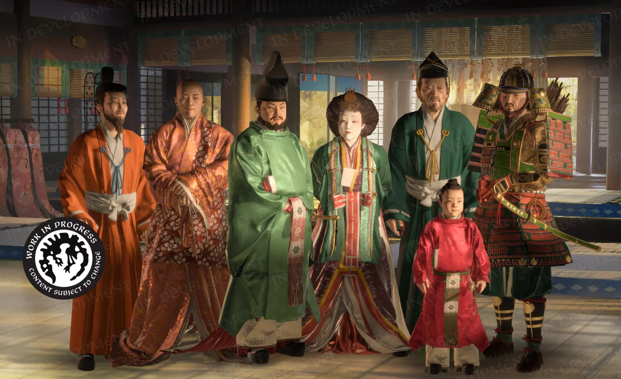 这是平安时代服饰与重要贵族所穿礼服的结合。男性官员身着束带,其妻子则穿着十二单衣。有两名男子穿着不太正式的服装,第三名男子身着全套大铠,还有一位身着日式袈裟的佛教僧侣。