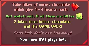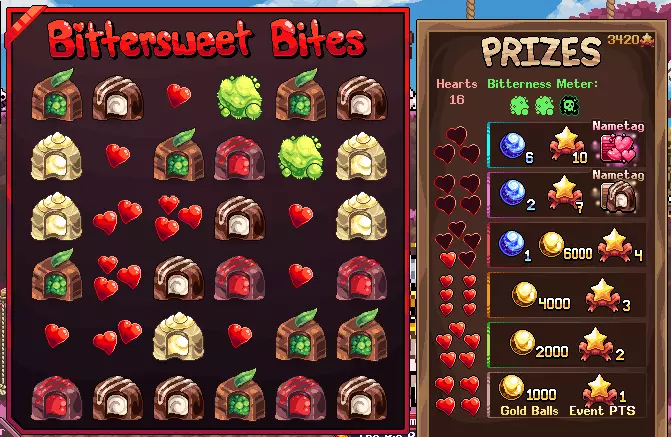 在世界1城镇中游玩全新的【苦甜之咬】游戏! 品尝甜巧克力块,同时避开苦味的……唯一的问题是,无法分辨它们!奖励包括【美好时光】名牌、全新的【巧克力名牌】、金球,当然还有活动积分! • 多种获取【苦甜之咬】的方式: 1. 从怪物身上收集全部50个巧克力盒。每天可获得+1! 2. 保持游戏运行,【苦甜之咬】游戏界面的右下角会显示确切的计时器。