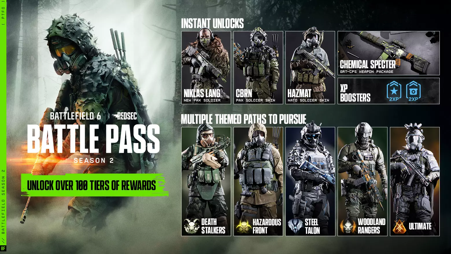 第二季战斗通行证 提升你的装备等级。立即解锁6项奖励,并参与4条全新主题路线,其中包含新装备、武器包、士兵皮肤、经验值加成等内容。完成这些路线即可解锁终极路线,其中包含更多奖励,助你掌控战场并取得胜利。