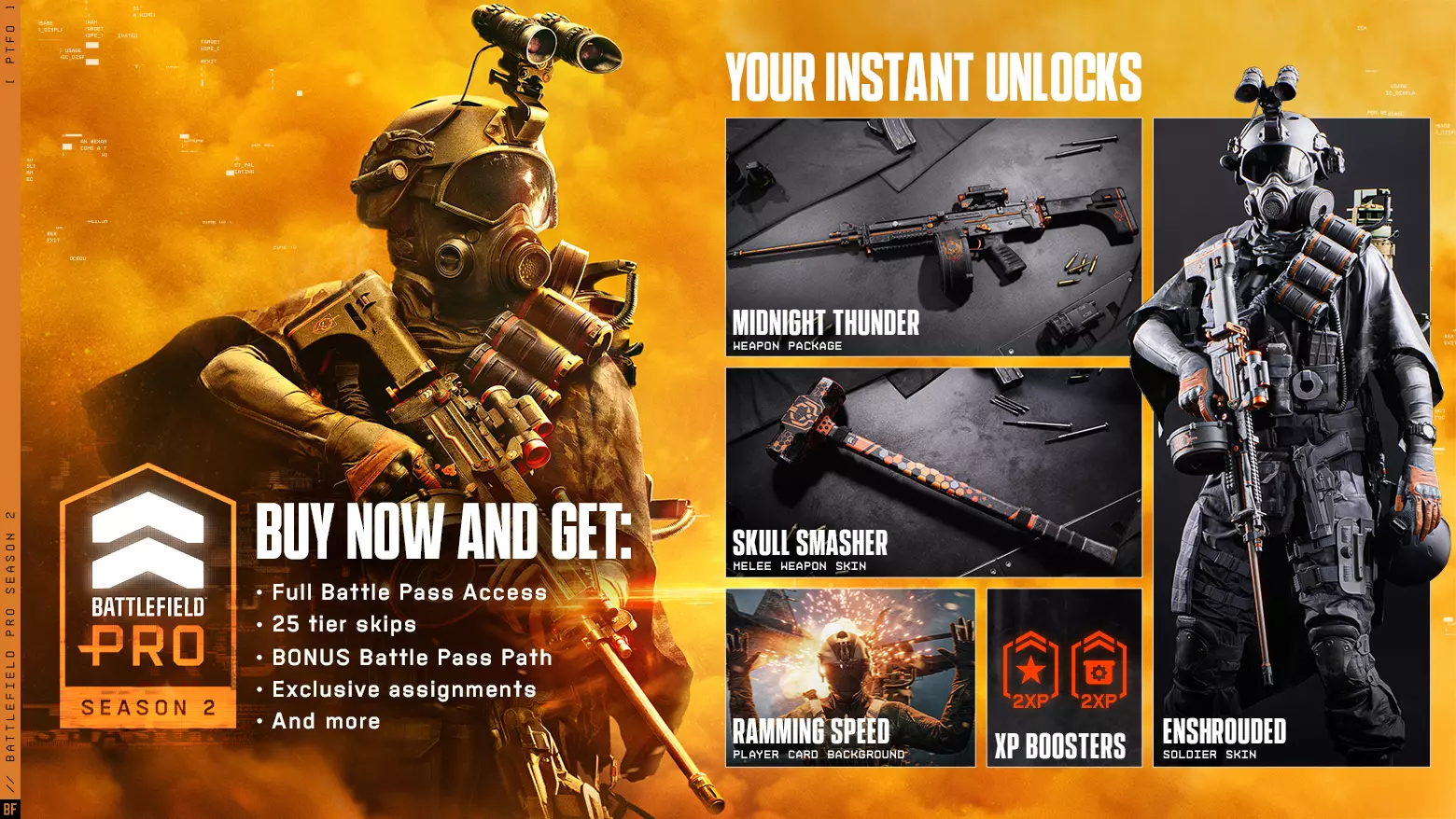 战地专业版 通过战地专业版领先战斗。获得6个即时战地专业版解锁内容、25个等级跳级,并深入专有的奖励路线,其中充满了战术装备,旨在增强你的武器库,让你在前线占据优势。准备就绪,全力以赴。