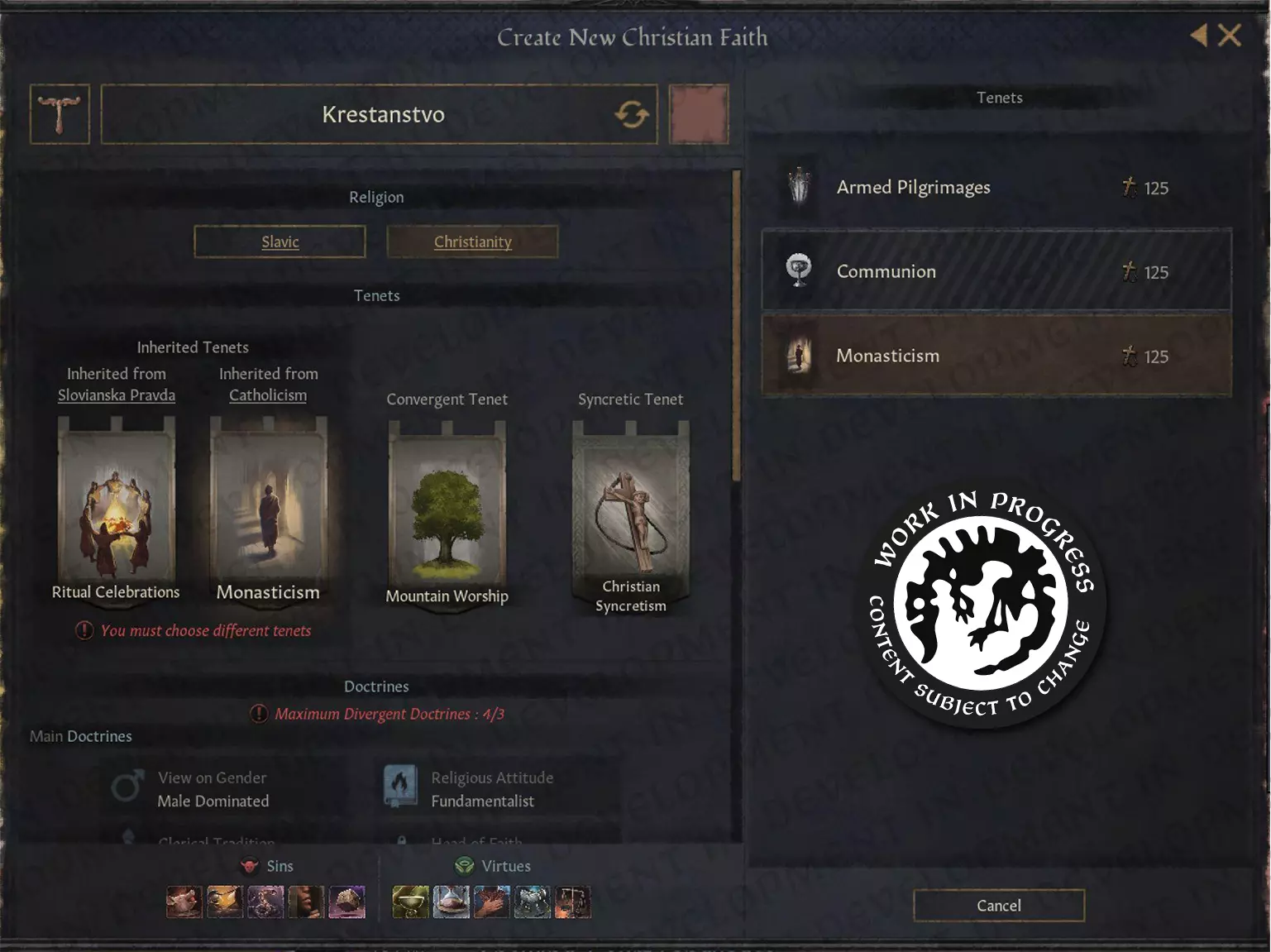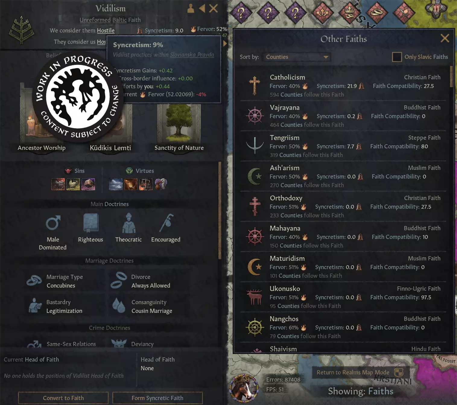 【图片:信仰融合项目团队的Miro白板】 那么,他们在短短几天内完成了哪些工作呢?成果非常多。其中包括创建融合信仰的能力、信仰兼容性概念、异教杰出人物宫廷职位、融合倾向……这还远非全部。 不过,到底什么是融合呢?问得好。简而言之,融合是衡量一种信仰从另一种信仰中吸收传统程度的指标。在这个系统版本中,融合倾向每年会朝着两种信仰之间的“兼容性值”变化,同时受到狂热度等因素的影响。两种信仰的融合度很高吗?恭喜,他们现在对彼此的敌意有所减轻,用《十字军之王》的话来说,就是不会再有那么多愤怒的邻居因为你不小心祈祷错了神灵而试图放火烧你的房子了。