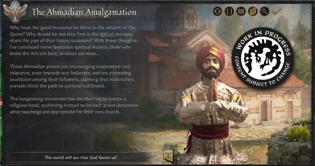 【图示:混合信仰创建后的事件窗口】 你可以指派宫廷牧师前往某一伯爵领,促进你的信仰与当地信仰的融合。这也会降低你的信仰狂热度,以促进自然融合,而宗教关系则会提升信仰狂热度来抵消这种效果。