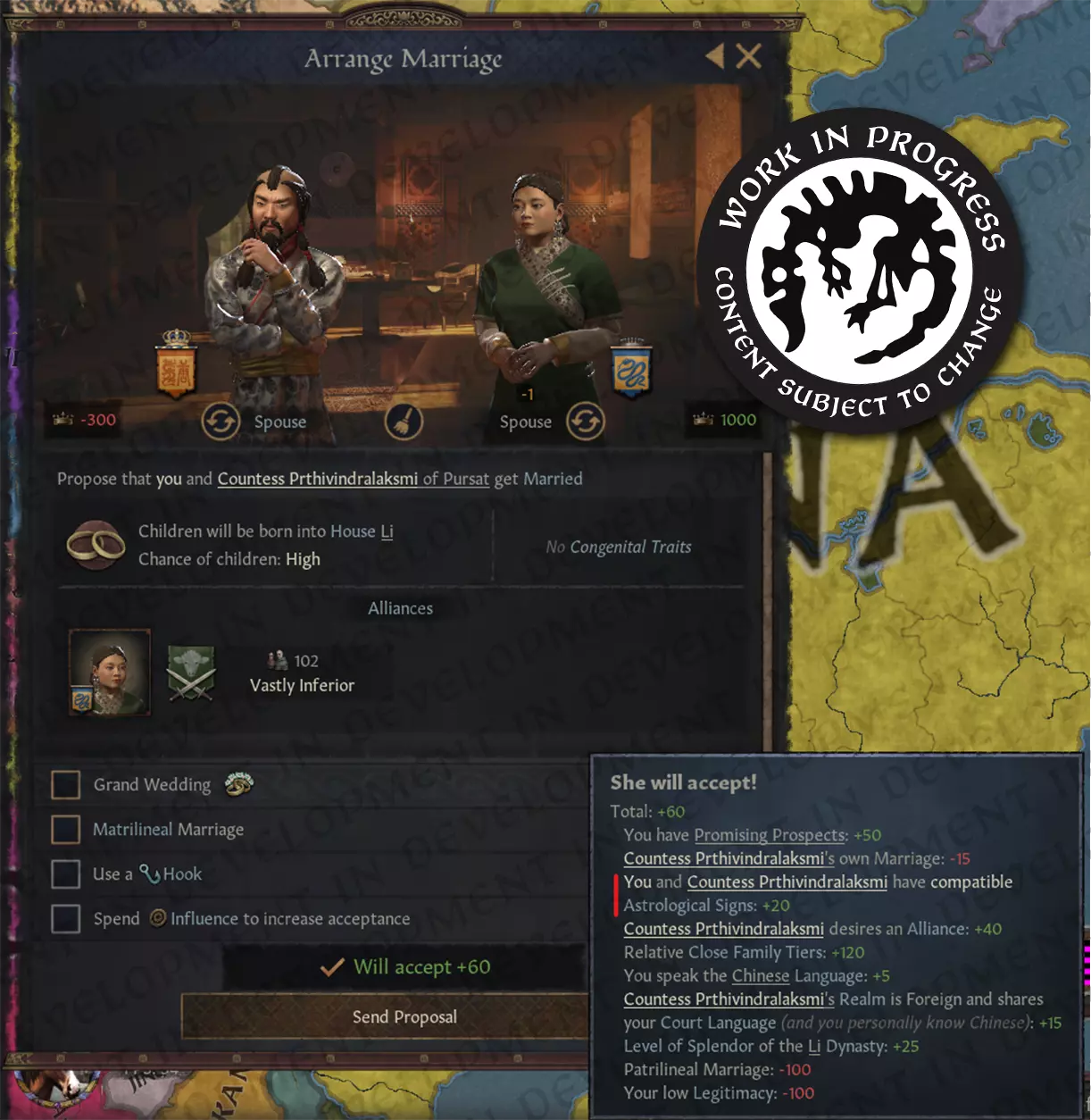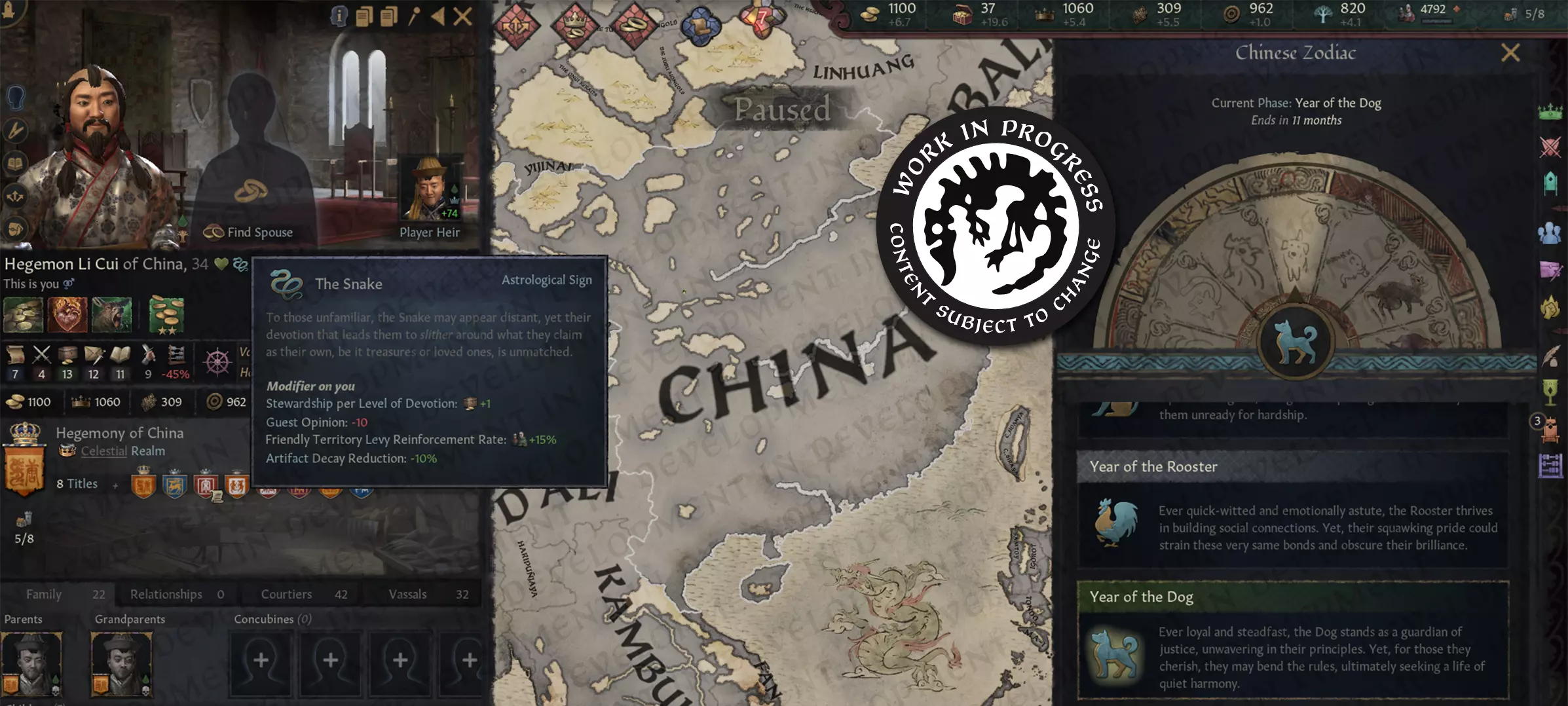 【图片内容:将外交关系扩展到不列颠群岛,以了解更多政治格局】 ✨星象仪✨ 我现在可能有点偏心,因为我确实加入了这个团队。但还记得我之前说自己没什么有用技能的那部分吗?唉……不幸的是,那不是玩笑。 幸好,我们的团队负责人查德林很仁慈。他给了我一个任务:“嘿,里亚德,就为12个 zodiac signs(星座)想些风格文本吧。这应该花你一个小时,剩下的我们来处理。” 各位读者,我花了整整五天。 星象仪为《十字军之王3》引入了一个占星系统。角色会根据他们的出生日期获得 zodiac signs(星座),这会影响他们的特质、人际关系,当然也给了大家新的理由去欺负天蝎座——不只是在抖音上,在《十字军之王》里也是如此。在开发即将推出的大型扩展包【天下一家】时,我们以中国 zodiac(生肖)为基础。当然,这是简化版,不过其中包含了12个生肖符号,每个符号都有与当年相关的主动和被动效果。如果你出生在狗年,“你的”年份将充满挑战与变革,你的能力会受到考验。