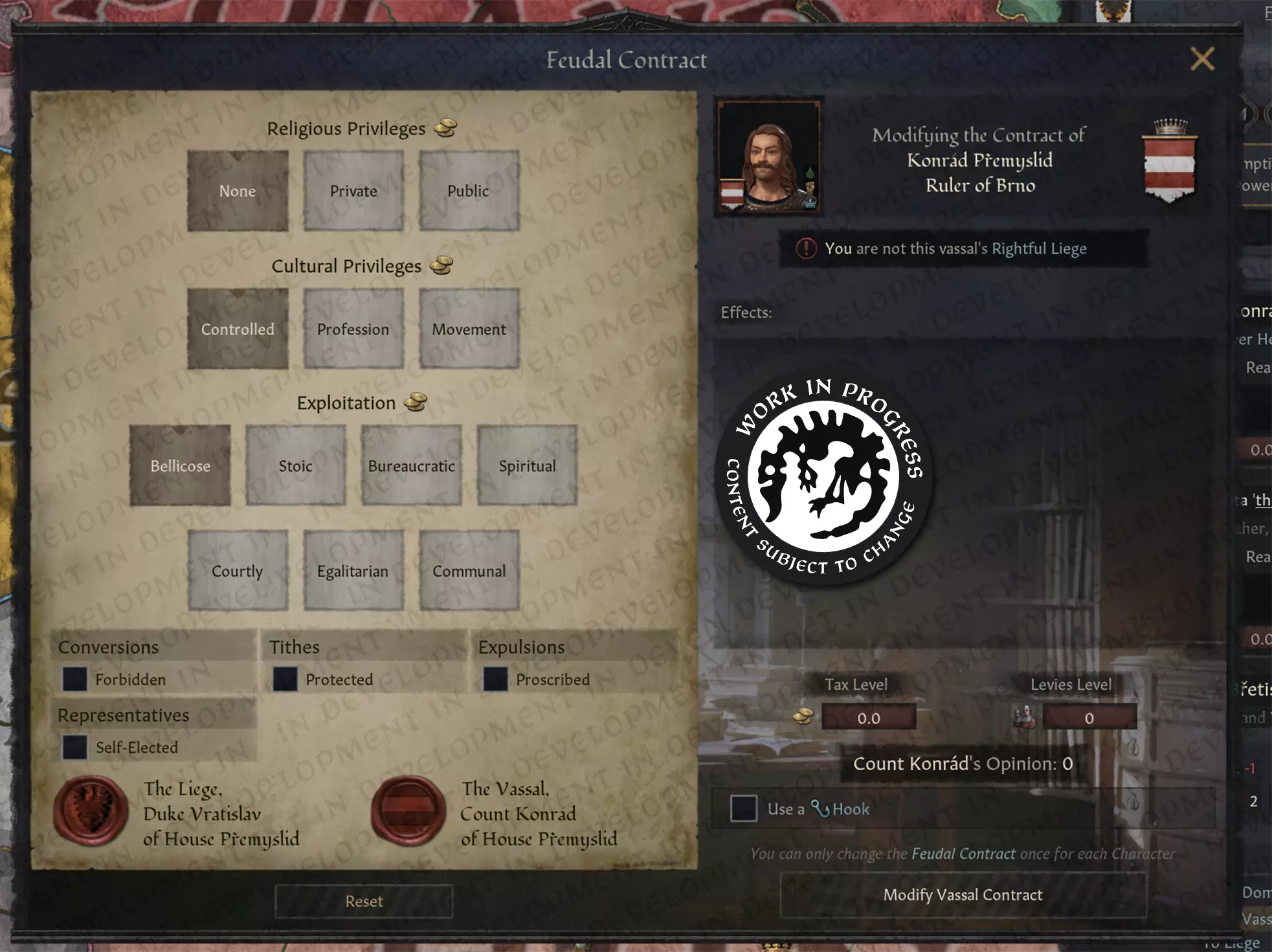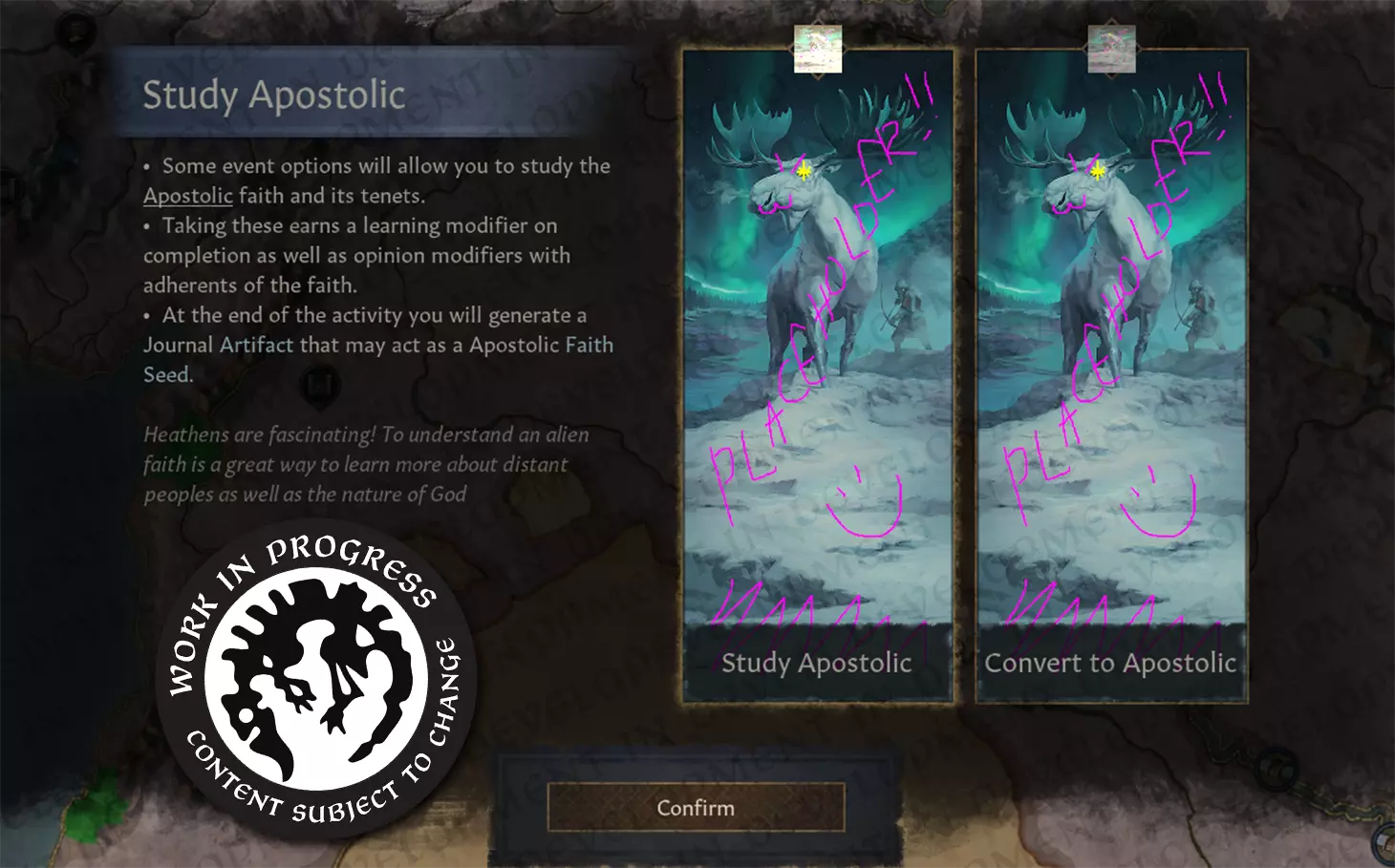【图片:分配牧师时的宗教融合地图模式】 这个系统还有更多内容,但就像我之前说的,我不想剧透太多。这真的是我希望有一天能在游戏中看到的东西。 而且因为我是个“坏人”,我还占用了Gertax的时间,为这篇开发日志做了个简短采访。谢谢你,Gertax,你最棒了。 问:你好 答:嘿! 问:今天感觉怎么样 答:我今天状态非常“STP”。 问:你为什么为这次游戏开发赛想出这个项目? 答:我觉得信仰创建有点太像街机游戏了,玩家可以直接凭空创造出一些奇特的东西,而不是让它从不同宗教思想的交汇中自然发展而来。这种变化会是突然发生的,而非两种不同信仰的信徒之间持续互动的结果。我认为新系统还能让AI统治者创建自己的融合信仰,同时不会给玩家带来太多叙事上的不协调感。 问:在这个果酱项目的工作中,你最喜欢的部分是什么? 答:在这个项目的工作中,我最喜欢的部分是和团队坐在一起,为项目想出系统性的解决方案。 问:你会给我们的粉丝什么鼓舞人心的人生建议? 答:为他人而活,你自己的烦恼就会显露出它们真正的意义。 暗土 除非你一直与世隔绝(或者只是社交生活很健康),否则你可能听说过Jp78制作的mod obfusCKate。这是一款出色的模组,它会隐藏角色在逻辑上不应知晓的信息,比如谋杀计划的确切成功率,或是某个素未谋面的伯爵的具体属性。这是我最喜欢的模组之一,我推荐所有人都尝试一下(不过遗憾的是,模组作者目前已暂停更新)。