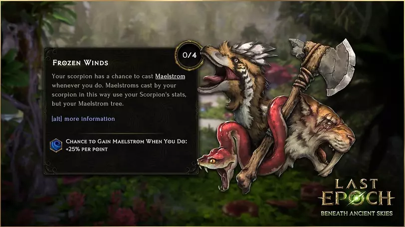 通过此节点,你的迅猛龙将进化为龙形迅猛龙。这不仅听起来很酷,还能让你的迅猛龙在造成火焰伤害的同时,获得新技能【火焰吐息】。在这个全新的转化节点之后,还会有其他有趣的节点——这正是进化的最佳体现。 此外,随着这些变化,蝎子也将通过其新节点【冰封之风】获得与你一同释放【漩涡】的能力!