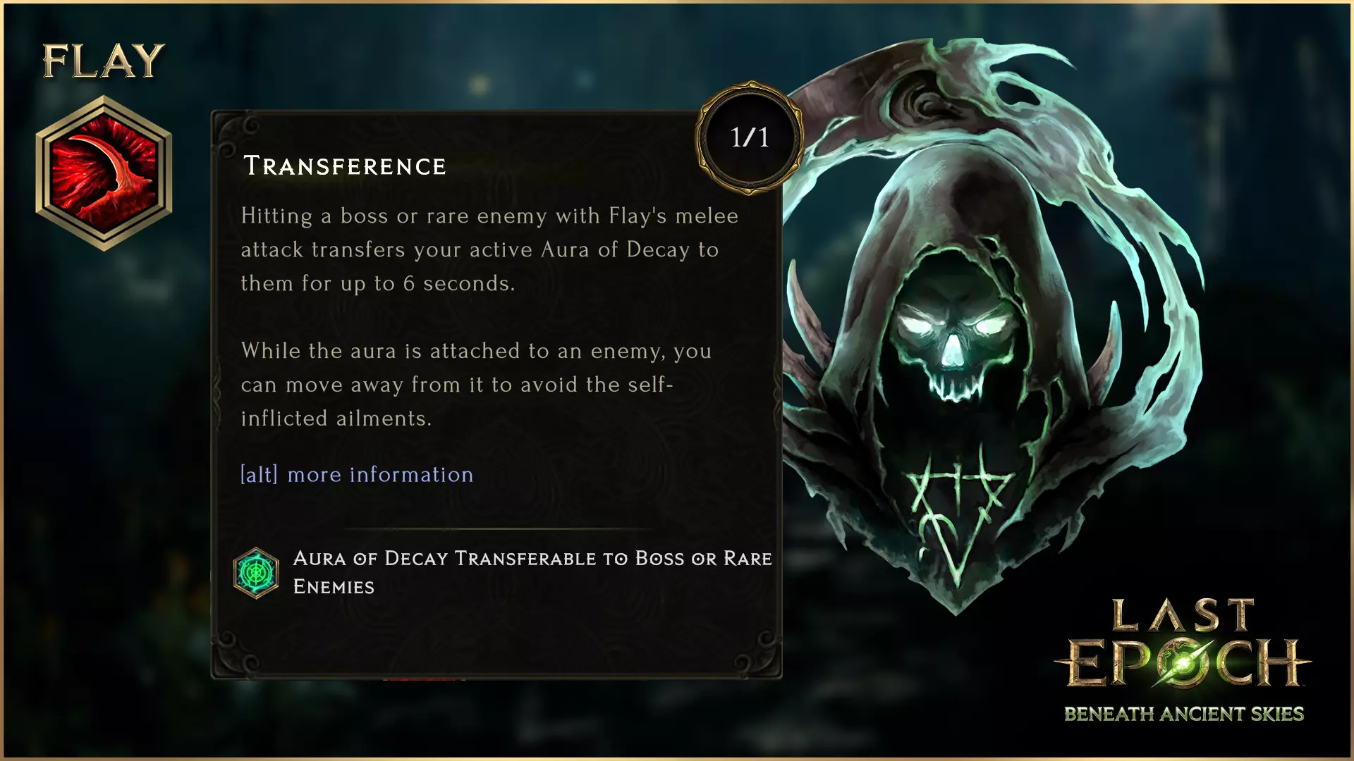 转移 当用剥皮的近战攻击击中首领或稀有敌人时,你激活的腐朽光环可转移并以该敌人为中心持续6秒。当光环附着在敌人身上时,巫妖可以离开该区域,且不再受到腐朽光环造成的自身减益影响!