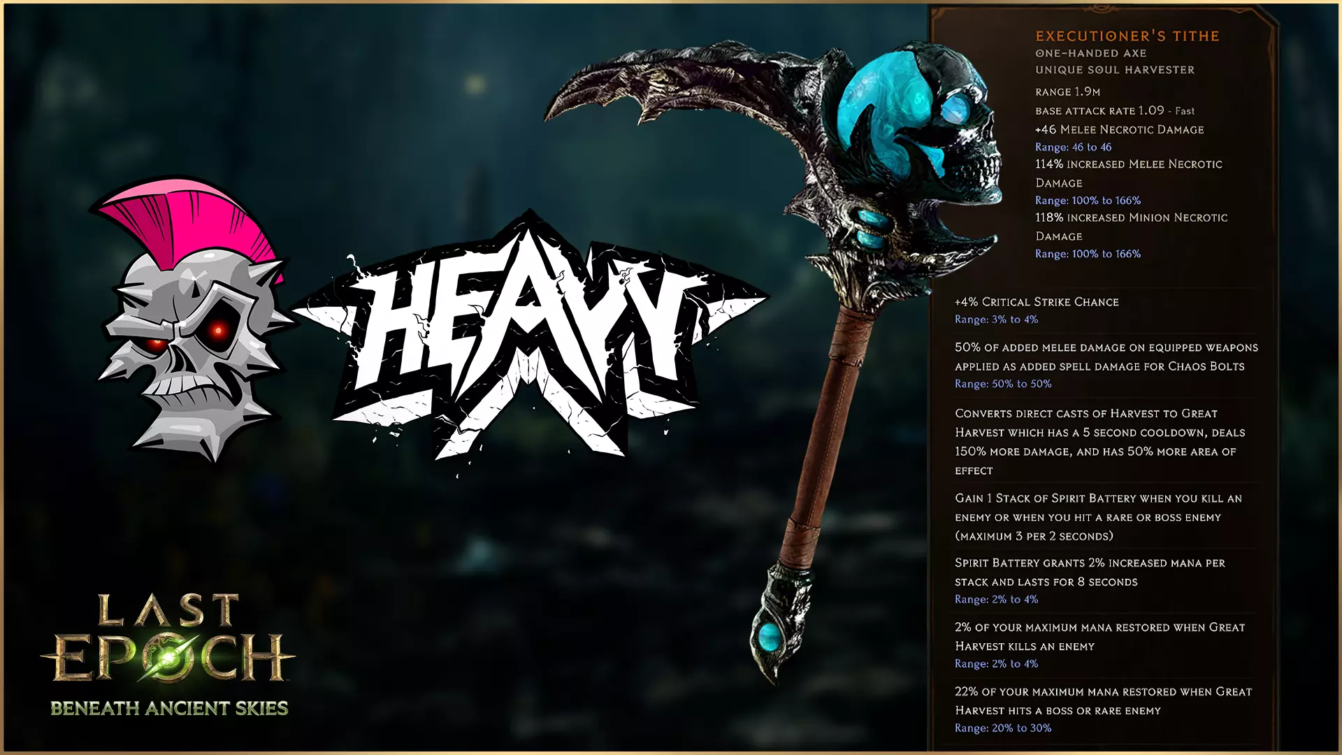 【刽子手的什一税】 剥皮者还将迎来一件特别的全新暗金装备,这件装备由我们的长期社区支持者“Heavy”设计。许多玩家都知道,Heavy从游戏早期就一直是社区的重要成员,他参与了“蜜蜂之友社区指南计划”和“社区测试者计划”,并且在社区中积极帮助其他玩家。 【刽子手的什一税】是早期“设计暗金装备”支持者礼包的一部分。虽然我们目前不再提供该等级的支持者礼包,但我们很高兴能看到社区的独特创意,并与社区合作,为《最后纪元》带来新颖有趣的玩法。如果你有关于独特物品的想法,一定要前往我们的建议论坛分享给我们! 继【死亡之拥】之后,【刽子手的什一税】是Heavy为侍僧,尤其是巫妖设计的第二件独特物品。