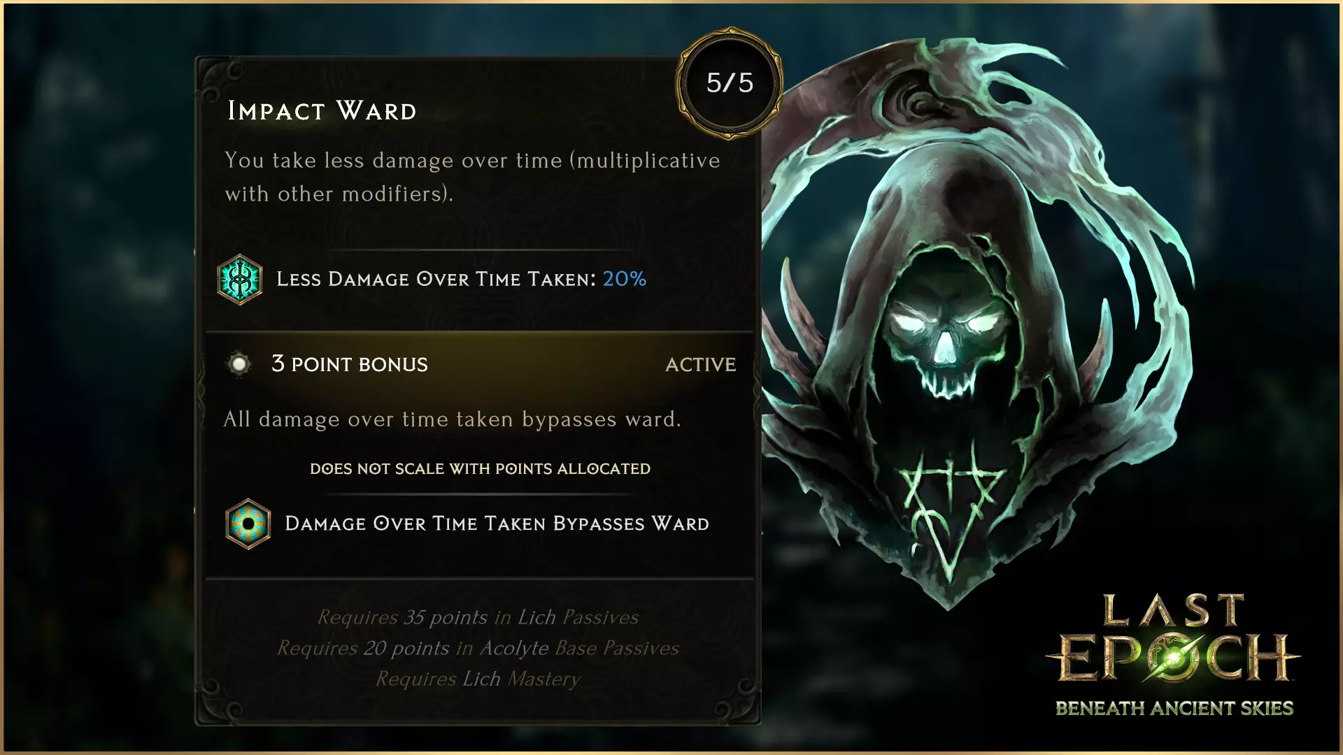 【冲击守护】将取代【腐朽印记】。每点【冲击守护】使受到的持续伤害降低3%,且存在3点阈值奖励,可获得被动效果【所有受到的持续伤害绕过守护】。这提供了一种与守护互动的独特方式,能利用生命偷取和混合生命池,同时仍借助守护吸收伤害。 死灵法师 禁忌教义