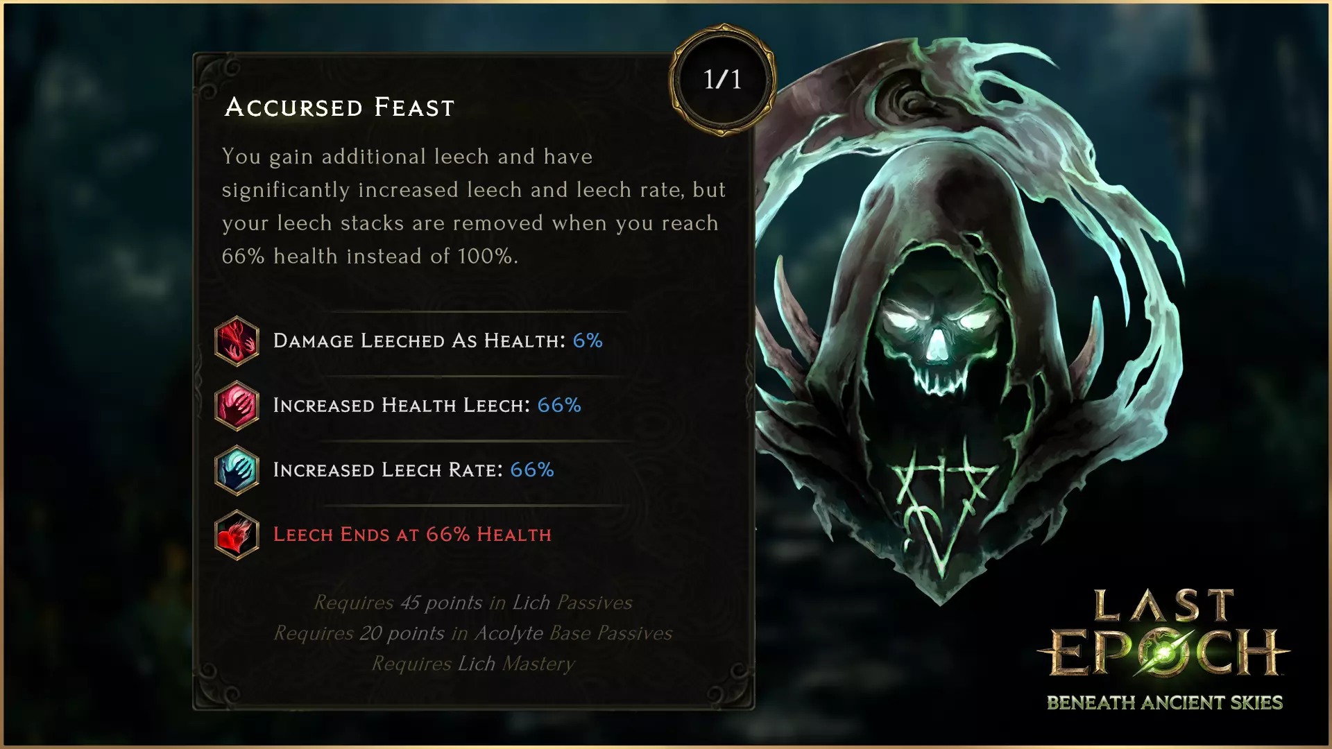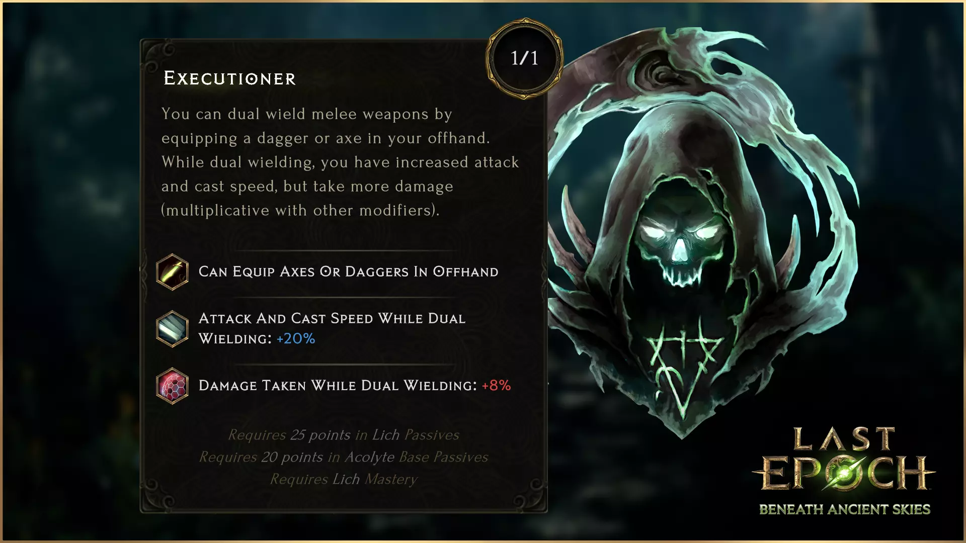 刽子手是巫妖可用的新节点,需在巫妖技能树中投入25点后解锁。解锁刽子手后,你将能够双持武器,副手可装备斧头或匕首。该节点还会使攻击速度和施法速度提升20%,但代价是受到的伤害增加8%。双持能力为巫妖带来了许多新的build机会,并且现在可以搭配死神形态的视觉风格。其他职业的双持节点也将进行相同调整:受到的伤害增加8%,同时提升攻击速度和施法速度。 Accursed Feast