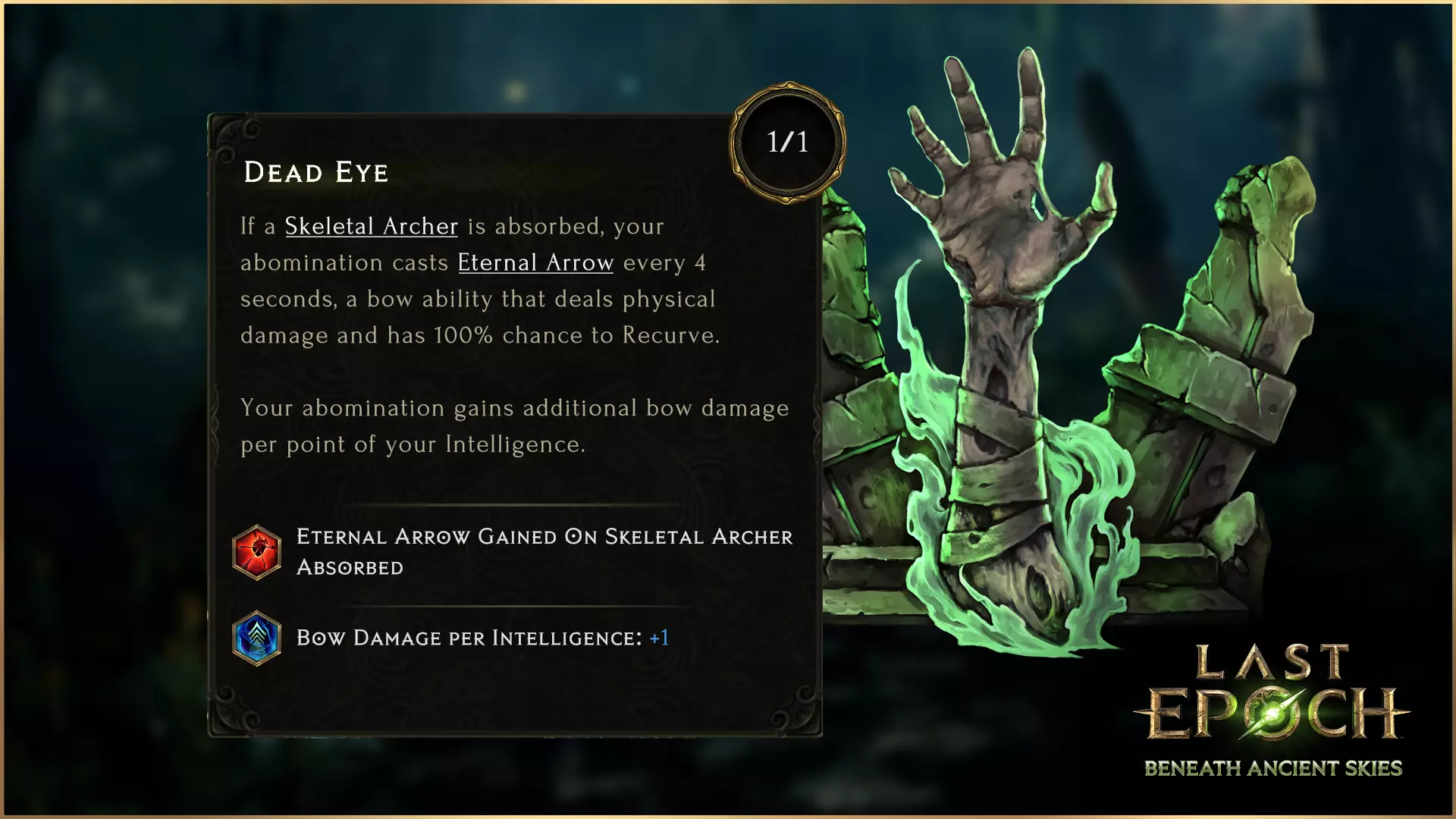 新增了一个名为【死眼】的憎恶节点,该节点会运用骷髅射手的力量,以100%的概率释放【回曲永恒箭】。此外,该节点还能基于每点智力值提供额外伤害,为角色带来可观的额外伤害加成,而这种加成在通常情况下是相当稀缺的。 技能树中新增了多种节点,并对部分既有节点进行了调整,使你能够根据自己的喜好来打造憎恶角色。去吧,去探索并创造出终极的恐怖造物! 巫妖 - 腐朽光环 【腐朽光环】曾是备受瞩目的技能,但后来逐渐被遗忘。我们对其进行了多项强力改动,旨在让它重新成为巫妖技能库中的一个强势选择。