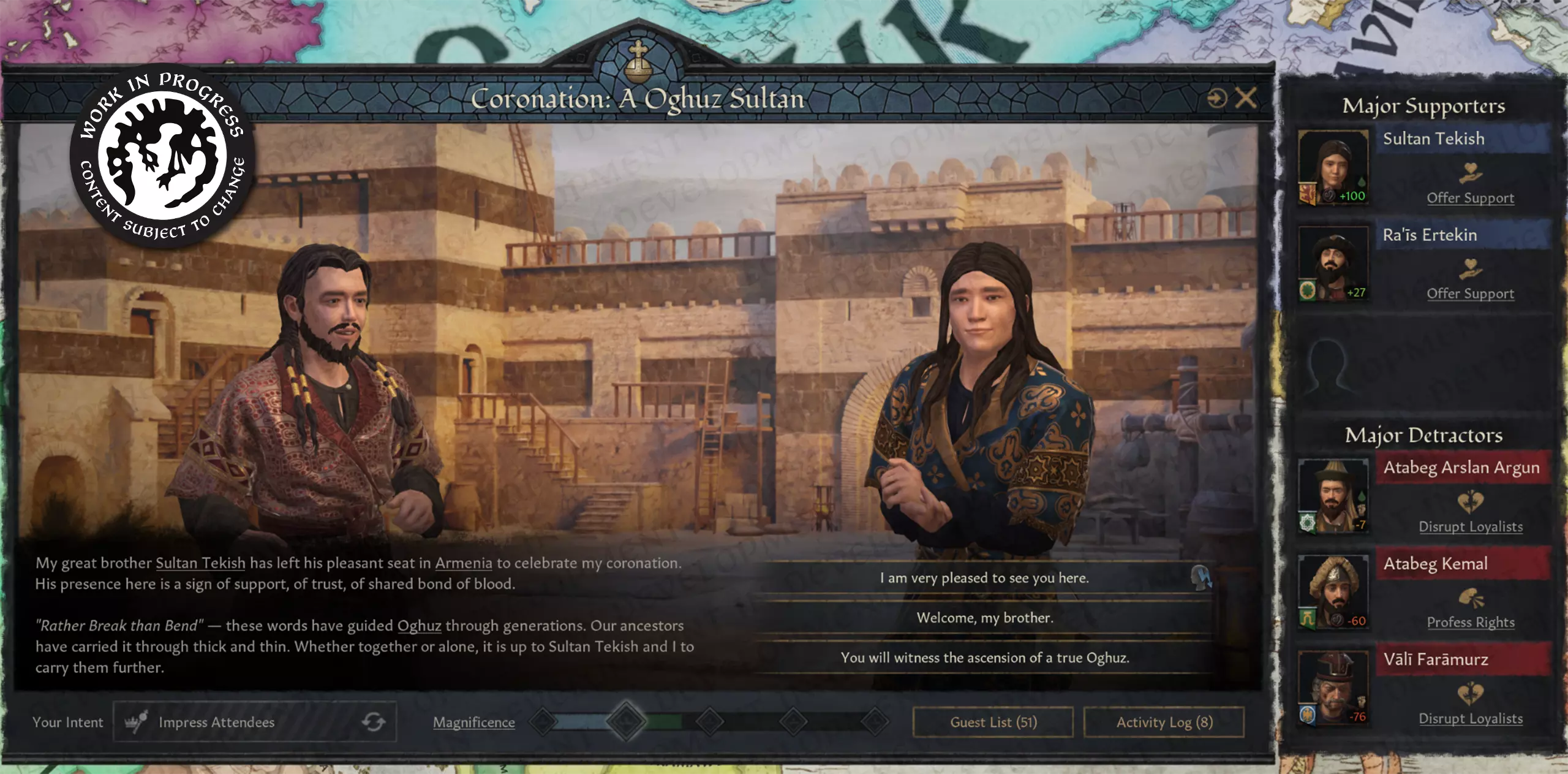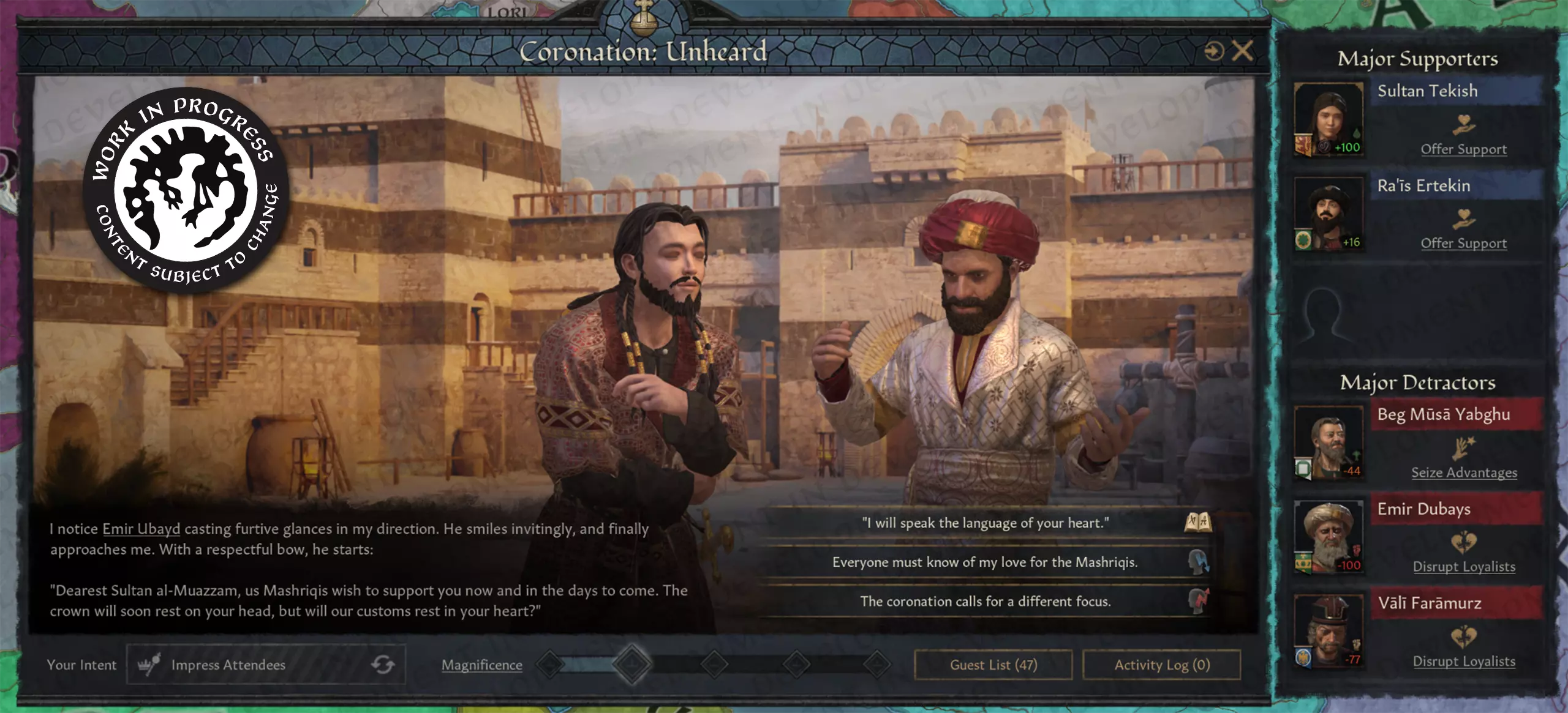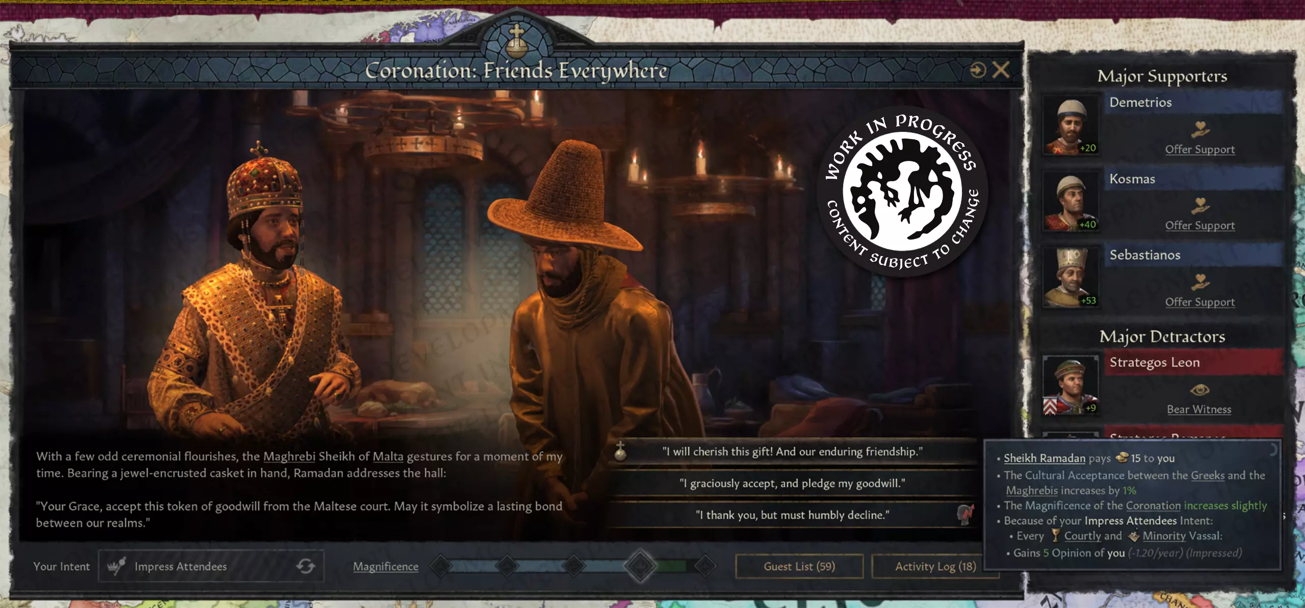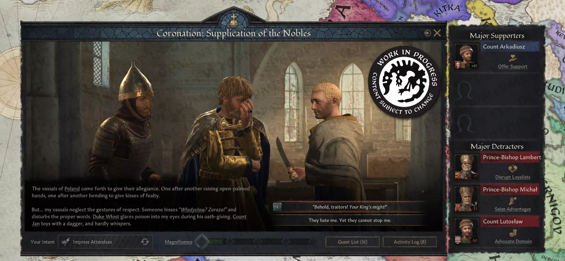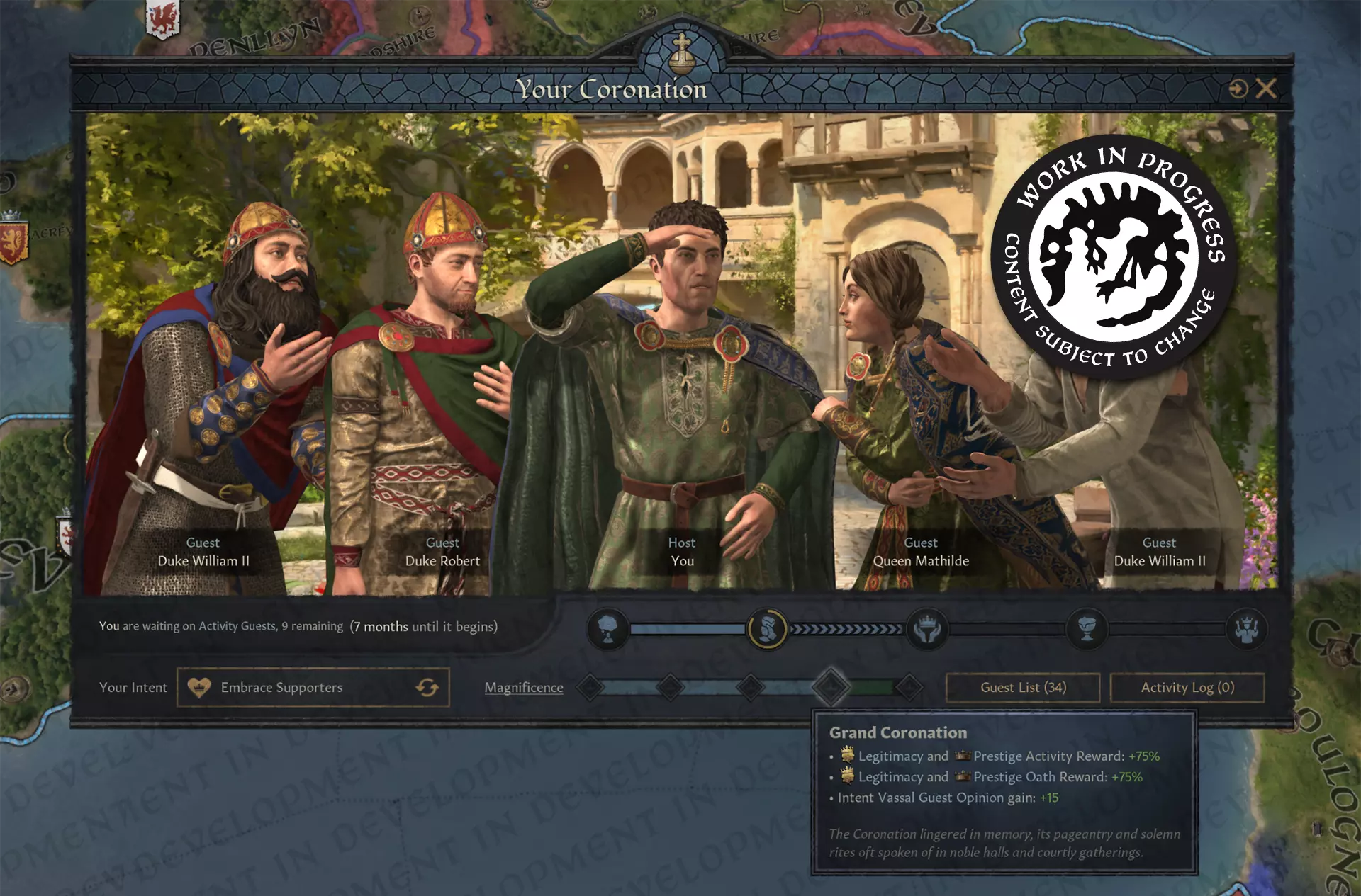 【保持一切的宏伟感,你就不会失望】 君主与宾客的互动 国王的加冕需得到教会、贵族的认可,或许还有普通民众的支持。加冕仪式旨在彰显所有这些关系,并为君主与宾客双方提供探索这些关系的途径。为此,我们在加冕活动界面中添加了一个组件,帮助你追踪加冕礼上最有影响力的支持者(即喜欢你这位君主的角色)和反对者(那些不友好的人)。这些分组仅在该活动中有效,但会对活动结果产生重大影响。