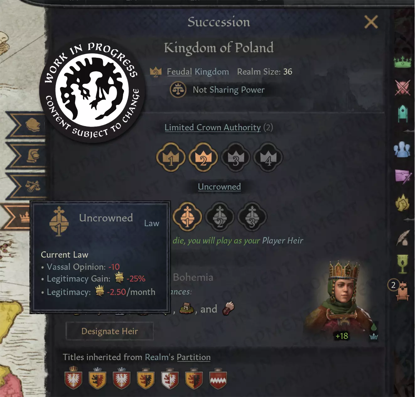 【这些封臣似乎不太喜欢我】 相反,如果你的继承过程像热吐司上的黄油一样顺利,那么加冕仪式就会变成一场自我表扬的绝佳活动。一位深受爱戴、能力出众的统治者完全有权利获得新的修正、货币和奖励! 即将发布的开发者日志将深入探讨加冕活动和宣誓机制的具体细节。我现在为你呈现的是一个顶层概述。 加冕活动 加冕是国王和皇帝可进行的一种新活动类型。它伴随着一项新的王国法律,该法律规定统治者是已加冕还是未加冕。未加冕时,你将遭受好感度和正统性的惩罚;成为已加冕的唯一途径是举办加冕仪式。活动和新法规均为DLC专属内容,不会对未购买此活动包的玩家造成影响。