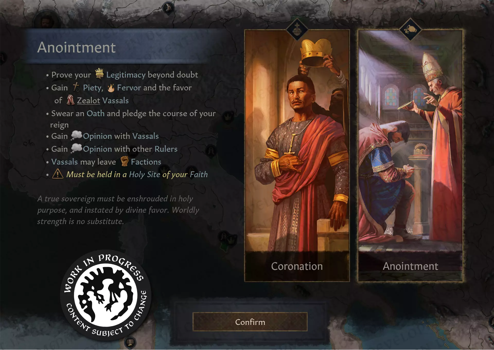 【剧透预警?】 愿景 在这款事件包中,我们尝试了与《流浪贵族》《守卫与典狱长》以及《朋友与敌人》所采用的模式略有不同的设计:以往的这些事件包会在游戏中分散设置一些有趣的风味内容,而《加冕礼》则是一个单一、独立的捆绑包,包含高度可见且对游戏机制有重大影响的内容。你无需费心寻找它。当你……死亡时,或者更准确地说,当你登基为王时,这个DLC就会伴随着盛大的仪式和期待感呈现在你面前。无论是哪种情况,都标志着新的开始。 没错,这款DLC将重点完全放在新王朝的开端,也就是你作为君主的最初几年。那往往是充满戏剧性的岁月,不是吗?这里有派系、觊觎者、新的盟友、顾问与对手,还有新的目标等待设定,新的疆域有待探索。你的统治者的加冕仪式不会与这些新的恐惧和新发现的喜悦隔绝开来:我们的目的是让这项活动帮助他们适应自己的新地位。它应该突出你的新敌人,并帮助你识别新角色力量的来源。通过举行加冕仪式,你或许希望在没有战争压力的情况下,解决我们都很清楚的新统治初期问题(如派系、觊觎者等)。然而,这最终可能导致你的加冕仪式成为你受辱甚至被废黜的场合。不过不必担心,这样的灾难需要你在政治上犯下一些重大错误才会发生。