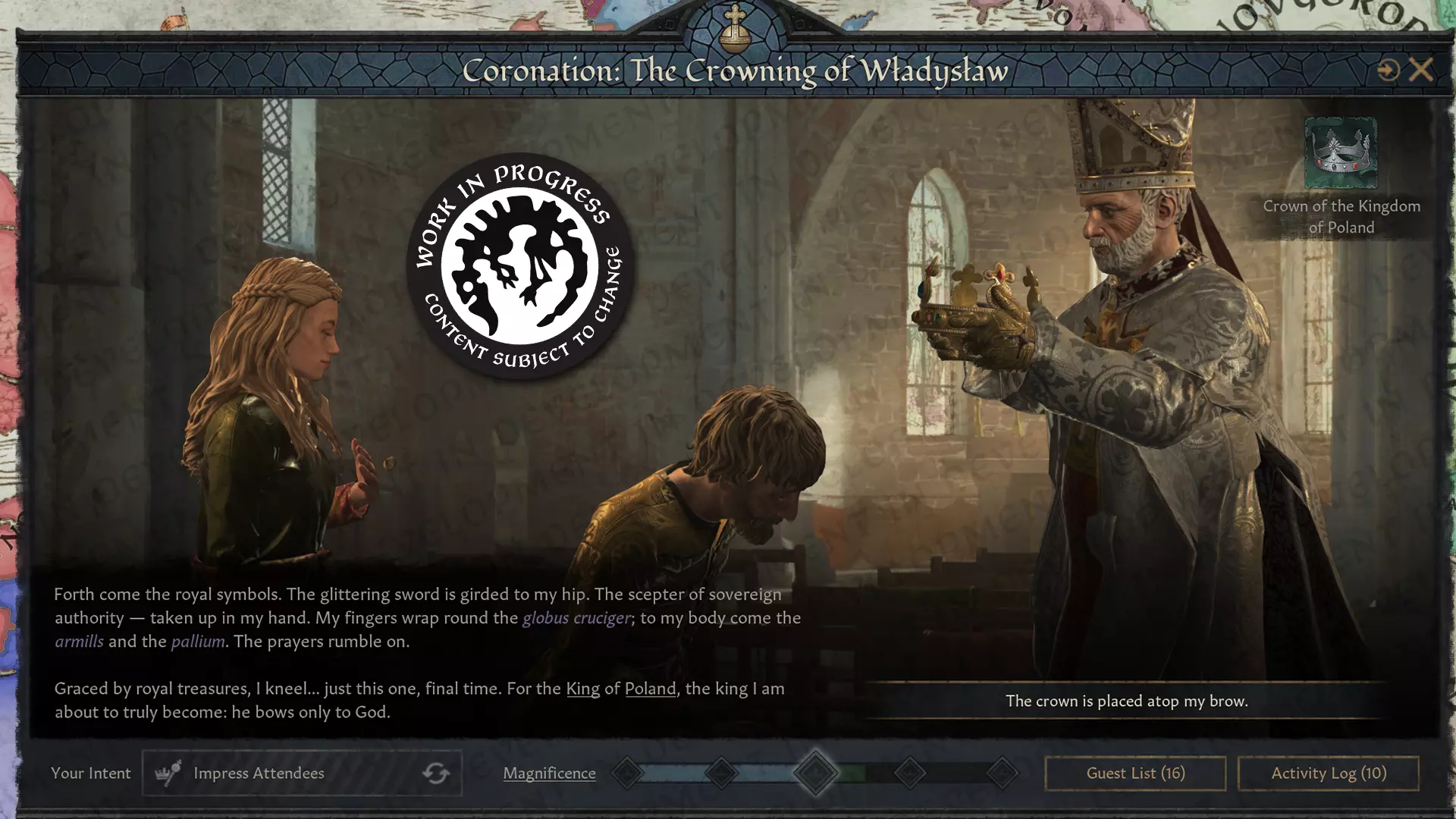 【新君主有大量机会了解自己的封臣】 我们设计加冕相关内容的指导原则是,打造真正具有帝王气派、历史厚重感的内容,足以配得上查理曼、成吉思汗以及伟大而正义的拉丁帝国的鲍德温(是不是到了破碎十字军的时间了?)。实际上,由于加冕仪式只有国王和皇帝级别的统治者才能举行……如果有人在别人的加冕礼上不敬主人,那这个人肯定有充分的理由,而且很可能会为自己的无礼付出沉重代价。 此DLC的主要区域特色内容集中在基督教和西欧地区。其中包含了中世纪加冕礼最广为人知的象征,此外——尽管基督教世界的加冕仪式在顺序和形式上各有不同,但它们的相对统一性着实令我感到惊讶。这并不是说不同信仰和政府类型没有触发事件和特色内容!只是这些内容比我们的【十字圣球】活动图标更难被发现。 盛典排场 正如我所提到的,加冕礼可能是一场轻松的漫步,也可能是一段艰难的旅程,这取决于统治者的能力、你所拥有的财富以及与会者的好感度。壮丽值是衡量加冕礼成功与否的主要指标,它决定了你的加冕礼会变得多么麻烦和难看——或者多么威严和光荣!它来源于加冕礼的筹备、主持人的行动,以及最重要的友好和敌对出席者的周旋。现在我只能说……除非万不得已,否则你可能不想在活动选项上吝啬。