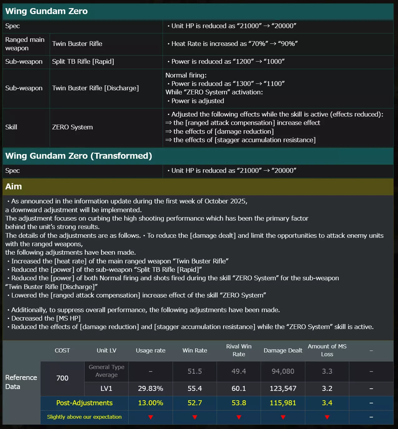 ■General Type 【F91】 Spec ・Unit skill “Optimized Cooling Efficiency LV1” is adjusted to “LV2” Ranged main weapon: F91 Beam Rifle ・Cool-down Time is shortened as “5.0” → “4.0” Sub-weapon: F91 Head-Mounted Vulcan ・Rate of fire is increased Sub-weapon: V.S.B.R. x2 ・Focus is shortened as “3.0” → “2.5” Normal firing: ・Power is increased as “1500” → “1600” ・Stagger accumulation value is enhanced ・ASL (automatic aiming compensation) range is extended Focus firing: ・Power is increased ・Heat rate charging is reduced Sub-weapon: F91 Beam Saber x2 ・Weapon switching time is shortened While skill “Mobile Melee Program” activating: ・Power is increased Sub-weapon: V.S.B.R. x2 [Discharge] ・Power is increased as “950” → “1000” ・Overheat is shortened as “30.0” → “20.0” ・Focus is shortened as “4.0” → “3.0” ・Stagger accumulation value is enhanced 【F90】 Spec ・Close range Part Slot is increased as “18” → “20” ・Mid-range Part Slot is increased as “22” → “23” ・Long range Part Slot is increased as “15” → “16” Melee main weapon: F90 Beam Saber ・Increased compensation for Downward melee attacks Sub-weapon: F90 Head Vulcan Gun x2 ・Ammo Amount is increased as “30” → “60” Sub-weapon:F90 Beam Rifle [Rapid] ・Cool-down Time is shortened as “0.8” → “0.5” ・Weapon switching time is shortened ・ASL (automatic aiming compensation) range is extended Sub-weapon: F90 Beam Saber x2 ・Power is increased as “2700” → “2800” Skill: OS “Type A.R” ・Effect time is extended ・Increase the following effects while the skill is active: ⇒Effect that reduces the chance of stagger caused by accumulated damage 【Zeta Plus A2】 Spec ・Unit Skill “Immobile Fire System LV1” has been given Ranged main weapon: Zeta Plus A2 Beam Rifle ・Cool-down Time is shortened as “0.6” → “0.5” Melee main weapon: Zeta Plus A2 Beam Saber ・Increased compensation for Downward melee attacks Sub-weapon: Beam Cannon x2 ・Power is increased as “1150” → “1250” ・Cool-down Time is shortened as “4.0” → “3.0” Sub-weapon: High Mega Cannon ・Cool-down Time is shortened as “5.5” → “2.0” ・Focus is shortened as “2.5” → “2.0” 1st focus stage: ・Power is increased as “2800” → “3500” 2nd focus stage: ・Power is increased 【Zeta Plus A2 (Transformed)】 Sub-weapon: Beam Cannon x2 (Transformed) ・Power is increased as “600” → “700” ・Heat Rate is reduced as “15%” → “14%” ・Rate of fire is increased 【Jagd Doga [Sleeve Type]】 Spec ・Unit HP is enhanced as “19000” → “21000” (Upper LVs are also enhanced) ・Close range Part Slot is increased as “13” → “15” (Upper LVs are also enhanced) ・Mid-range Part Slot is increased as “15” → “16” (Upper LVs are also enhanced) ・Long range Part Slot is increased as “14” → “15” (Upper LVs are also enhanced) Ranged main weapon: JD [Sleeve Type] BM ・Cool-down Time is shortened as “1.0” → “0.8” ・Focus is shortened as “2.5” → “2.0” Normal firing: ・Power is increased as “600” → “800” (Upper LVs are also enhanced) ・Stagger accumulation value is enhanced Focus firing: ・Power is increased ・Ammo consumption is reduced Sub-weapon: Missile x3 ・Power is increased as “550” → “800” (Upper LVs are also enhanced) ・Cool-down Time is shortened as “4.5” → “4.0” ・Reload is shortened as “10.0”→”8.0″ Sub-weapon: Funnel x2 [Focused Fire] ・Power is increased as “200” → “500” (Upper LVs are also enhanced) ・Stagger accumulation value is enhanced ・ASL (automatic aiming compensation) range is extended Sub-weapon: Funnel x2 [Pursue] ・Power is increased as “250” → “450” (Upper LVs are also enhanced) ・Heat Rate is reduced as “25%” → “23%” ・ASL (automatic aiming compensation) range is extended ■Raid type 【Zaku IV (IP)】 Spec ・LV1 Unit skill “Maneuver Armor LV4” is adjusted to “LV5” ・LV1 Unit skill “Forced Injector LV3” is adjusted to “LV4” ・LV2 Close range Part Slot is increased as “24” → “25” ・LV2 Mid-range Part Slot is increased as “19” → “21” ・LV2 Long range Part Slot is increased as “13” → “15” ・LV2 Unit Skill “Pursuit Melee Aux. Program LV1” has been given ・LV2 Unit skill “Power Accelerator LV2” is adjusted to “LV3” Ranged main weapon: Zaku IV (IP) Beam Machine Gun ・Ammo Amount is increased as “18” → “24” ・Weapon switching time is shortened Melee main weapon: Zaku IV (IP) Large Heat Hawk ・Increased compensation for Downward melee attacks Sub-weapon: Head Beam Cannon x2 ・Cool-down Time is shortened as “4.0” → “3.0” ・Overheat is shortened as “15.0” → “12.0” Sub-weapon: Funnels x6 [Pincer] ・LV2 Power is increased as “420” → “500” Sub-weapon: Funnels x6 [Pursue] ・Cool-down Time is shortened as “0.8” → “0.5” ・LV2 Power is increased as “310” → “400” Sub-weapon: Funnels x2 [Bombard] ・Power is increased as “230” → “300” (Upper LVs are also enhanced) ・Reload is shortened as “22.0”→”15.0″ ・Stagger accumulation value is enhanced 【ReZEL Type-C [Defenser a-Unit]】 Spec ・Unit HP is enhanced as “23000” → “25000” ・Close range Part Slot is increased as “20” → “22” ・Mid-range Part Slot is increased as “17” → “18” ・Long range Part Slot is increased as “11” → “13” ・Unit skill “Maneuver Armor LV3” is adjusted to “LV4” ・Unit skill “Forced Injector LV3” is adjusted to “LV4” ・Unit skill “Flight Control Program LV3” is adjusted to “LV4” ・Unit skill “Emergency Evasion System LV2” is adjusted to “LV3” Melee main weapon: ReZEL Type-C H Beam Saber Normal attack: ・Increased compensatio