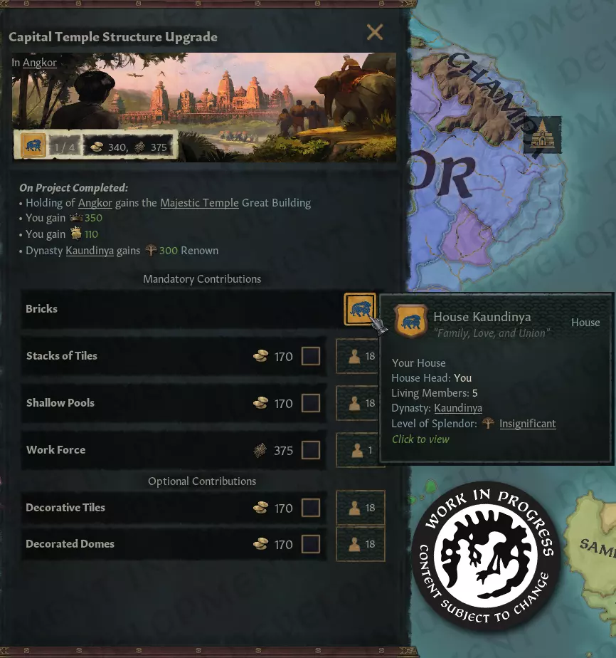 【正在开发中的重大项目窗口:曼陀罗资本升级贡献】 可选贡献 对于那些一心想要金色穹顶的人,还有可选贡献,可为贡献者带来额外奖励。 请求贡献 如果你刚开始你的曼陀罗之旅,或者你的子民因为某些原因需要额外的推动才能真正为你的项目贡献那些拱门,这里还有“请求贡献”按钮。 在其中,你可以通过各种手段激励他们响应请求,比如利用人情、贿赂,或者用你那令人压抑的虔诚精神迫使他们——任何能说服他们做出正确决定的方法都可以。一旦你完成最终等级——这可能是一项跨越数代人的成就——你将证明自己是一位合格的德瓦拉贾统治者,并将获得曼陀罗生活方式的巨大加成。 中国伟大工程 在中国,伟大工程更侧重于需要多方参与的大规模基础设施建设和其他改进项目;例如修建长城的部分段落或改善大运河。 这些项目让皇帝既能独自做出重大贡献,彰显其作为天子的威严与仁慈,也为那些渴望获得皇室恩宠的野心家提供了机会……