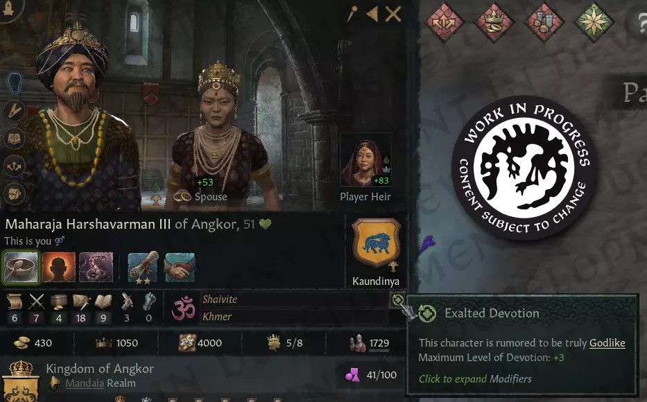 【1066年吴哥王国地图(包含朝贡国和附庸国)】 从平衡角度来看,曼陀罗政体的设计初衷是为玩家带来新挑战。如下文所述,曼陀罗政体初期实力较弱,尤其与同等规模且持续强大的封建制或氏族制统治者相比。但如果你能克服初期困难,通过数代人的努力,就能达到前所未有的权力高度——前提是你要小心维持自身的神性,并为继承人做好相应准备…… 神力模式? 如前所述,曼陀罗政体以信仰为核心,因此,虔诚值将是曼陀罗政体的主要资源。 建造首个曼陀罗首都寺庙群?主要消耗虔诚值。 指定神圣继承人?消耗虔诚值。要让你周围的人相信你确实是一位他们应该奉献生命和王国去追随的神圣存在?……好吧。那就积累虔诚值吧。还有虔诚等级!