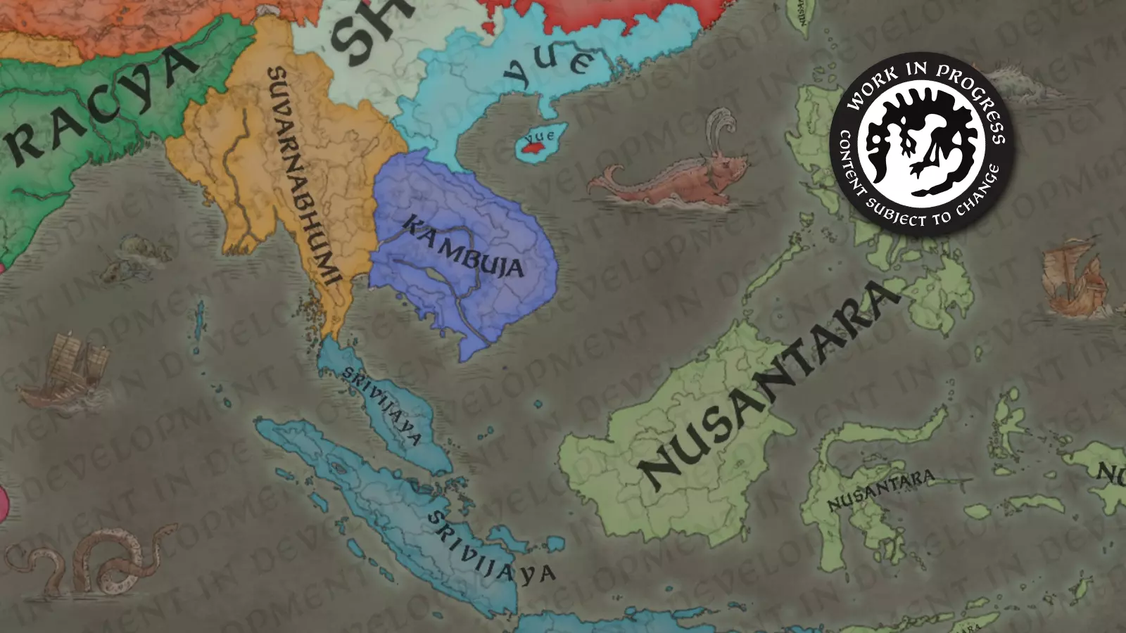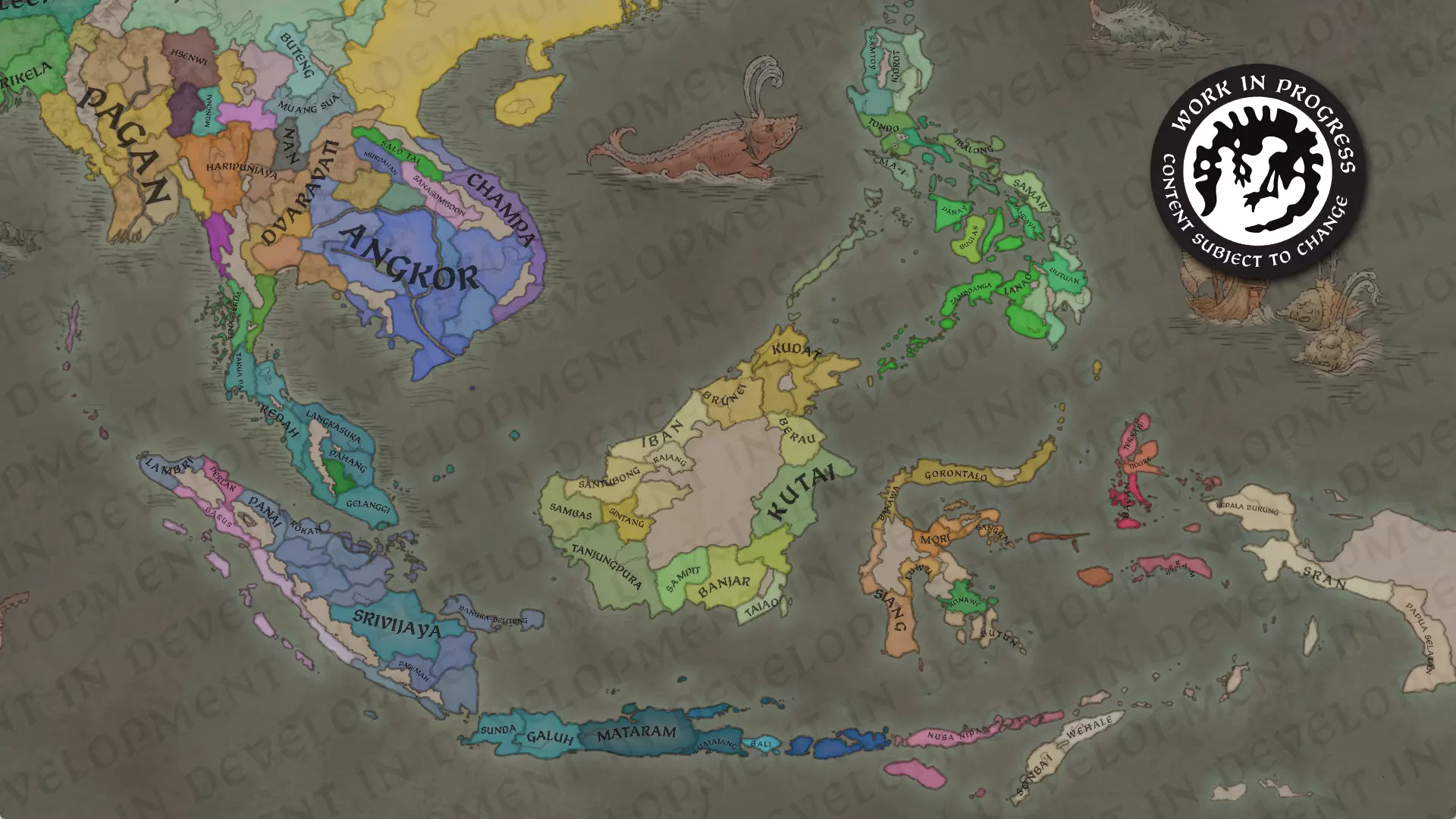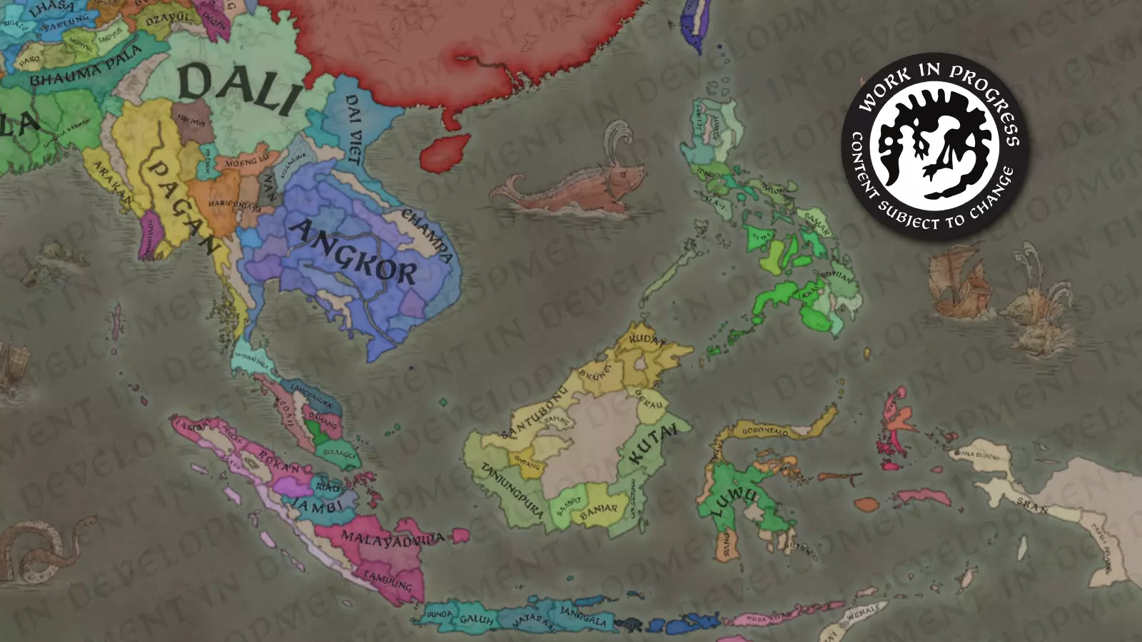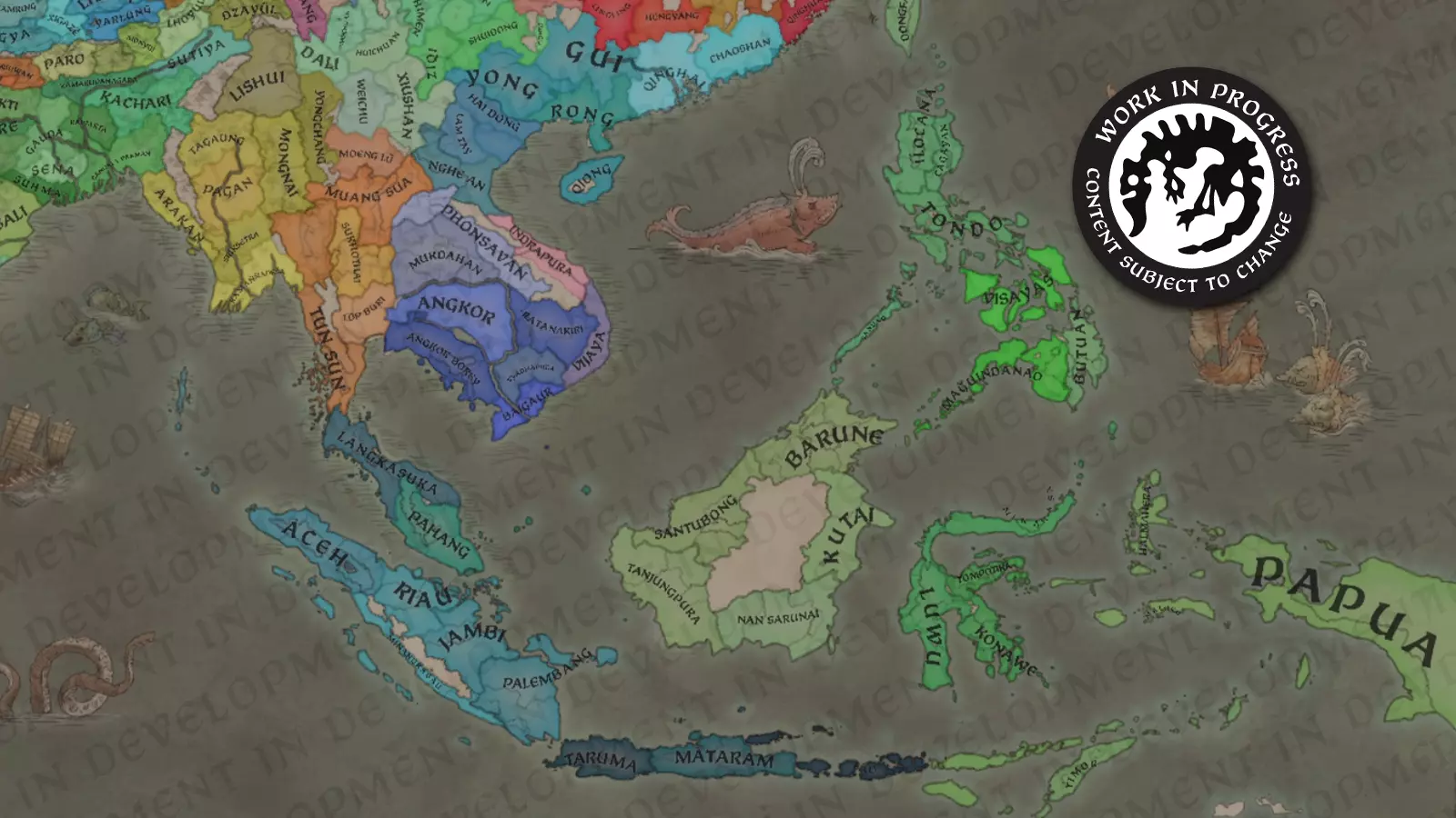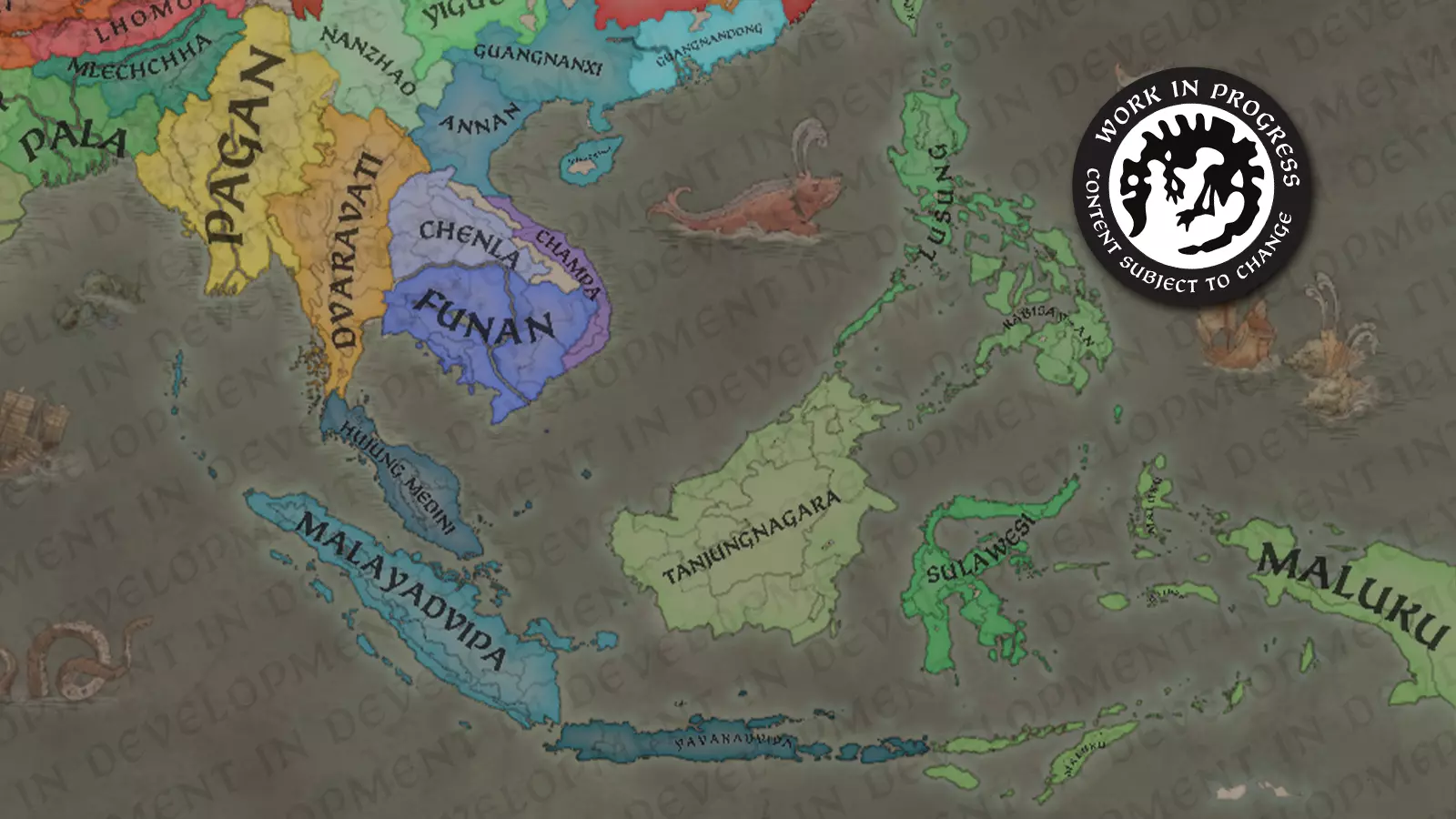 大家好!我是@Trin Tragula,来自黑工作室的设计负责人之一。在《天下一统》的第三篇区域特色日志中,我们将聚焦东南亚地区,重点介绍全新的曼陀罗和瓦努阿政府类型,以及我们如何通过这些设定来突出该地区的独特之处。我们还将介绍新的伟大工程特色,以及在这款资料片中如何处理朝贡国;虽然朝贡国系统在《草原可汗》中已被引入,但对于这些定居国家而言,其运作方式将有所不同。 场景:中世纪的东南亚 在我们的时间线中,该地区与北方的中国有很大不同。这里极其多样化,拥有众多不同的信仰和文化。