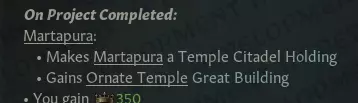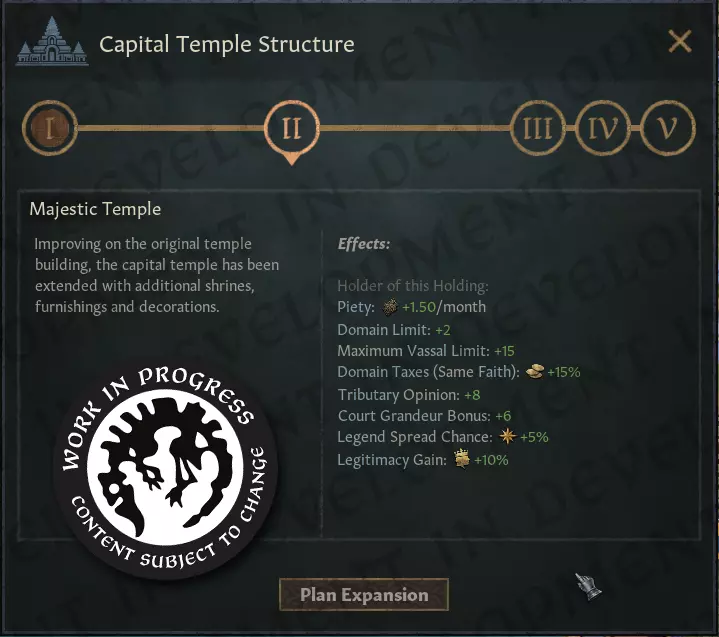 【首都寺庙群】这一伟大建筑的建造详情包含5个等级。当然,只有曼陀罗(Mandala)能够享受此类建筑的效果。若你不再是曼陀罗,或该建筑被封建或部落异教势力控制,它除了可能作为旅游景点外,将不会有太多用途。