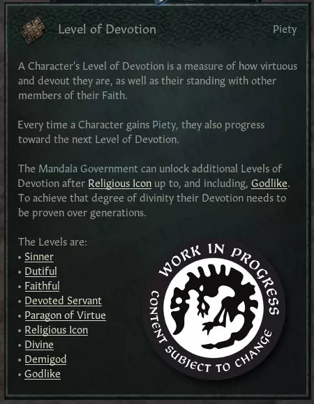 【虔诚等级提示文本,包含额外的虔诚等级】曼陀罗政府与信仰、宗教及神性深度交织,因此拥有三个独特的额外虔诚等级:神圣、半神和神级。你可能会问,如何达到神级?答案很简单:这是历经数代证明的神性。