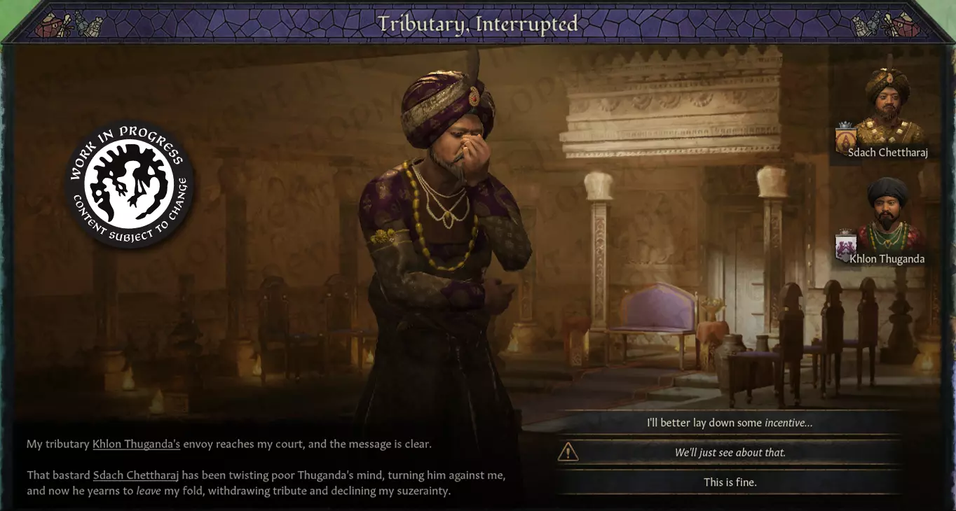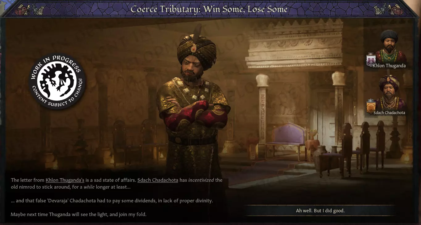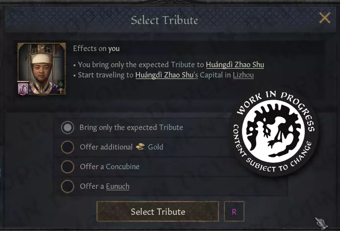 [Image of the Select Tribute character interaction for a Hegemonic Tributary] Once you’ve decided what kind of tribute you’re offering, you set off on a journey towards your Suzerain's capital! Upon arrival, you are greeted by the Suzerain (if they have a Royal Court, you are received at the Court), where you exchange gifts. First, the Suzerain receives your gift, and you may attempt to influence what the reward will be - or you leave it up to the discretion of the Suzerain. Similar to the type of tribute being offered, the type of reward the Suzerain may choose between vary depending on if you're a Mandala or the Emperor - a handful of options might be to: Award them with additional Trade Posts that increases the development of the Tributary's capital Award them with an artifact for them to bring back and display to their people Award them with a monk, to mend their heathen ways (for Mandalas to give to their tribal tributaries who are still unreformed) You start traveling back home once you’ve received your reward, eager to showcase the gift and enjoy the legitimacy you received from your tribute. Now I will hand the word over to @lachek, who implemented the Hegemonic / Celestial Tributary types. Hegemonic Tribute Missions Hello again! @lachek here, and I'm excited to once more discuss Tributaries with you! As mentioned above, tributaries were first introduced into Crusader Kings III to support nomadic gameplay with Khans of the Steppe, where they modeled the unique subject-overlord relationship between a tributary and their suzerain. On the vast expanse of Northern Asia, nomadic tributary relationships were mostly held together through military domination, either implied or by actual display of force. Nomadic rulers can demand that neighboring realms fall in line under them by building up a sizable horde, or simply go out and enforce it through warfare. Through a cascade of such relationships, enormous swathes of the plains can be held together under a single suzerain. However, they can collapse just as quickly due to migratory patterns or a foreign conqueror cutting off a key part of the chain. We also implemented a Subjugated Tributary type available outside the steppe to represent rulers dominated by more powerful neighbors and made to pay tax to their overlord. However, none of those types adequately represent how tributary relationships functioned in either Southeast Asia or China. Therefore, we are introducing both Mandala tributaries and the Hegemonic/Celestial types (more on the distinction later), where the relationship is more contingent on one-sided respect and a gift economy. Celestial Tributaries These are realms within China's sphere of influence that recognize the Emperor as the Son of Heaven and pay him a great deal of personal respect (not to speak of material wealth). In return, they are granted recognition and sovereignty by China. Unlike tributaries on the steppe, this is not primarily a military arrangement but rather a one-sided show of deference, ultimately serving both parties in the end. This relationship can be established by either party through character interaction, but is typically initiated by the prospective tributary themselves. Once established, the tributary has few immediate obligations: a little bit of Prestige and perhaps some Gold, in exchange for which some of China's Legitimacy is conferred upon them. It's usually a beneficial arrangement for both parties, especially since any taxes paid by the tributary goes directly into the Emperor's personal coffers rather than into the treasury. This makes it one of the few sources of direct income the Emperor has available for his own discretionary projects. Over time, the Emperor may decide to impose further standing obligations on some of their tributaries. Any increase in taxation or prestige transfer also comes with closer ties to China, however, thereby increasing legitimacy for the subject. However, Celestial Tributaries are also expected to Kowtow to the Son of Heaven on a regular basis, bringing immense riches and gifts with them to reaffirm their deference and respect. This is fundamentally the same kind of Tribute Mission as in Mandala realms, with a few modifications. Unlike in Mandala realms, the Chinese Emperor always has some minimum expectation regarding the size of tribute, depending on the esteem in which the tributary is already held. This is tracked by a metric we call Imperial Grace, which serves several purposes: It acts as a timer on how frequently you are expected to pay tribute; if you're only able to bring the bare necessities and wait until the last moment to reaffirm your respect, the Emperor might start to demand more frequent visits. Highly successful missions give you a longer grace period until your presence is once again expected. It gives you an opportunity to adjust your relationship depending on what kind of tributary you want to be. Do you pay only nominal respect when absolutely required, just so China will overlook you when assessing their borders? Or are you a devoted subject looking for a closer relationship? The decay rate of Imperial Grace increases during unstable periods of the Dynastic Cycle, reflecting the uncertainty of these times. Will you contribute to sustaining the ruling dynasty of China's legitimacy during troubles times, or seize on this moment to break the agreement and try to claim a piece of the pie for yourself? As a Celestial Tributary you can quite readily adjust your own tributary contract's obligations, but changing it in your favor costs an amount of Imperial Grace. Finally, at very high levels of Imperial Grace, the Emperor might decide to make China's relationship with its subject more permanent through the granting of a Seal of Investiture. This is an enduring artifact (regalia type, which can be reforged into a court artifact if you wish) that gives access to special privileges not usually available to subjects of China. Trade Acces