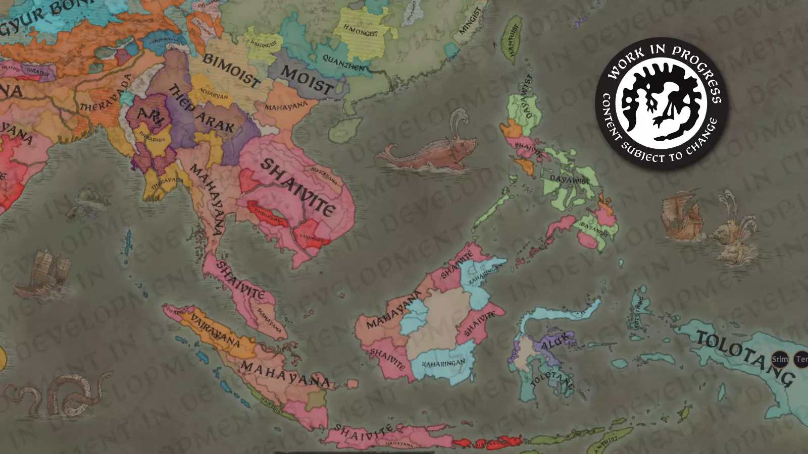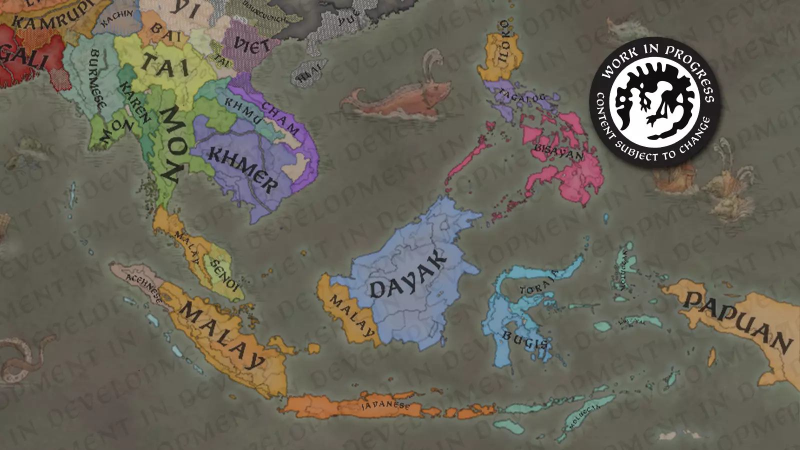 在文化方面,该地区在许多方面更加多样化。值得注意的是,泰族仍主要分布在其北部地区。从历史上看,该族群的分支曾在大陆许多地区占据政治主导地位,从现代的老挝和泰国,到印度北部的阿萨姆邦(地图上标注为“Kamrupi”的区域)。 从游戏玩法角度来看,在文化数量上取得过多或过少之间的平衡从来都不容易,但在世界的这个地区,这可能尤其困难。我们在这里展示的内容,比我们通常的目标既更简化,又更碎片化。