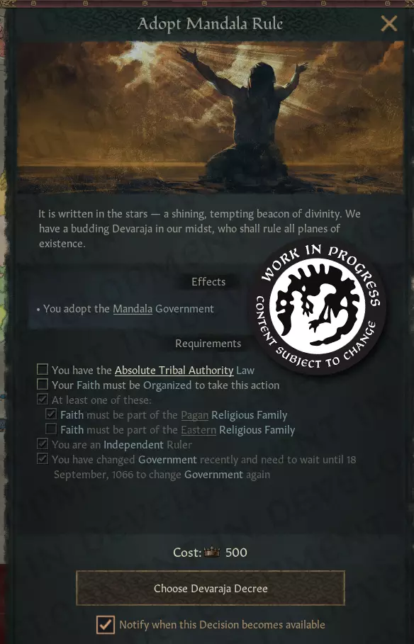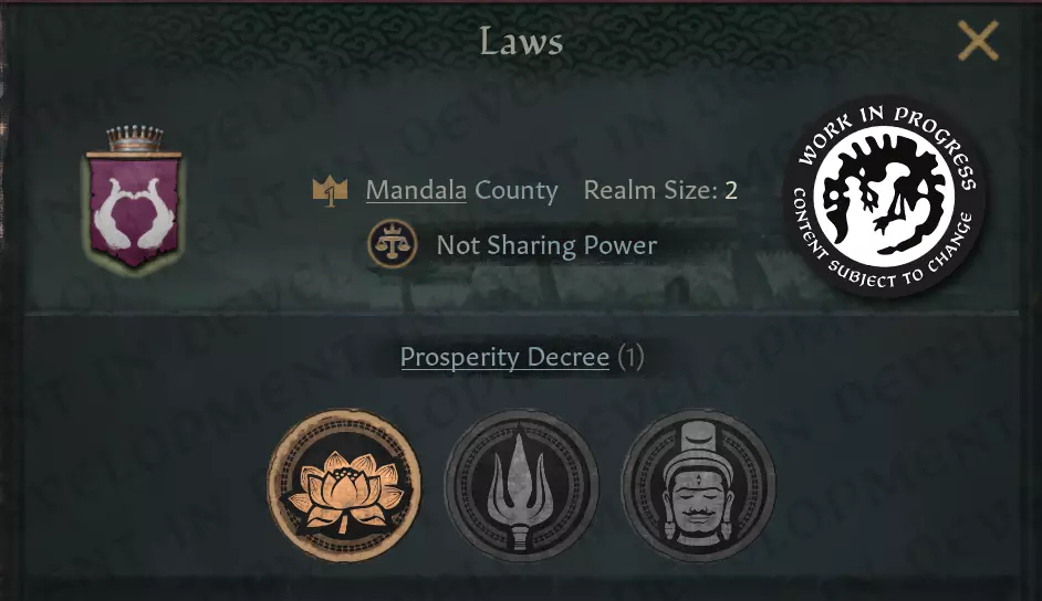 【曼陀罗】的开发中地图模式,显示谁可能接受纳贡提议。 神圣光辉应极大影响该地区的小统治者愿意向谁宣誓效忠。如果当前宗主被认为不虔诚,他们甚至可能离开,转而加入更具吸引力的转轮圣王。 我颁布… 与神相相比,法令提供了更灵活的王国统治方式。那么,神圣的统治者啊,您将颁布什么法令?