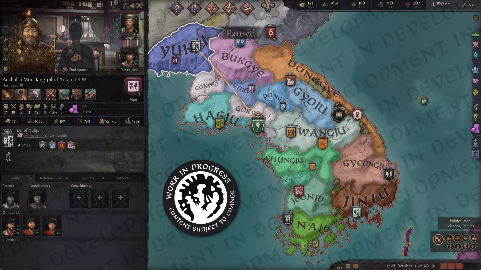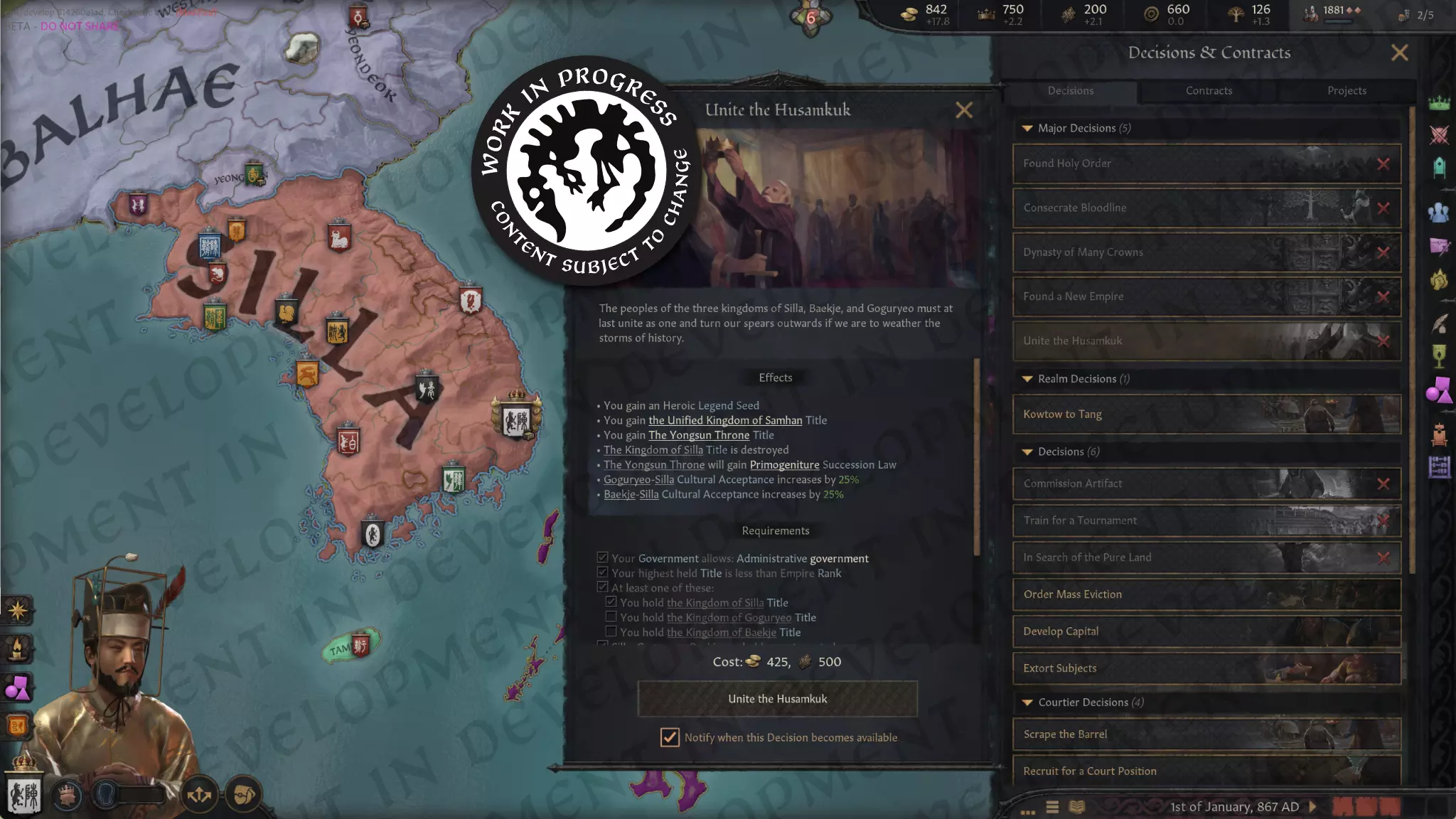 【867年的统一新罗与“统一后三国”决议,相关美术资源仍在制作中】 我们通过一项特殊决议“统一后三国”来呈现后三国的统一过程。任何至少拥有其中一个王国,并以主导地位接管整个半岛的统治者都可采取该决议。此决议将废除旧王国头衔,并创建一个帝国级别的“统一王国”头衔,其名称会根据统一者的文化背景命名为“三韩”或“高丽”。这是朝鲜文化统治者形成朝鲜帝国级别头衔的唯一途径。 该决议还会创建“龙孙 throne”,这是一个特殊的长子继承制王国级虚衔,类似于日本的“菊花 throne”。此头衔的名称也可能因决策者的文化背景而有所不同,其中“龙”(Yongsun)源自高丽开国君主太祖大王的龙裔传说。此外,该决议会提高你的文化与其他朝鲜文化之间的文化接受度,从而更容易创建一种新的混合朝鲜文化,将新罗、百济和高句丽人民团结起来。